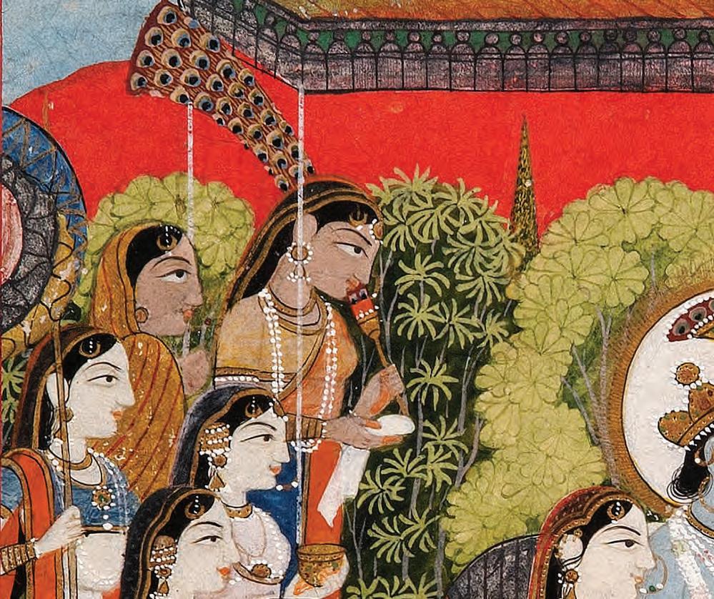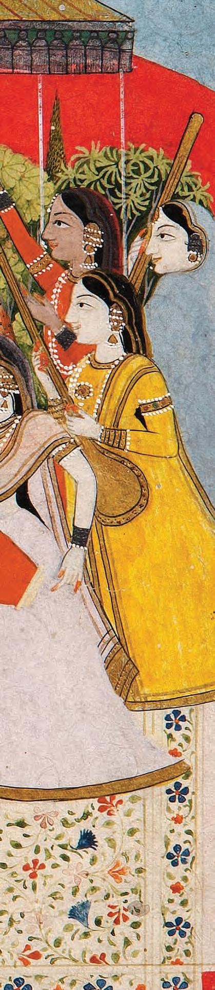 Purkhu is one of the master artists of early Kangra Painting. Active from 1780 – 1820, under the patronage of Maharaja Sansar Chand, he is respected for his brilliant execution of emotionally evocative processional scenes. “Purkhu saw individuals essentially as falling into types. ere is no insensitivity to appearances,