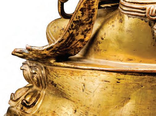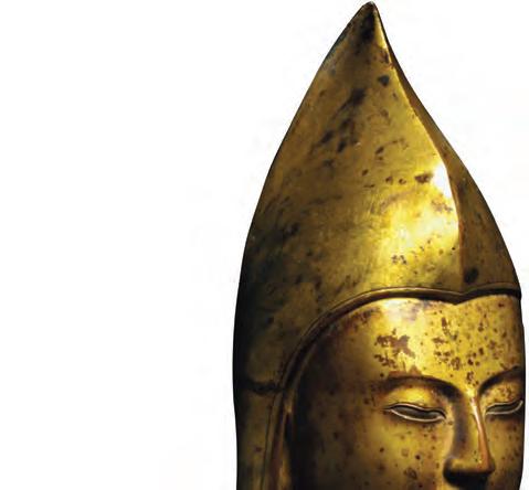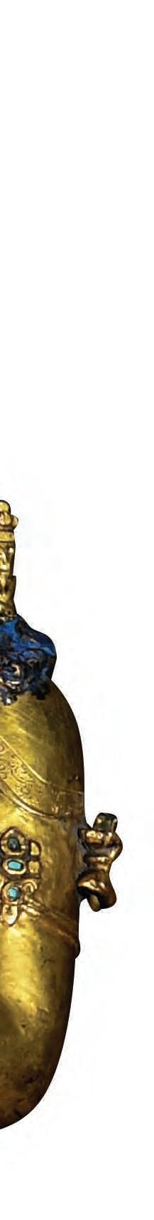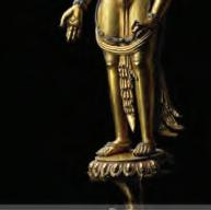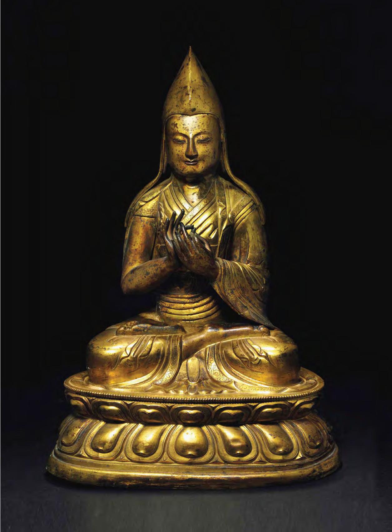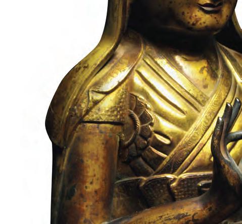 宗喀巴大師(13 7年至1419年)為 藏傳佛教格魯派(黃教)創始人, 在藏傳佛教中聲望極高,被視作文 殊菩薩的化身。此尊宗喀巴大師像 雙手於胸前結說法印,手指刻畫柔 軟逼真。頭戴尖頂通人帽,兩側冠 帶垂肩,額寬頤豐,雙眉細長,雙 目微閉,法相寧謐和煦。軀體端正 挺直,身著交領式僧衣,袒右肩, 是西藏僧人的典型裝束。衣著厚重 寫實,富有層次感。衣緣鏨刻清晰 花紋帶,做工精細。此尊宗喀巴結 跏趺坐於束腰雙層仰覆蓮座之上, 蓮瓣飽滿,瓣尖微捲,素雅大氣, 精湛的藝術手法完美地再現了一代 宗師慈悲智慧的精神氣質。