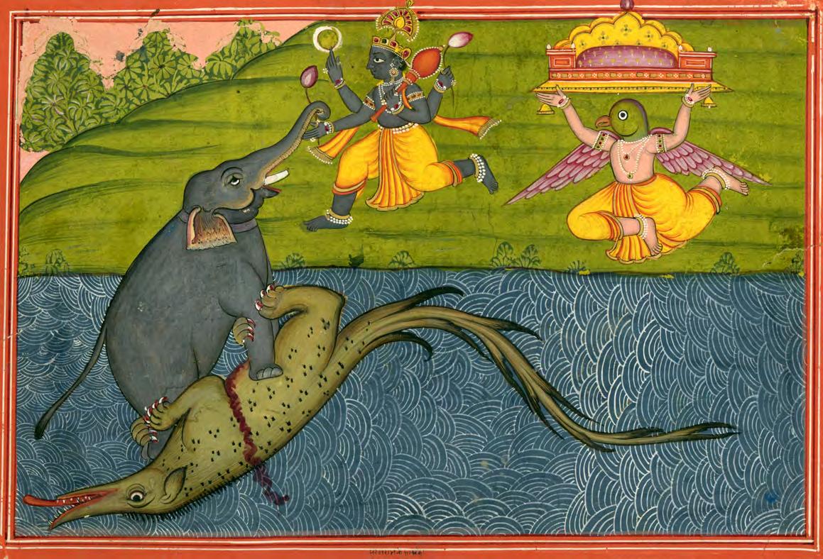 alongside Garuda, vanquishing the makara crocodile demon and granting moksha to Gajendra for putting his faith in Vishnu as savior.