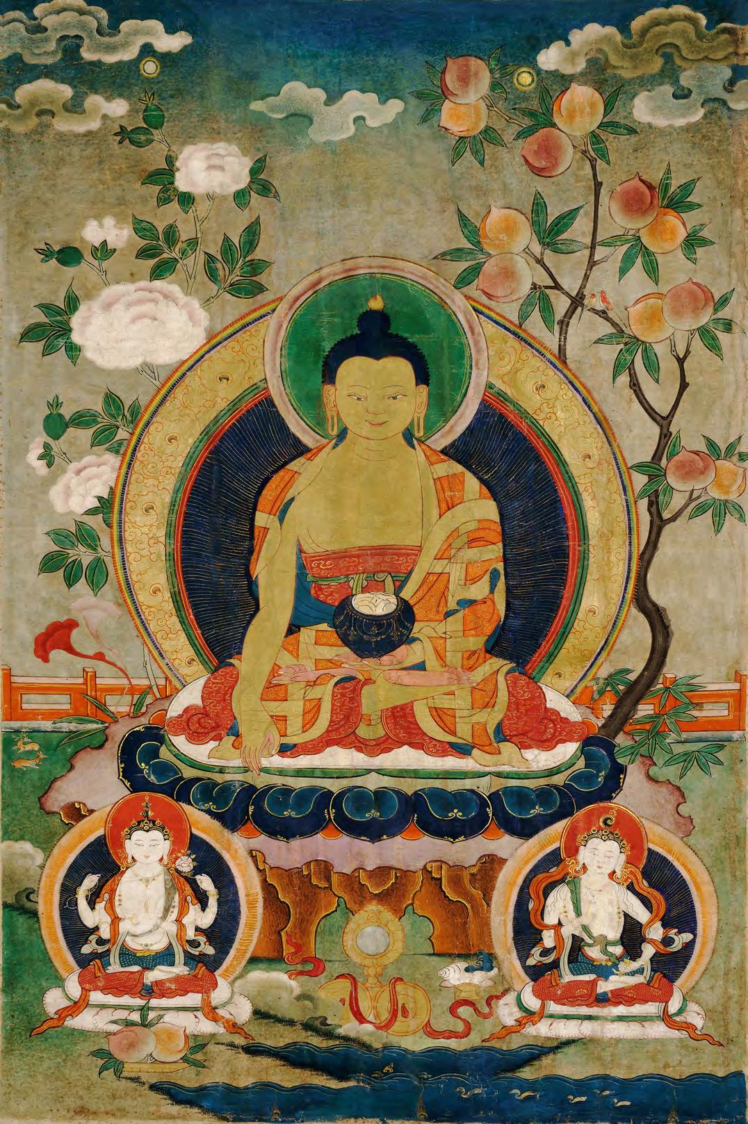 Vajrasattva is associated with the sambhogakaya and is invoked as a support for purification practices to dispel obstacles in tantric practice. The odhisattva is depicted here standing holding a vajra in his right hand and a ghanta in his left. The elaborate crown with beaded border is surmounted by a superbly rendered five-pointed crown. The broad, square forehead is offset by the gentle curves of the face. The hair, ile high o he he c c e o er he o er ll mo l e ho l er