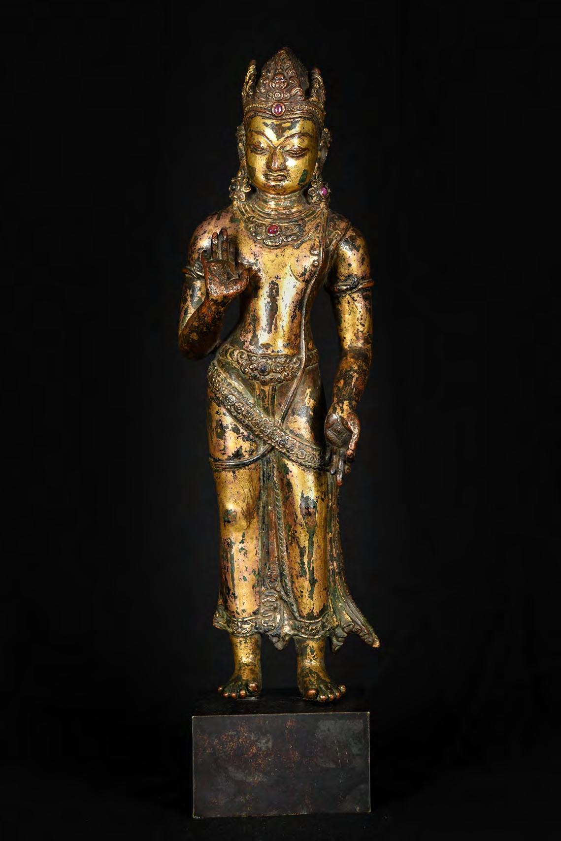 A Newari master most likely cast this rare and commanding sculpture while working under the patronage of a leading monastery in Central Tibet, possibly Shalu. This figure likely represents the Future Buddha Maitreya, but it could possibly be a depiction of Manjushri. Richly gilded and adorned with semi-precious stones, the treatment of the adornments, prominent chin, tresses across the shoulders, and modeling of the body are all consistent with the rendering of the Five Tathagatas in the South Chapel of Shalu monastery, painted in the second quarter of the 14th century.