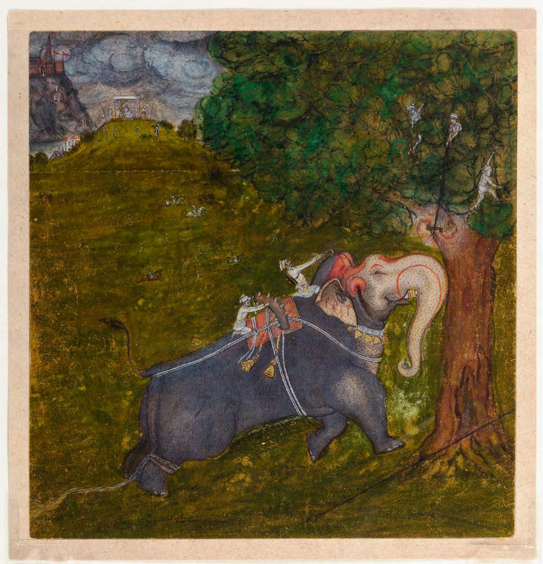 Typically, hunting scenes would be depicted with one or more men, who were occasionally accompanied by a maiden. While hunting scenes were popular with Kotah rulers, it is unusual to see such an image with only female hunters, devoid of their male counterpart. Compare this piece to an earlier painting in the National Museum, New Delhi, titled Ladies Hunting Tigers (accession no. 47.110/1919) that depicts a woman with her rifle trained on a Tiger from a hunting tower, a female musician and male hunter positioned behind her. In this work, the woman is shown at the forefront as huntress, and while the man is not engaging his weapon and stands out of her way, there is still a male presence overseeing the two women. The current painting depicts only women, making it an important representation of female status and capability that existed at the time. For further reading on Kotah school painting, see Stuart Cary Welch, , 1997.