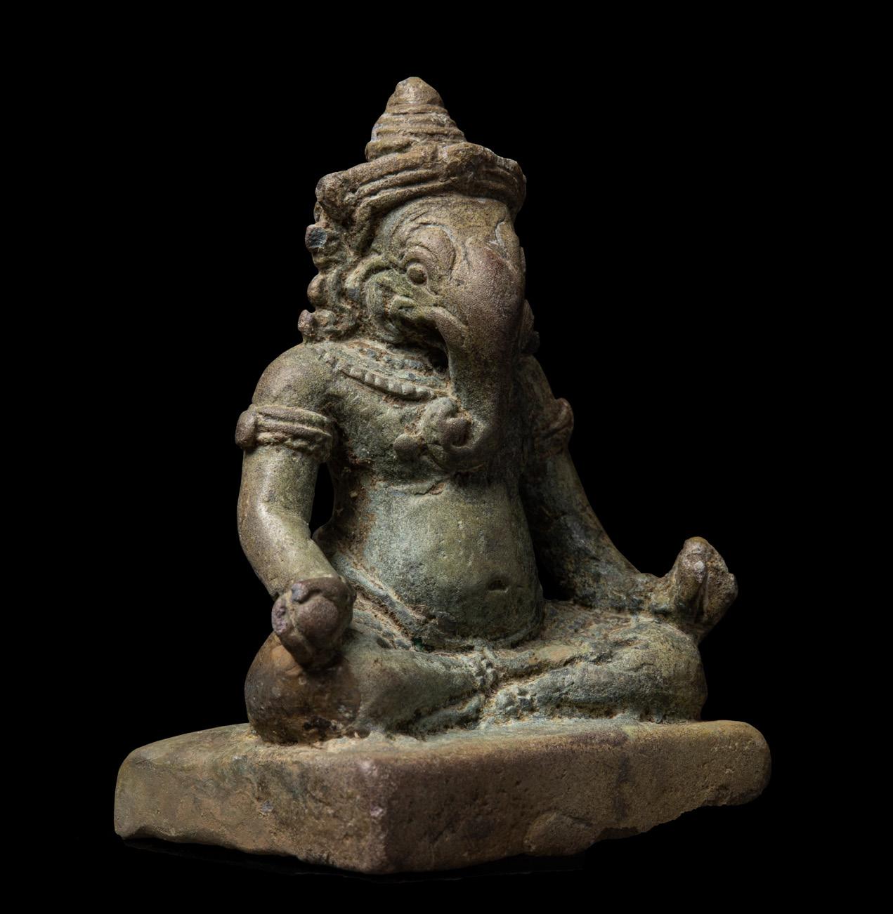 The present sculpture depicts the Hindu god Ganesha, elephant-headed son of Shiva, seated on a rectangular plinth. Executed in the round, his divine power emanates in all directions. The deity wears a sampot with butterfly sash at the reverse and is adorned with armbands, necklace, and a conical headdress. The ornamentation is characteristic of sculptures from this period; see the style expressed in another example at the Minneapolis Institute of Art for reference (acc. 99.216.11). Although some refinement of the present Ganesha’s detail has been lost overtime, the elegance of this product of labor-intensive bronze artistry remains.