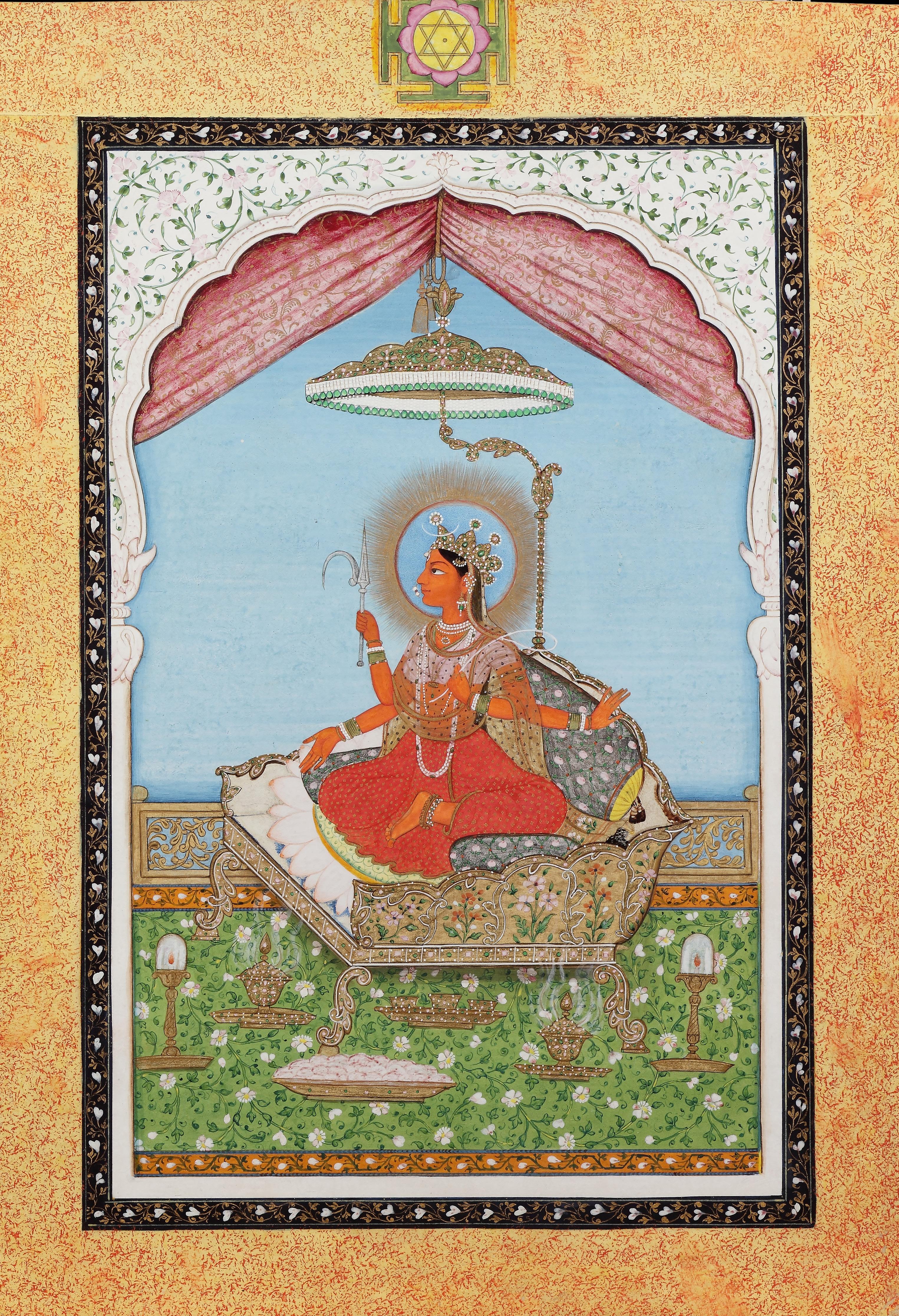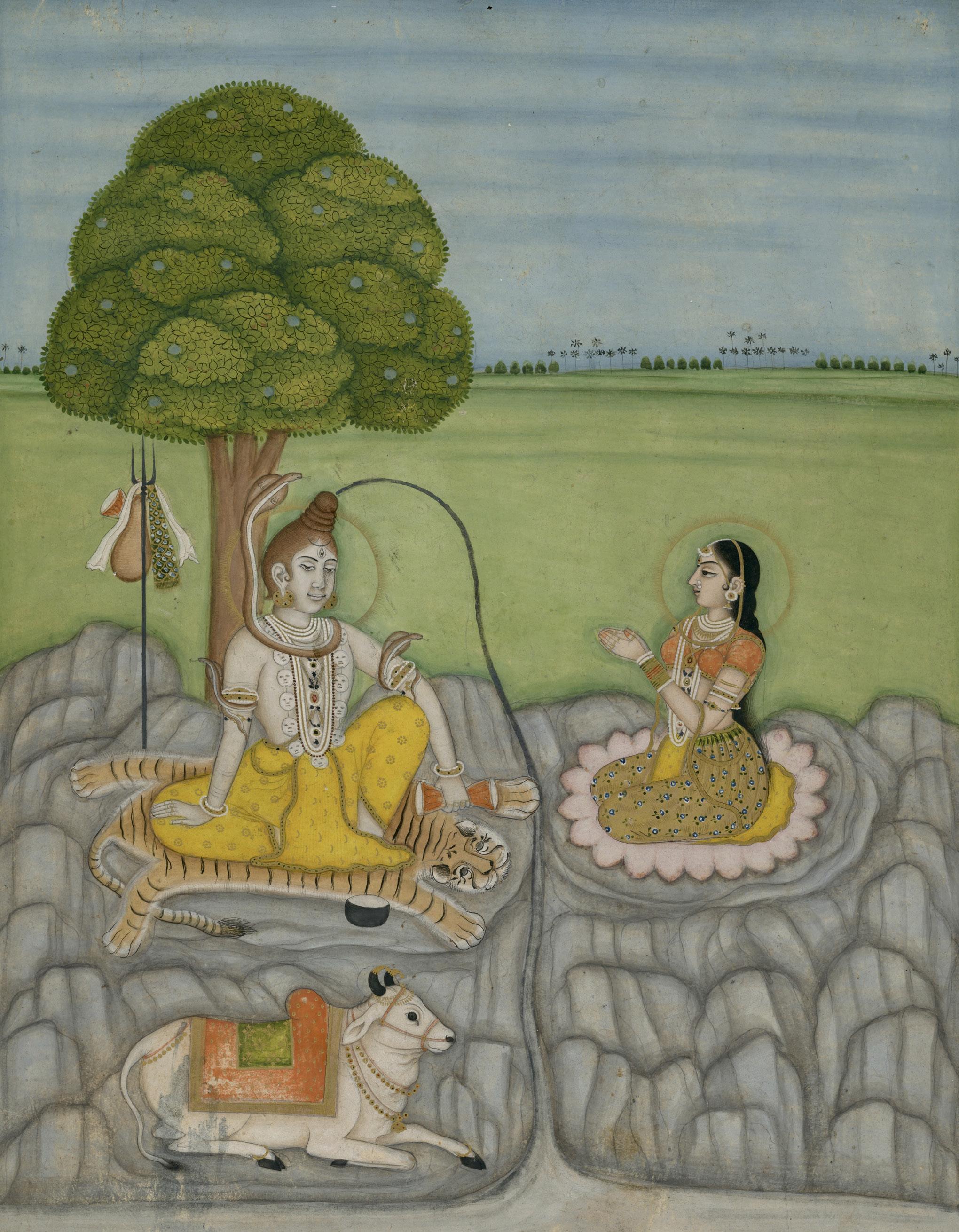 The present painting depicts Lord Shiva and Parvati seated under a tree atop Mount Kailash. An even line of trees and palms dot the horizon, dividing a clear blue sky and a vast expanse of green. Shiva, seated on a tiger pelt, is adorned with serpents which curl around his neck and arms. On his forehead is his third eye, topped by a crescent moon. From his piled hair flows the river of Ganges which splits the mountain in two. He is equipped with two damaru—a divine instrument which produces the sounds that create and regulate the universe—one in his proper left hand, and another hanging from his trident, along with pennants that billow in the breeze. Beside him is Parvati, seated upon a lotus flower. She holds her hands open in respect as she gazes upon her lover. Both she and Shiva have glowing nimbuses marking their divinity. Below the couple rests Shiva’s faithful vahana, Nandi, the sacred bull.