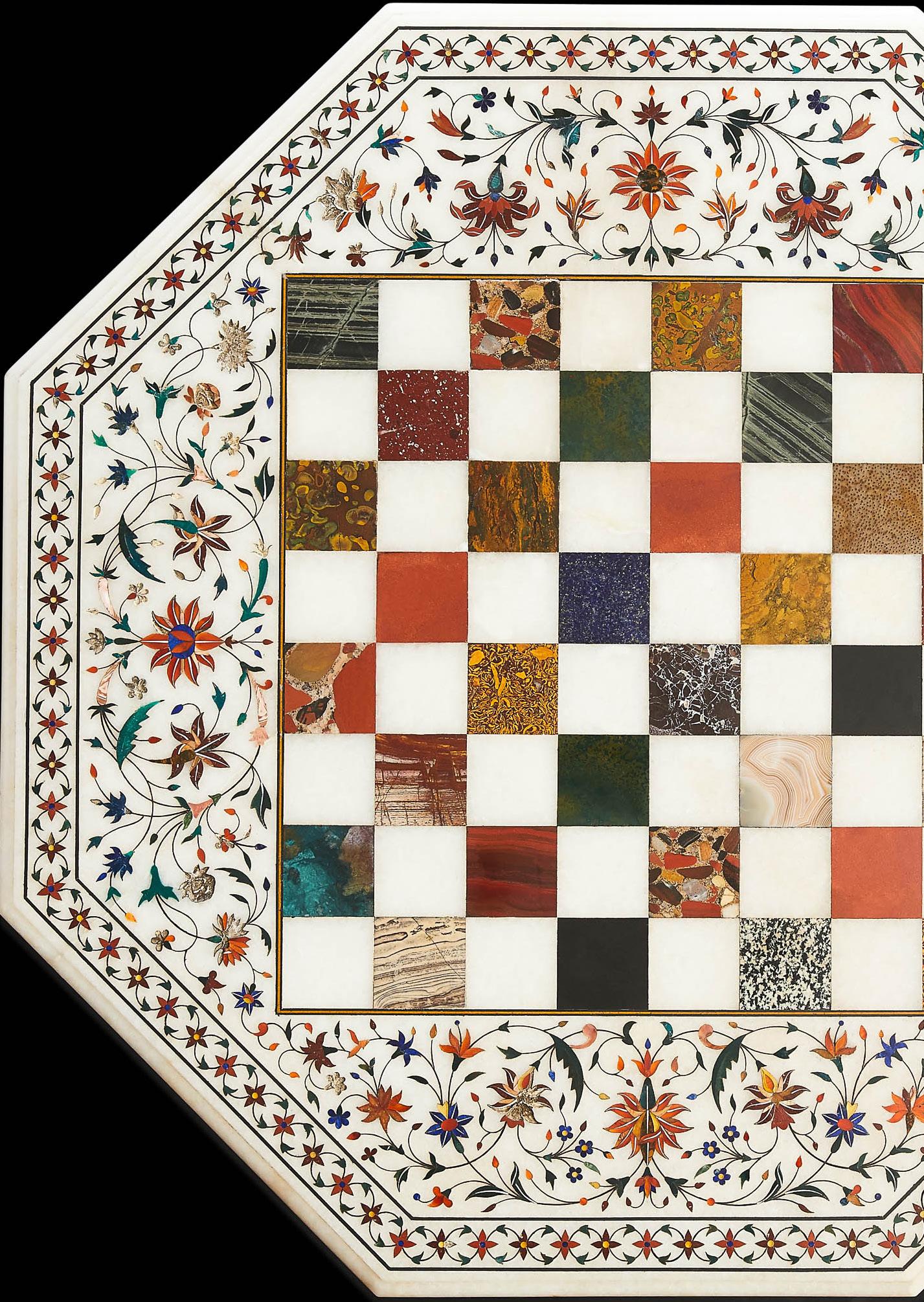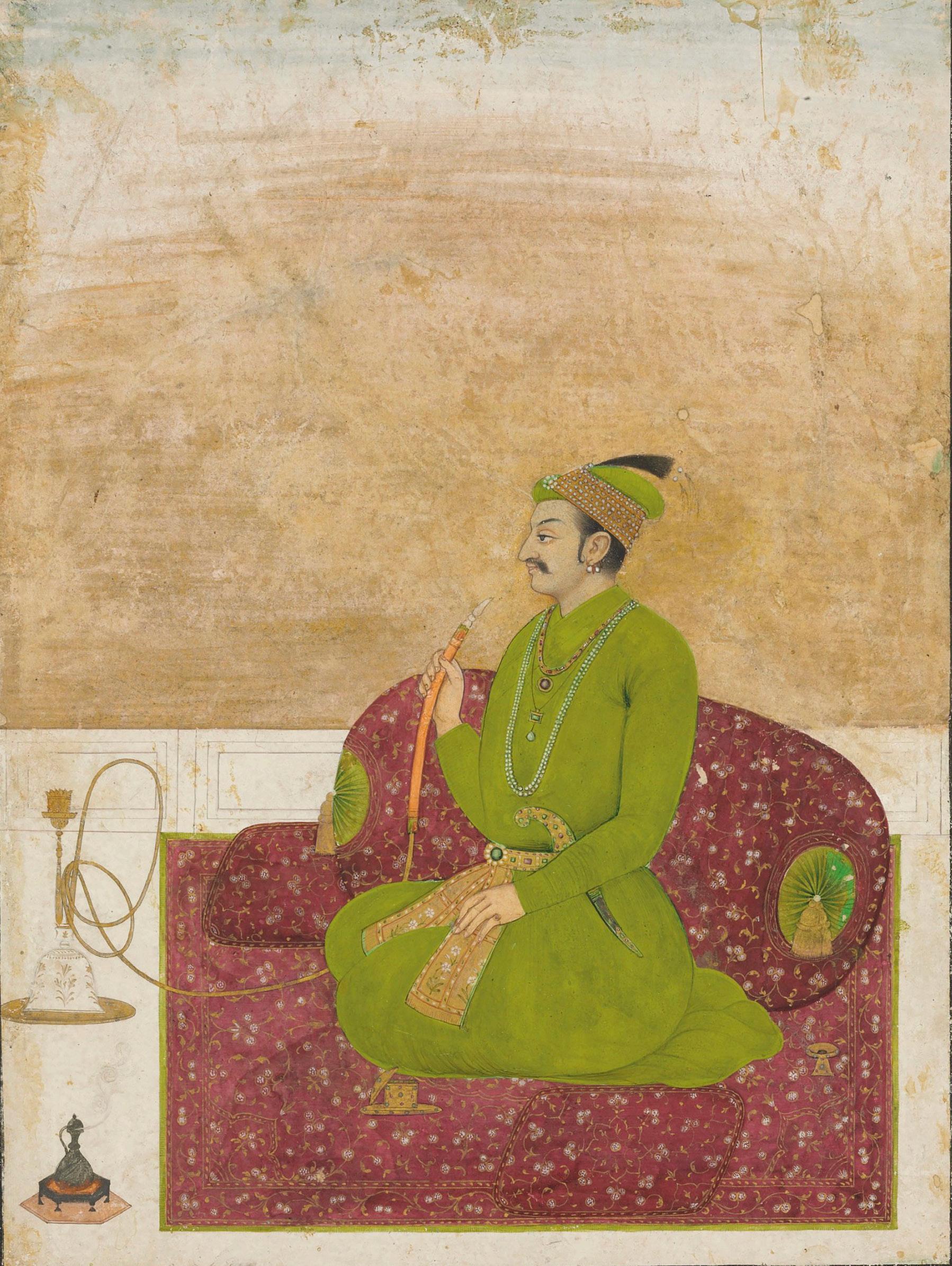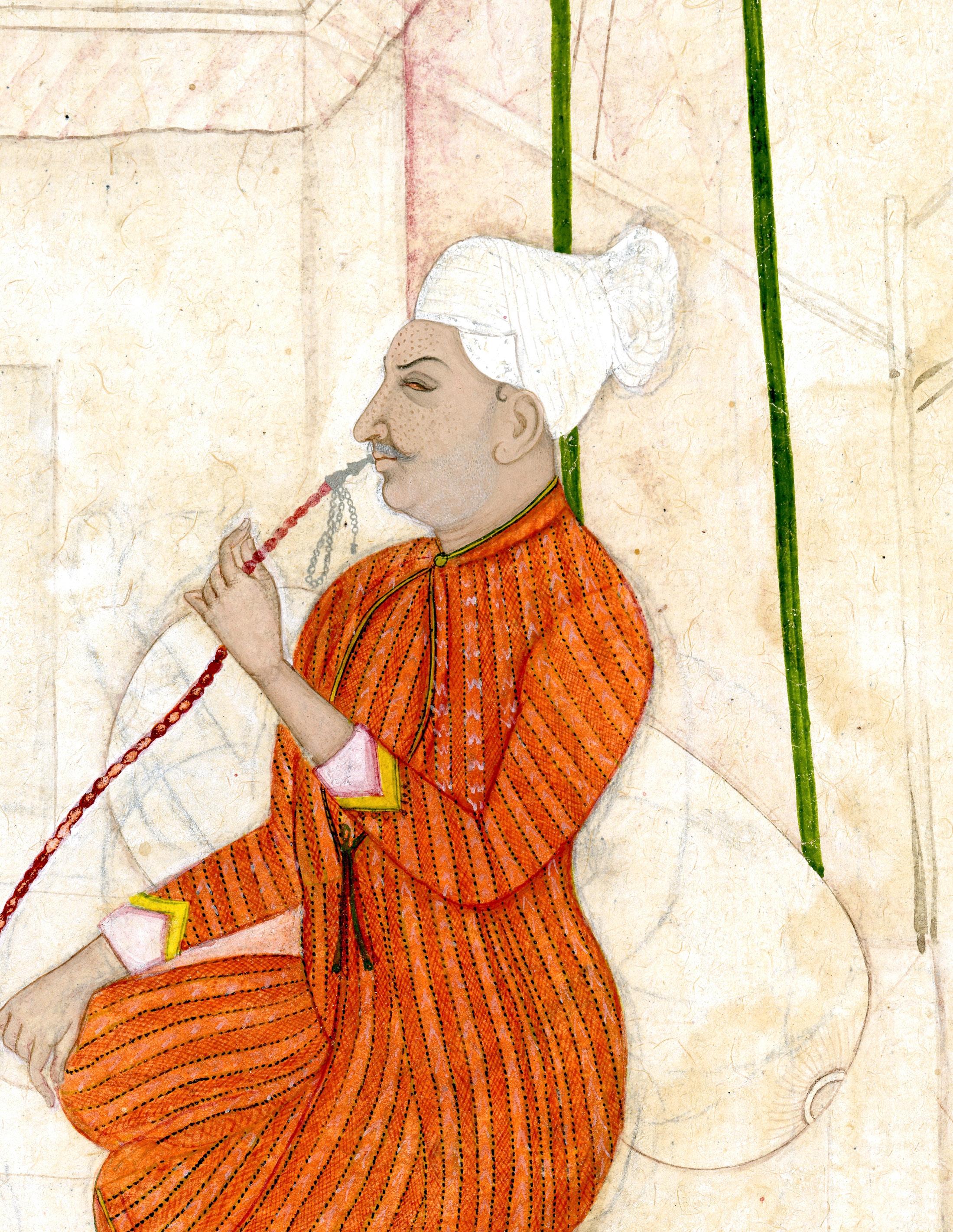 A light blue sky descends into a mossy green, where the background meets the horizon line of a marble terrace. Green and yellow honeycomb tiles atop the garden pavilion’s roof bring out the fluid streaks of golden clouds in the sky. Floral motifs fill the textiles and panels that decorate the pavilion as well as the large bed around which three elegant female attendants wait on a regal figure, hand and foot.