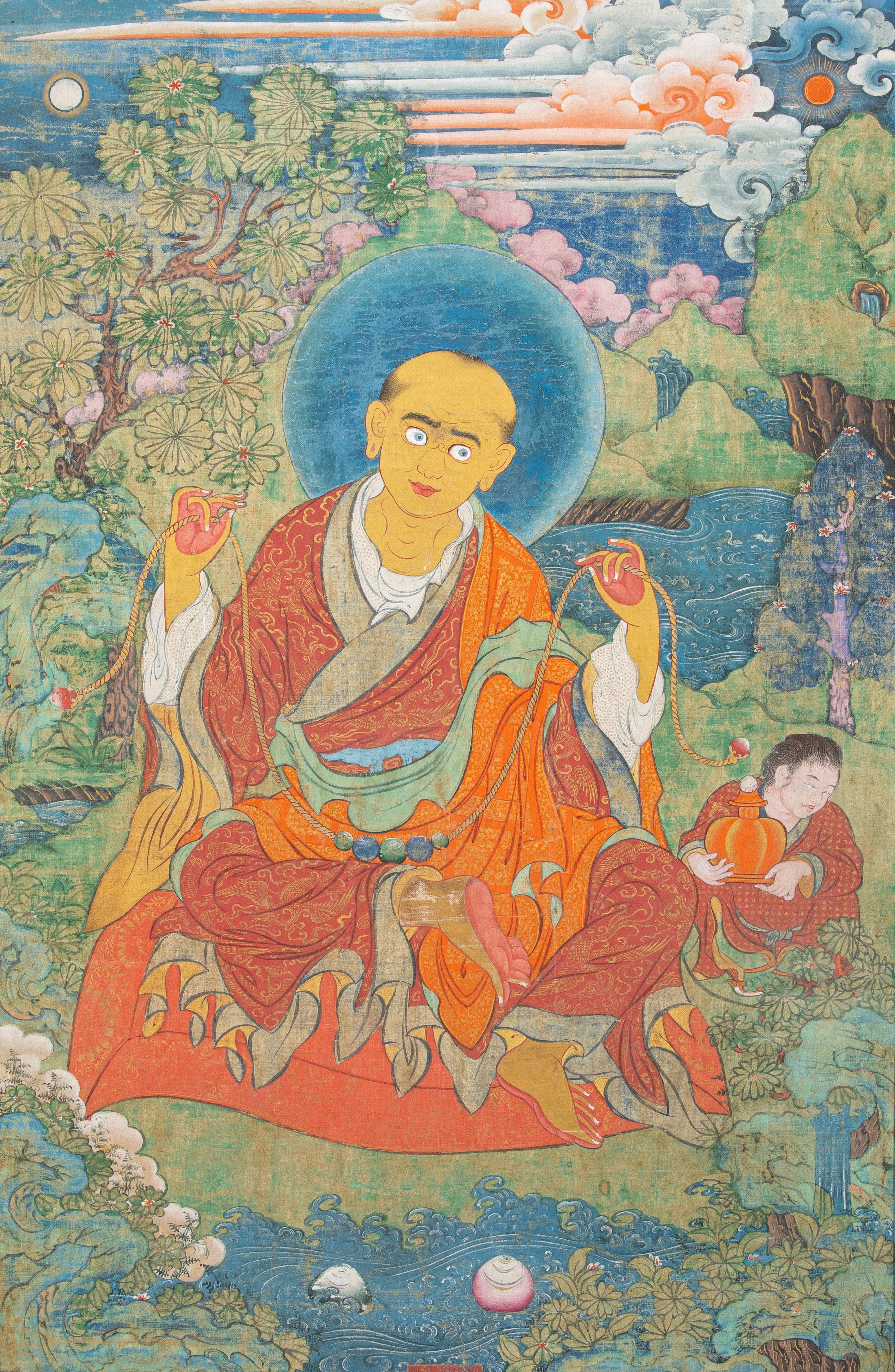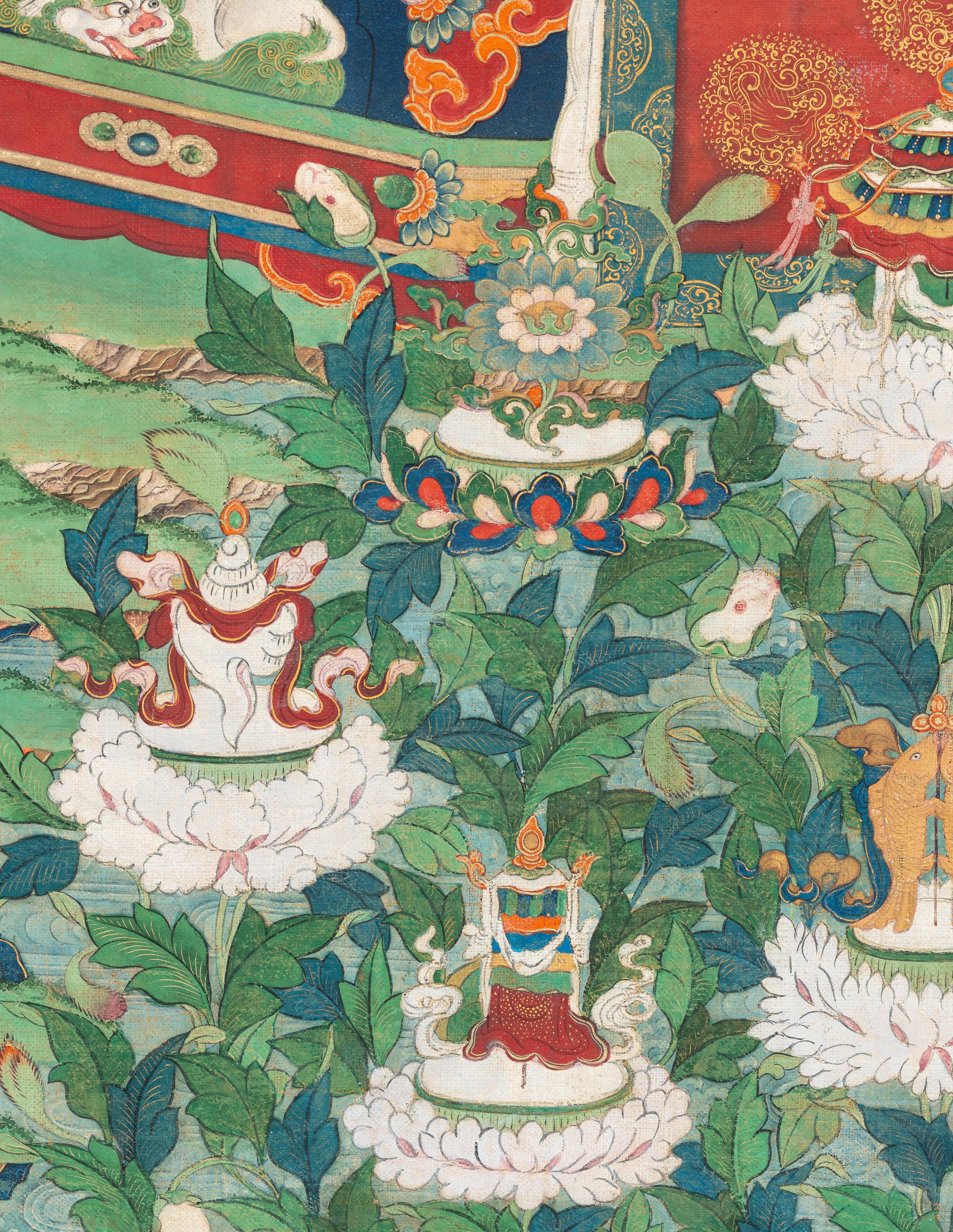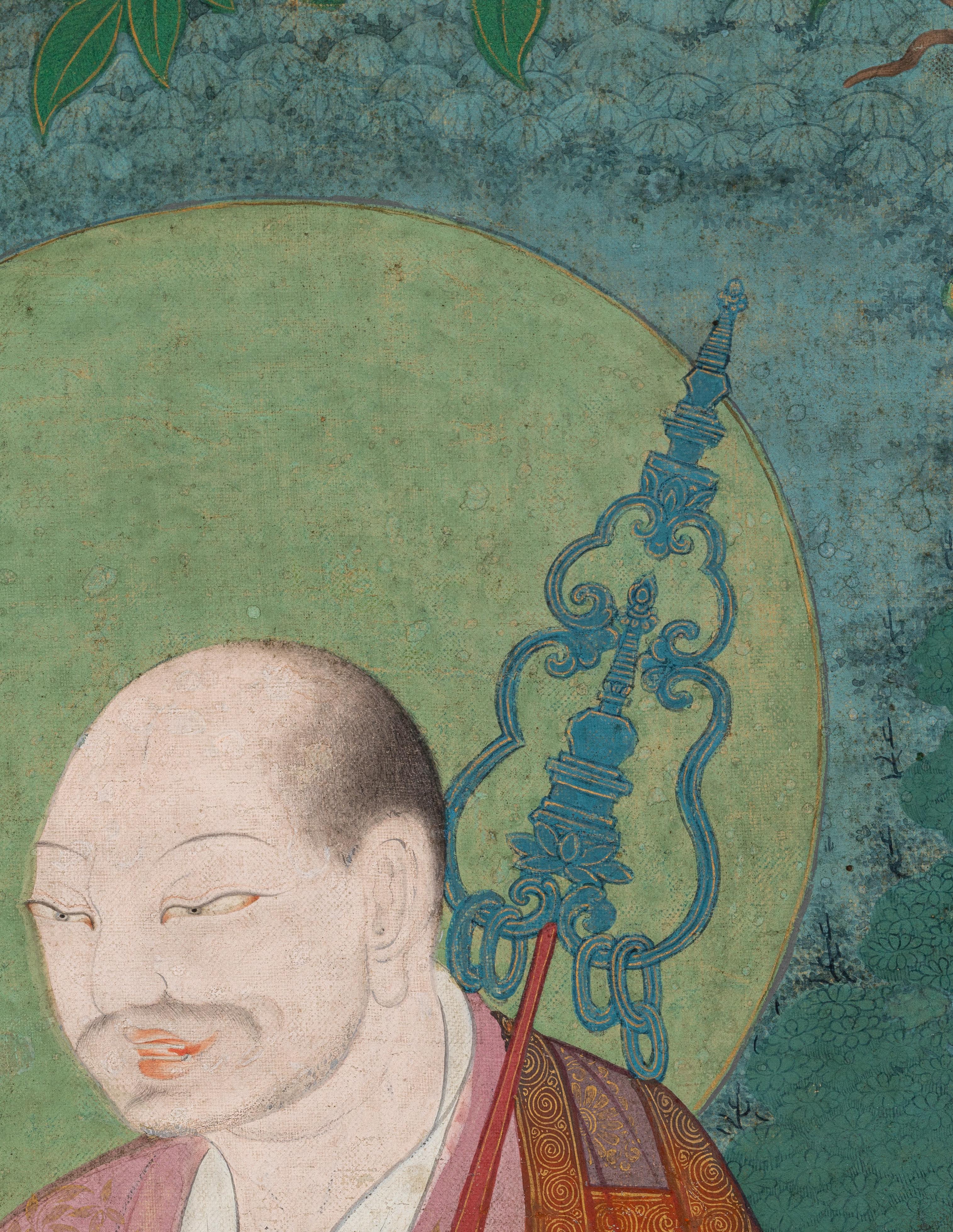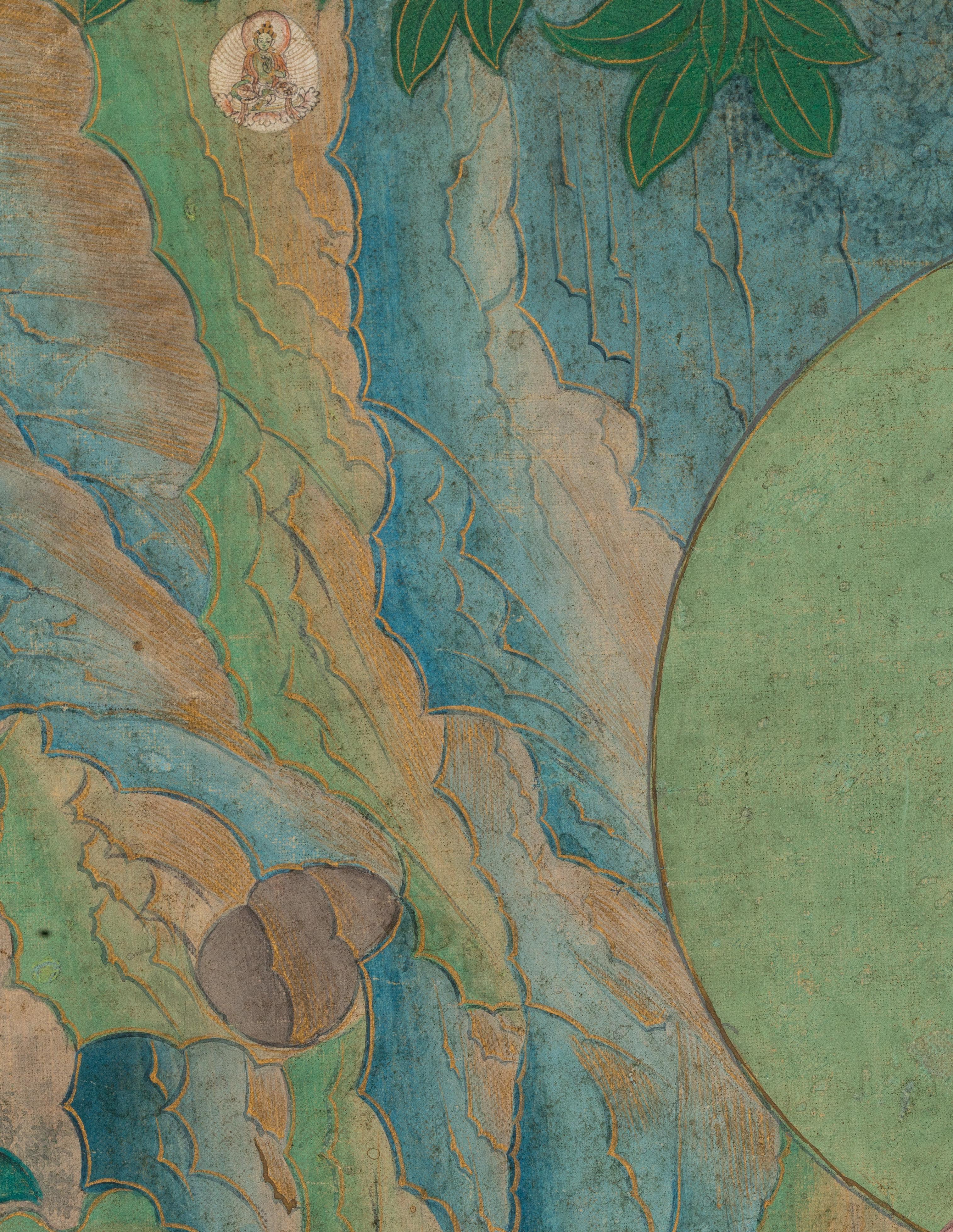 Nagasena appears enthroned atop a rock formation attended by a female figure offering jewels, a monk displaying the dharmachakra mudra, and an Indian mendicant with a precious offering. A very small apparition of Green Tara is depicted in a small radiating aureole, embedded within the craggy rocks behind the elder. These rock formations are one of many features within the present work which demonstrate great Chinese influence resulting from the historical practice of exchanging paintings between China and Tibet. Others include the aforementioned garments, the prominence and stylization of flowers, and lack of sky typically given great breadth in Tibetan paintings.