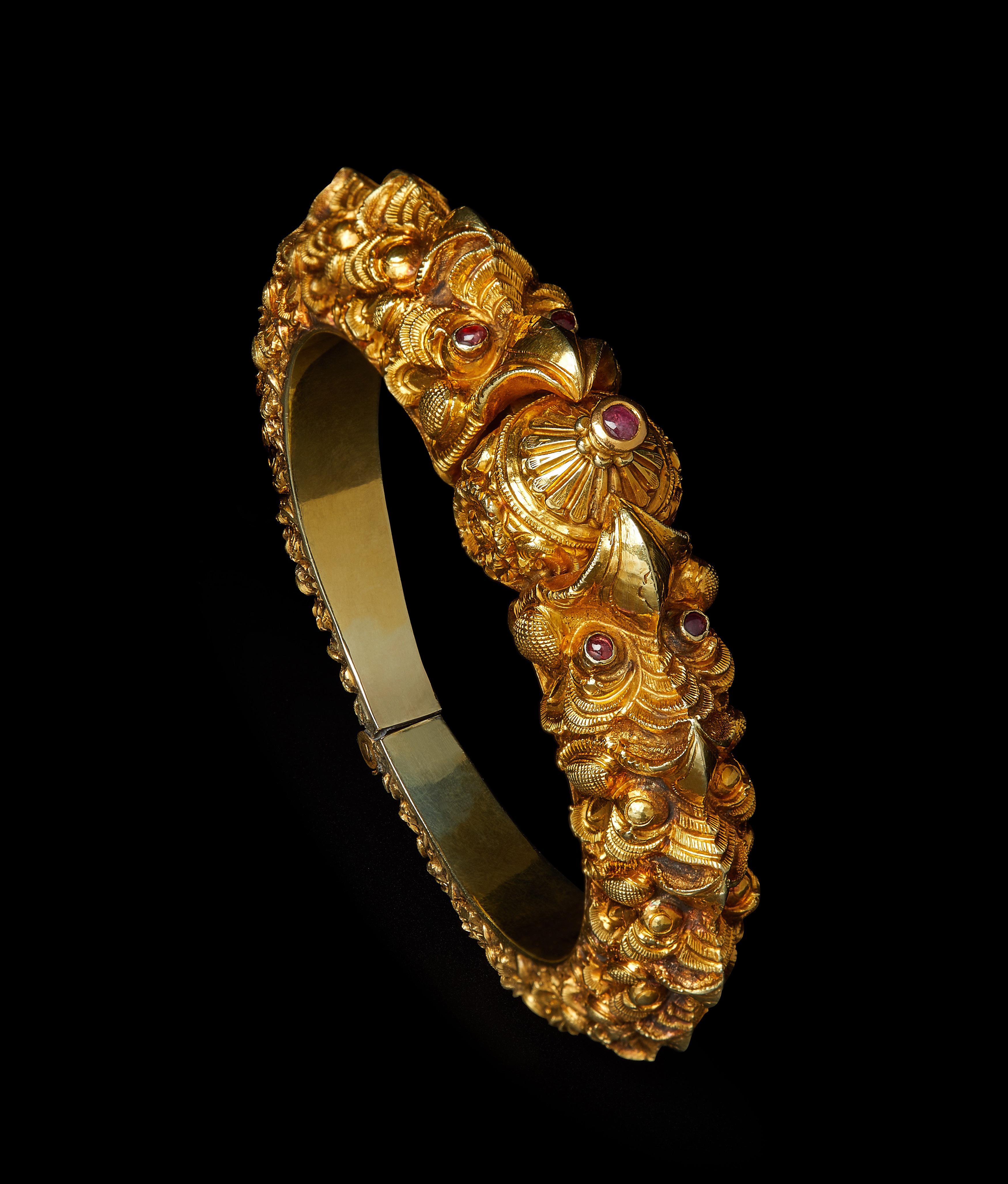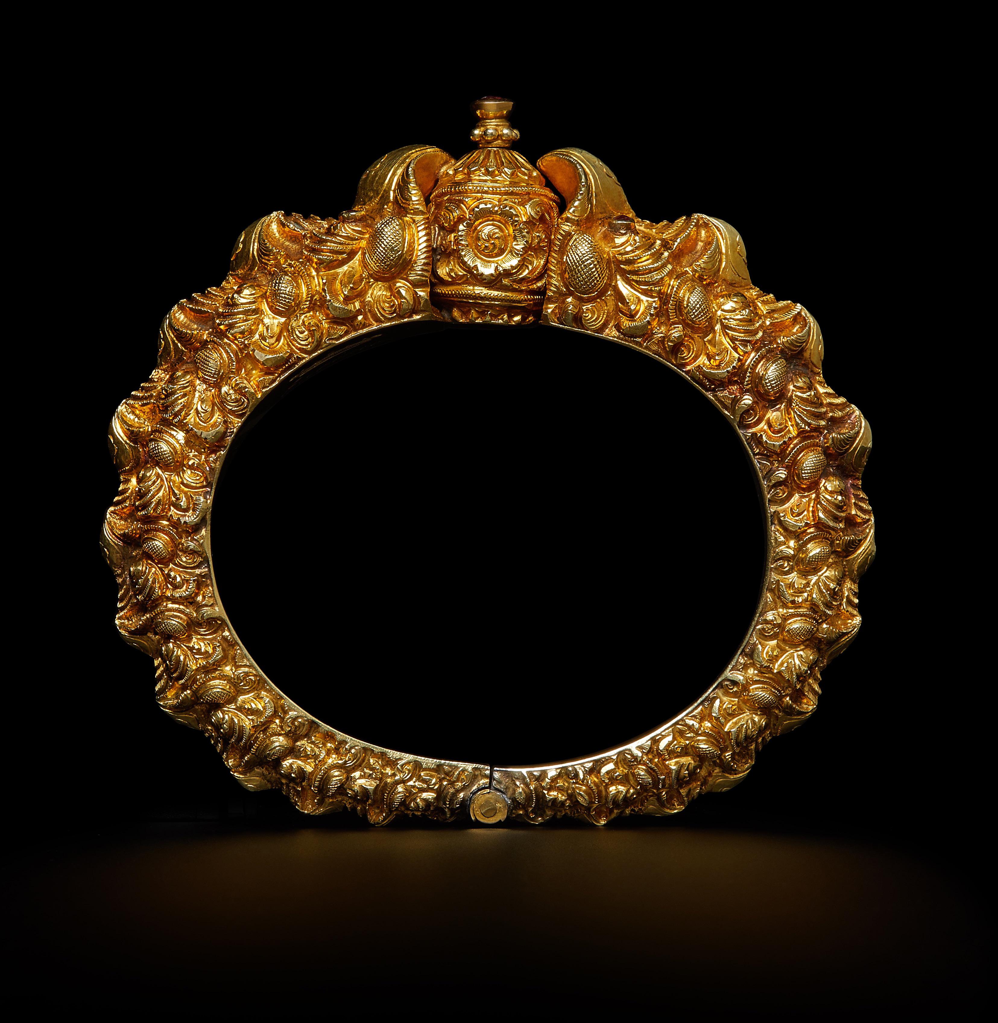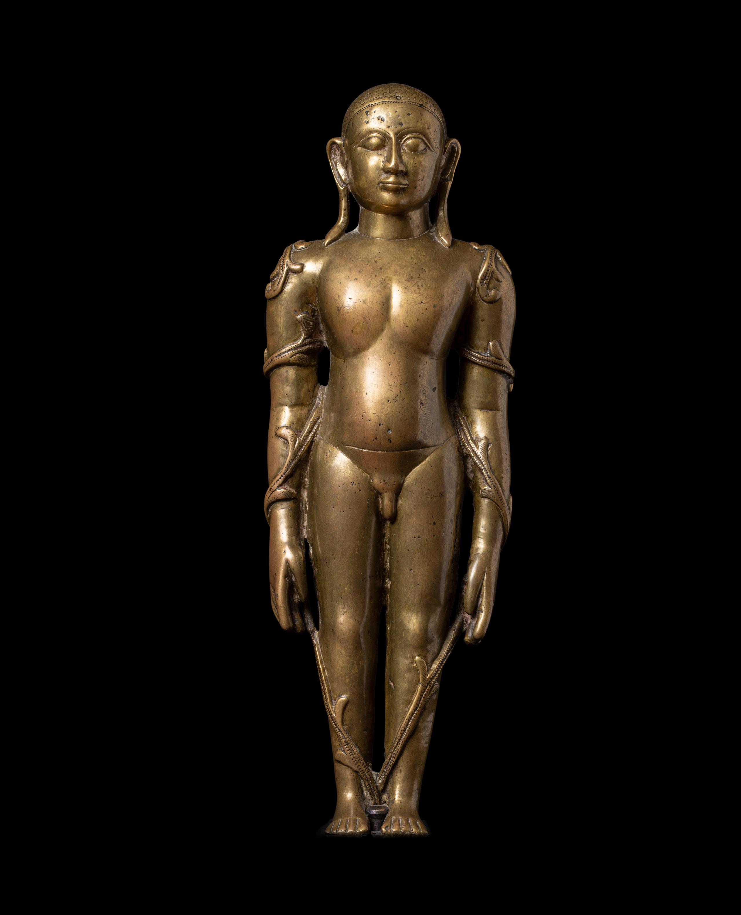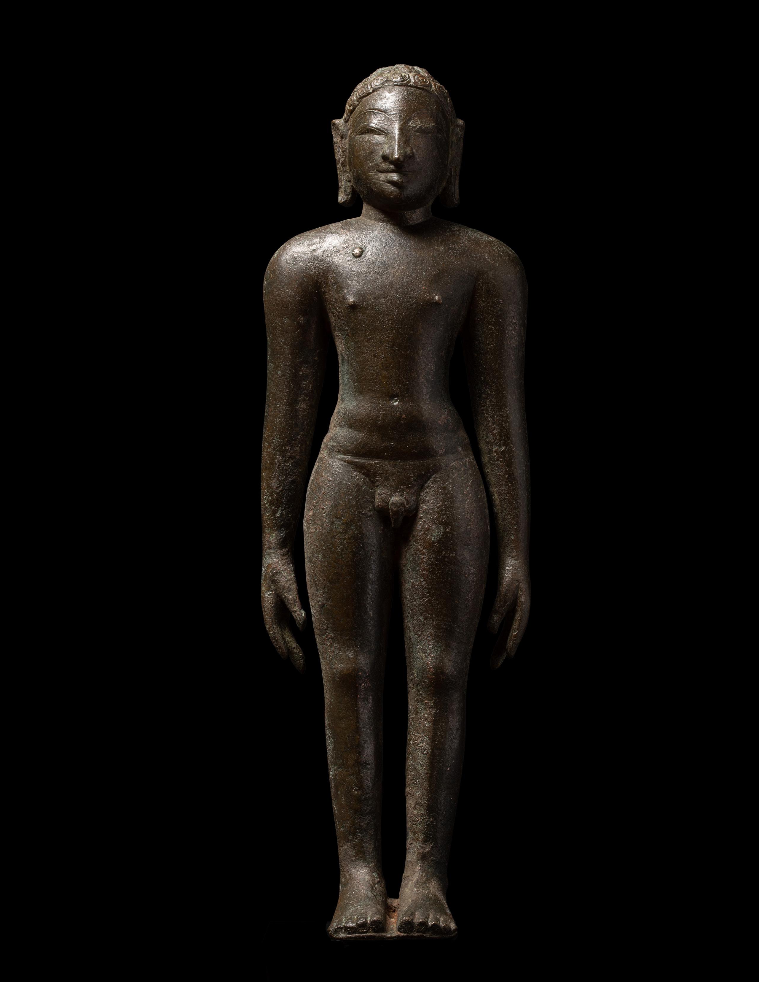 The style of well-modeled and unique ornamentation seen here is characteristic of the Chola period, considered the height of Indian bronze casting. Although images of Bala Krishna are extremely rare, the divine figure in this image became an object of popular worship in southern India by the medieval period. The only other published example of a Chola-period Bala Krishna image depicts him supine, with one of his small toes in his mouth (R. Nagaswamy, Masterpieces of South Indian Bronzes, Ahmedabad, 1983, p.162, pl.174; also in Timeless Delight, Ahmedabad, 2006, p.227, fig.4). The present child figure’s head is modeled with fine hair and a leaf-shaped hairpin like the supine childgod while examples from the subsequent Vijayanagara period donned high cylindrical headdress. As the majority of examples appear to be much more schematic imaginations of the deity than the present figure, it is reasonable to conclude that despite direct comparable examples, this bronze figure of Bala Krishna is a rare and unique artifact of the Chola period.