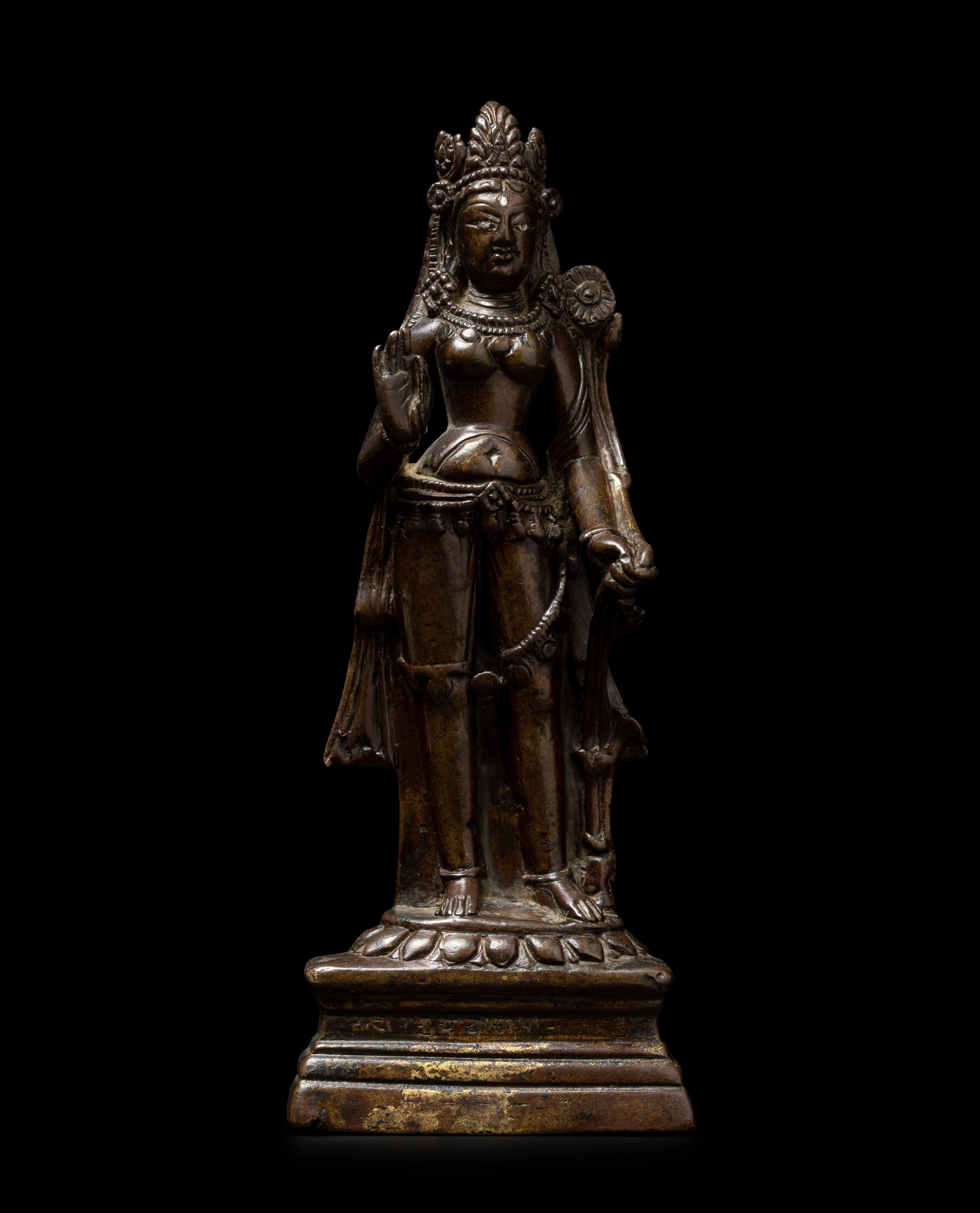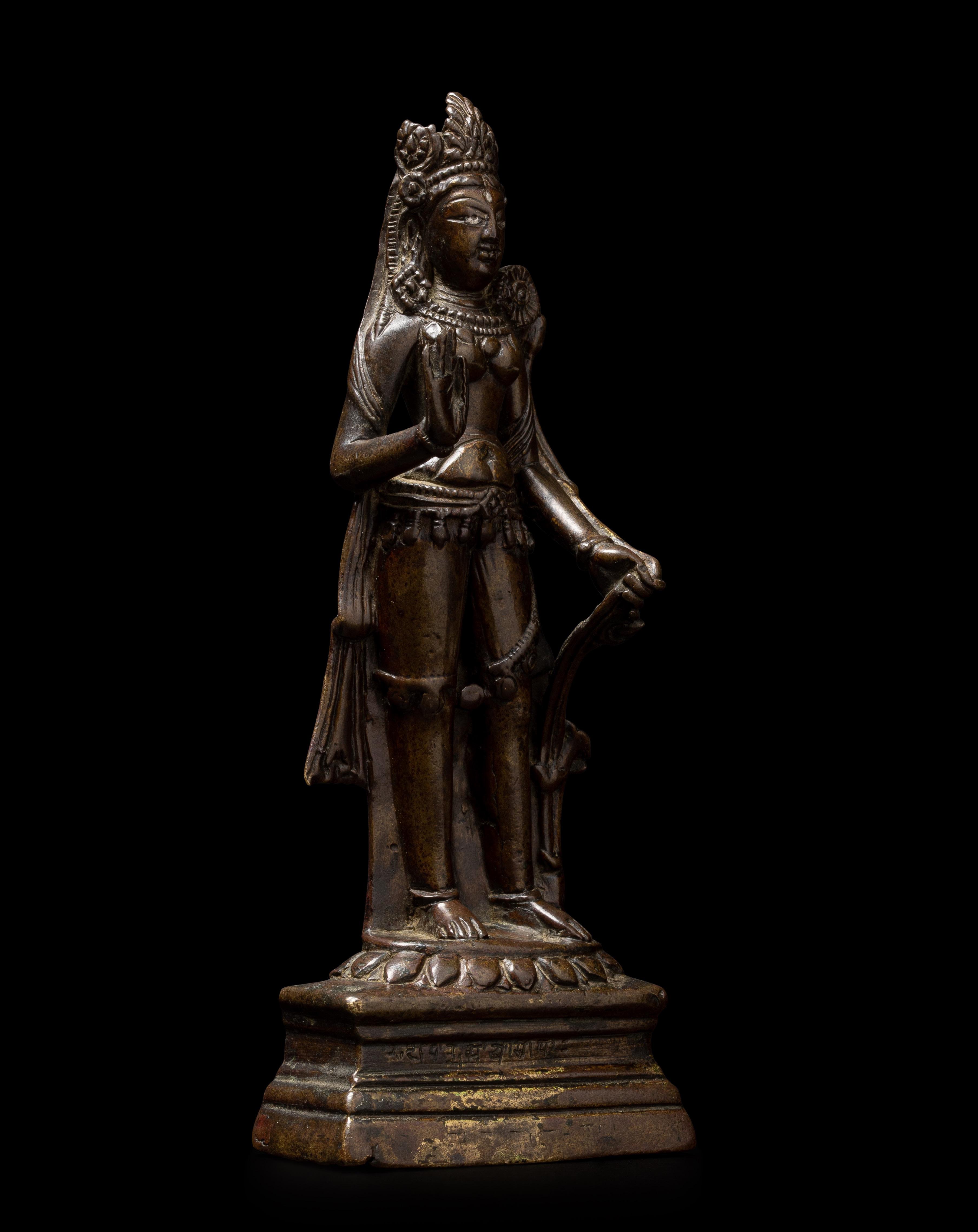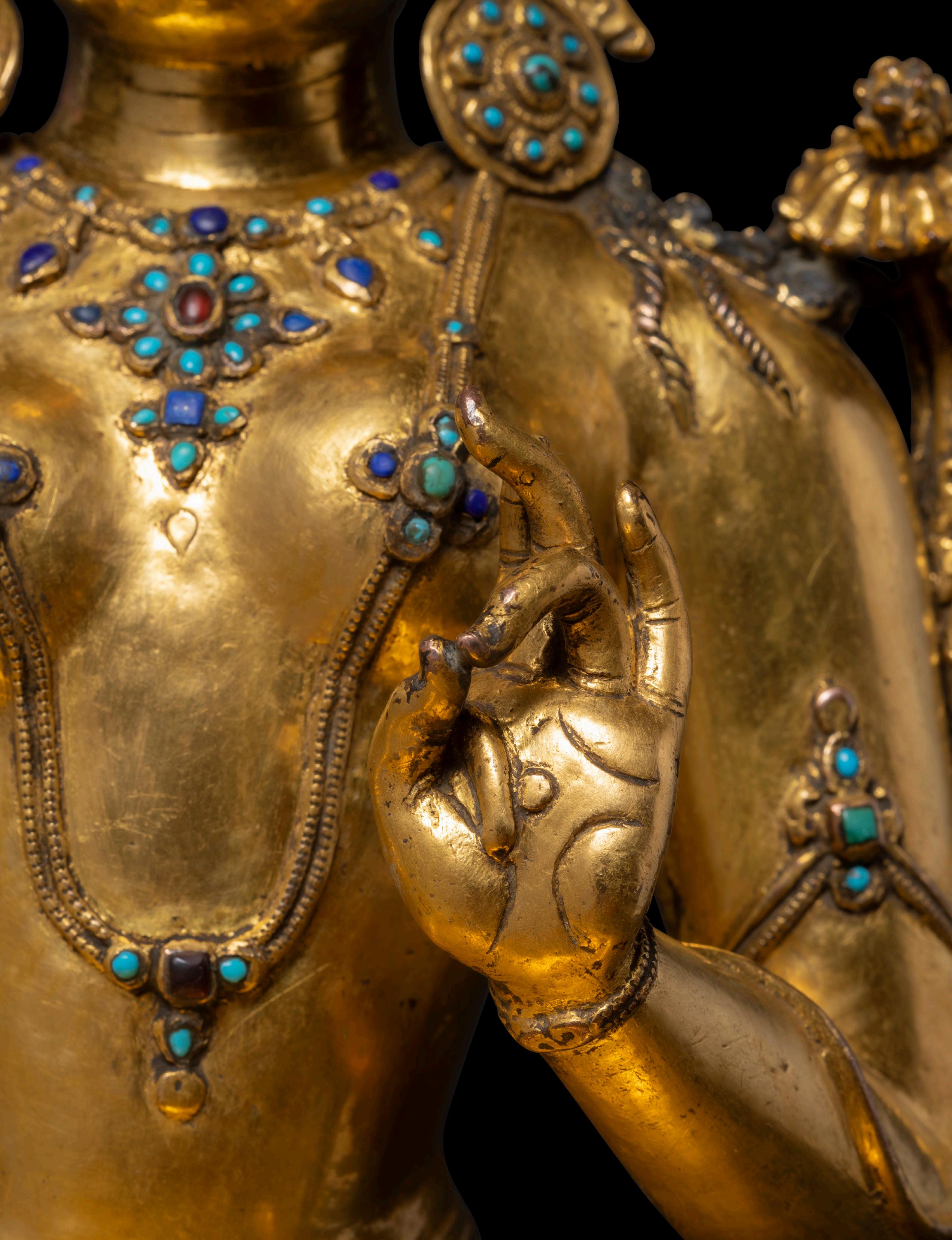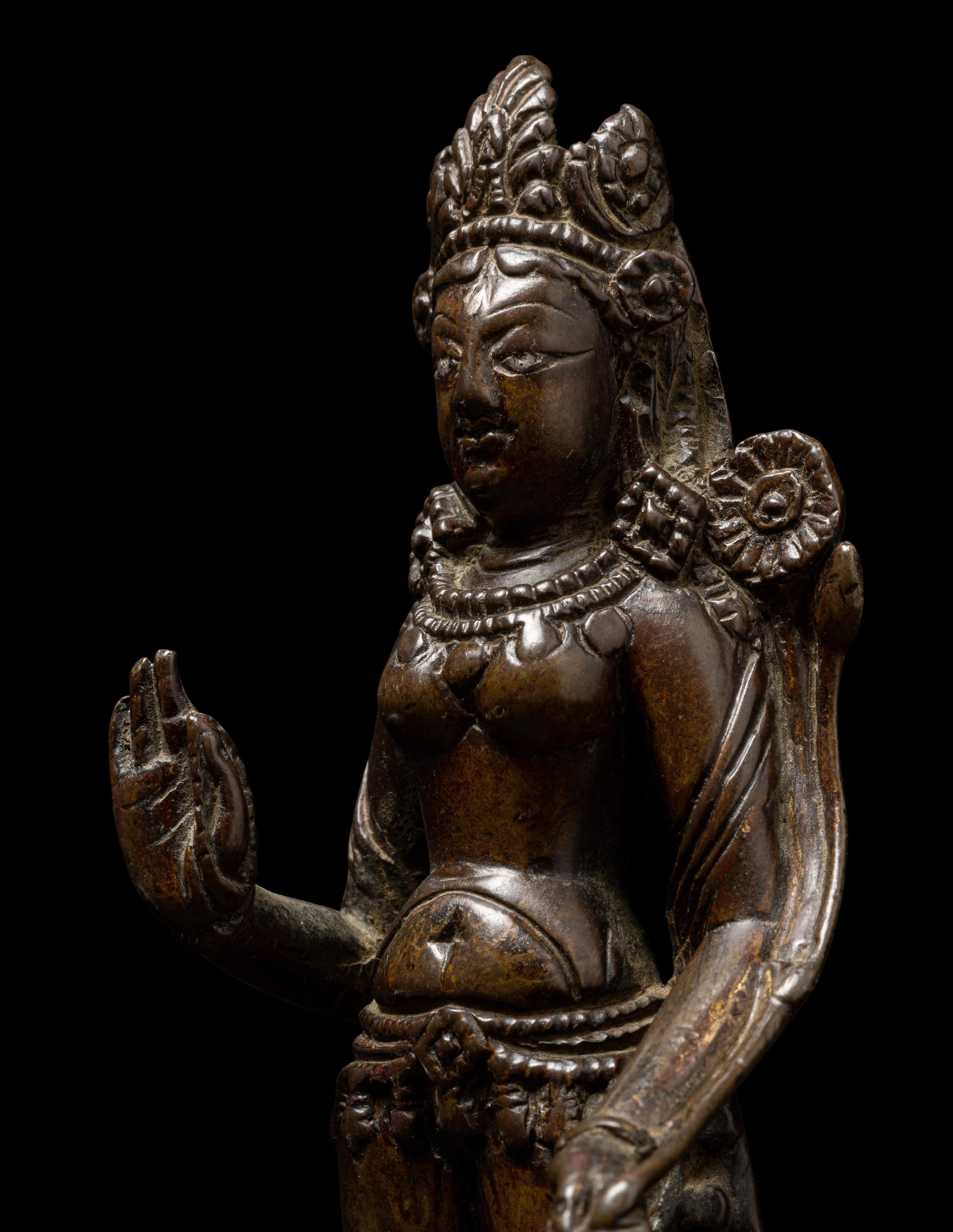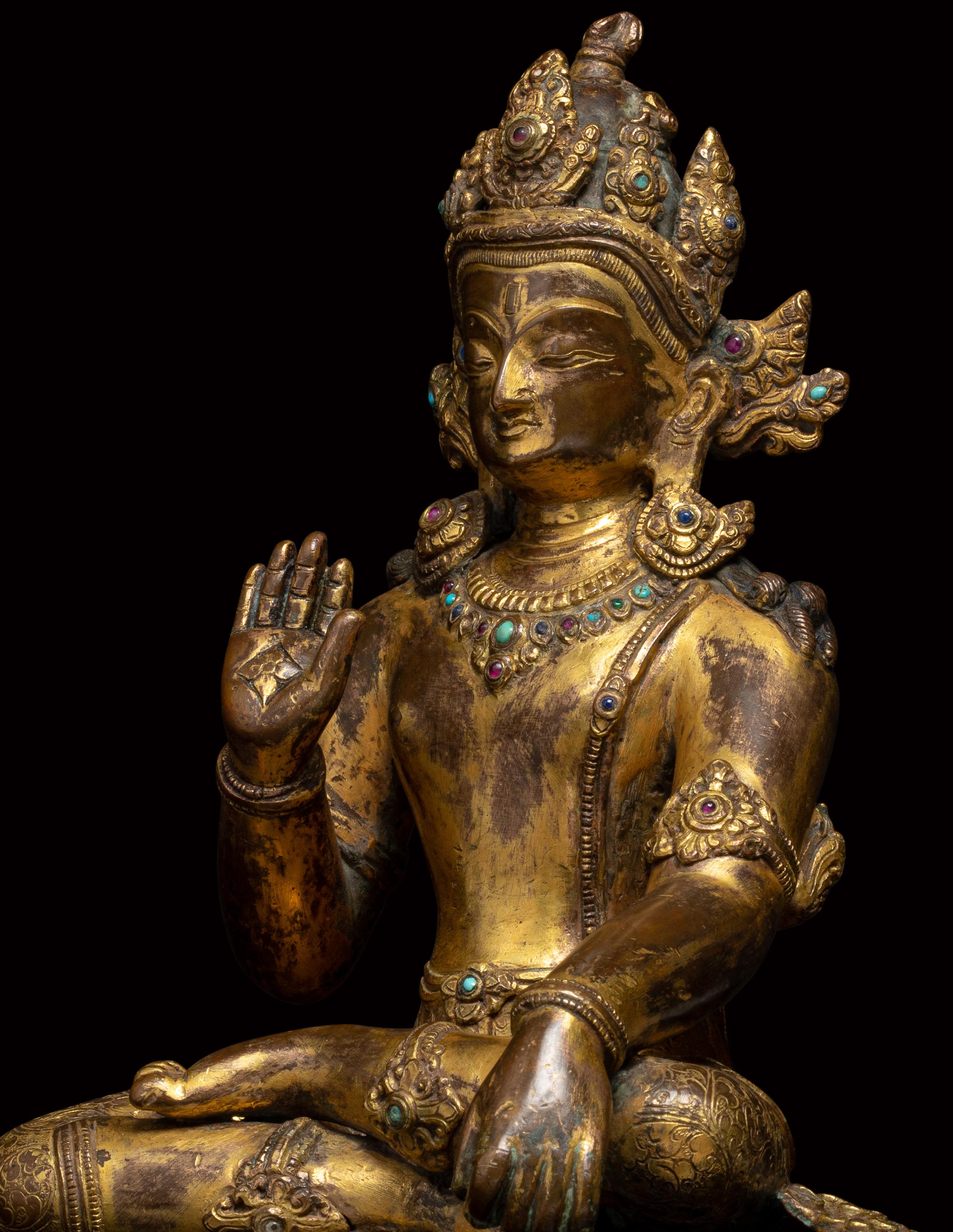 The elaborate five-petaled diadem and tiered helmet with a vajra finial are immediately telling of this fine bronze’s Nepalese origin. The style is common to Nepalese sculptures and mirrors worn by Vajrayana Buddhist acharyas or priests in the Kathmandu Valley. The inlaying of translucent semi-precious stones beside the turquoise and lapis, which give color to the bodhisattva’s heavenly jewels, is also much more common in Nepal than Tibet. This finely cast, richly-gilded bodhisattva clearly displays the naturalistic physiognomy, typical aquiline nose, and precise decoration mastered by the Newar artists of the Kathmandu Valley during the early Malla period. A fifteenth-century figure of Manjushri or Maitreya at the Rubin Museum of Art provides a close comparison (Acc. C2003.33.2; see Himalayan Art Resources, item no. 65255). This figure, too, is clearly missing an iconographic element that would have emerged from a lotus stalk attached to the back of the proper-left arm.