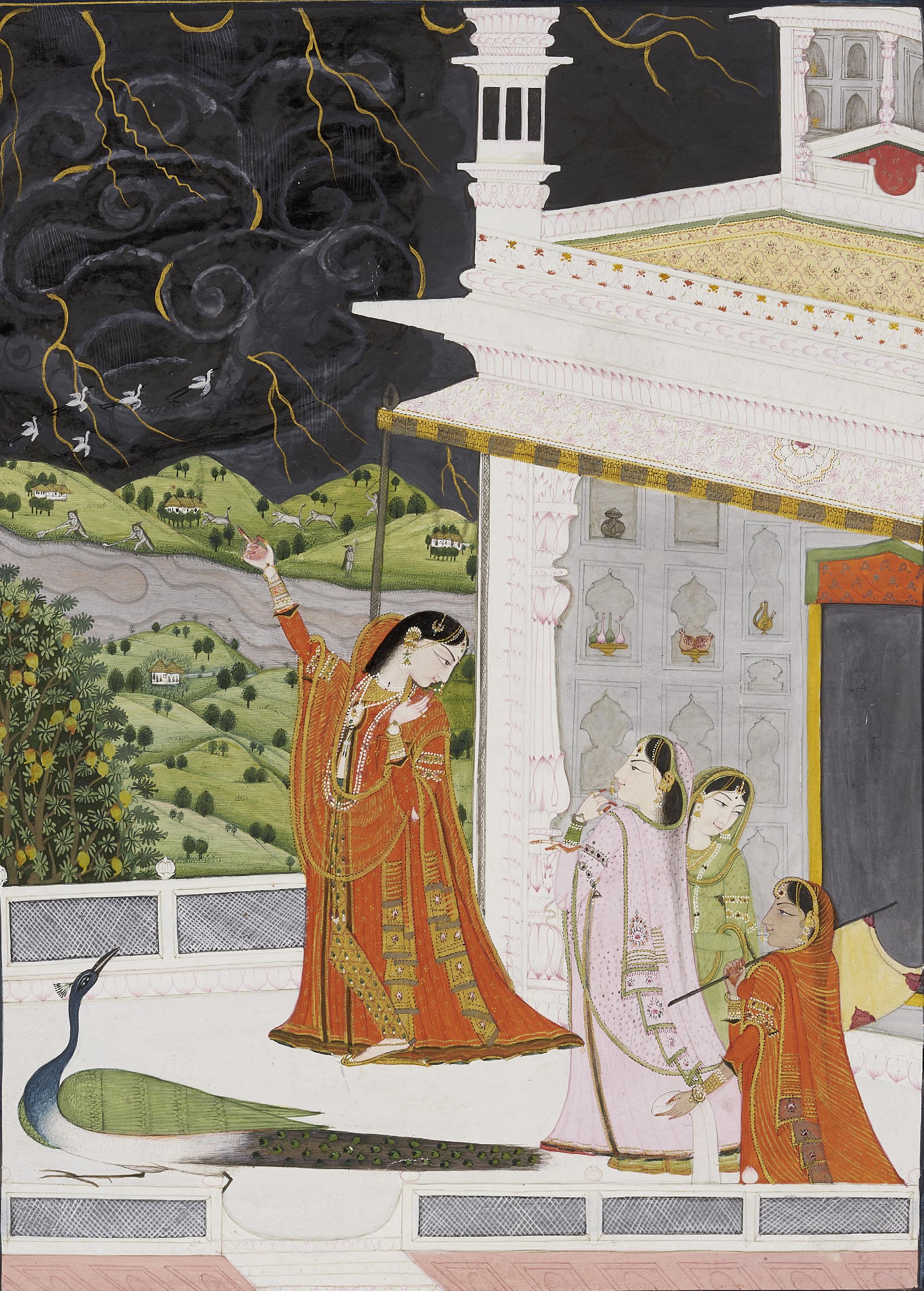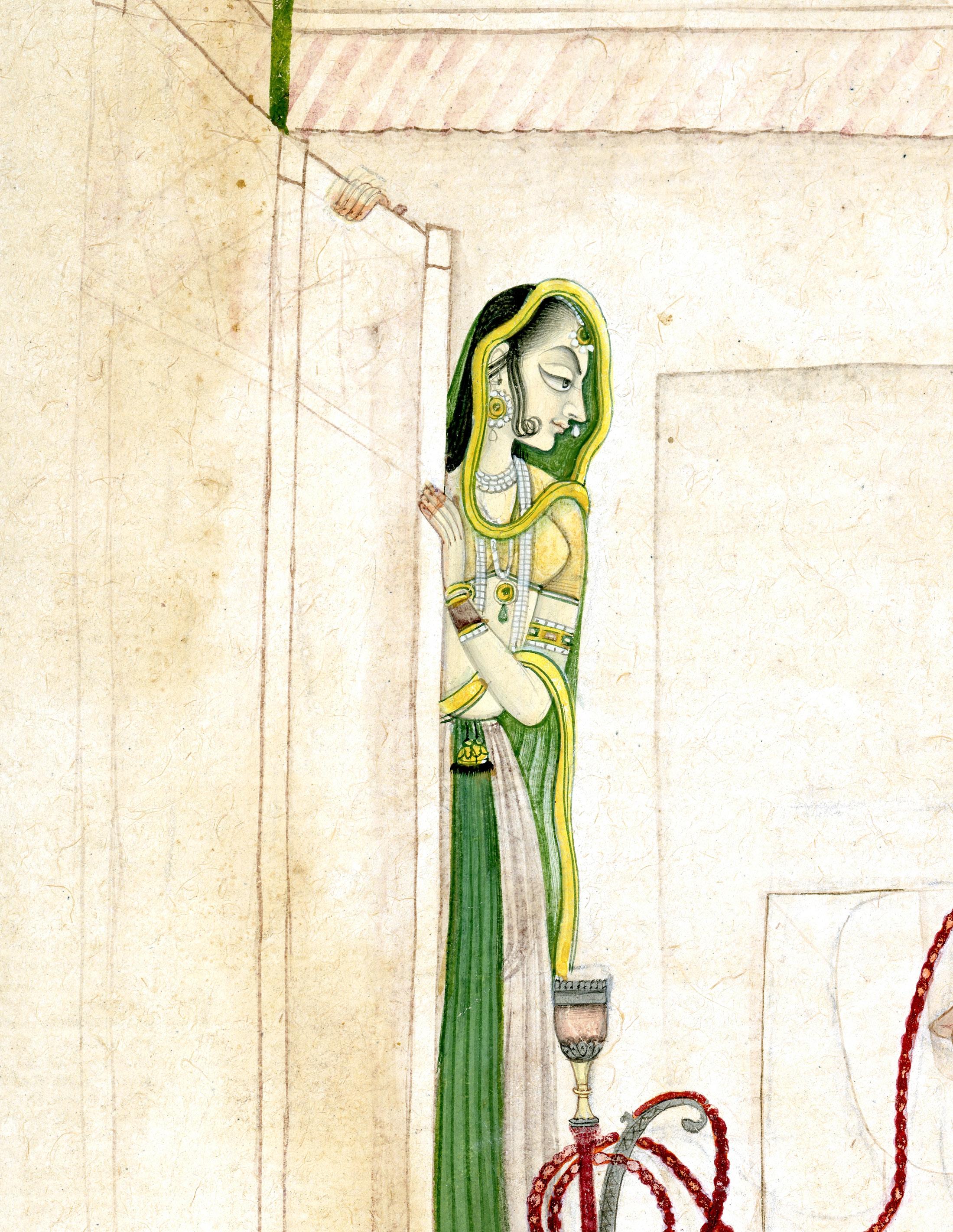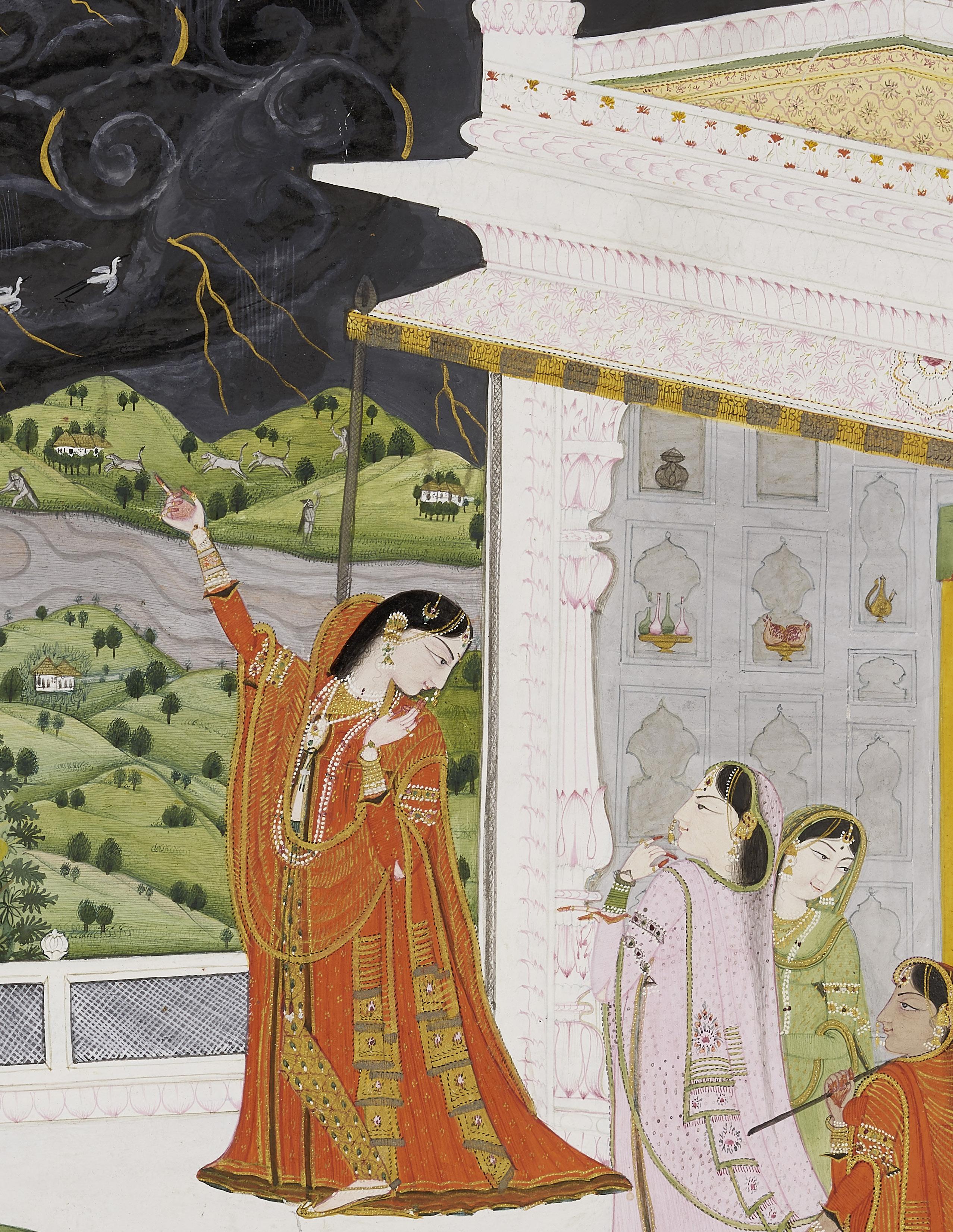 The lively composition is divided according to the principle of kaksavibhaga or ‘zonal divisions’ utilized in Sanskrit dramas; vegetation and architecture create four separate scenes in the present painting. The horizontal register of clouds atop and the style in which vegetation in the form of multiple bowers encloses two of the four scenes are both typical Mewari features.