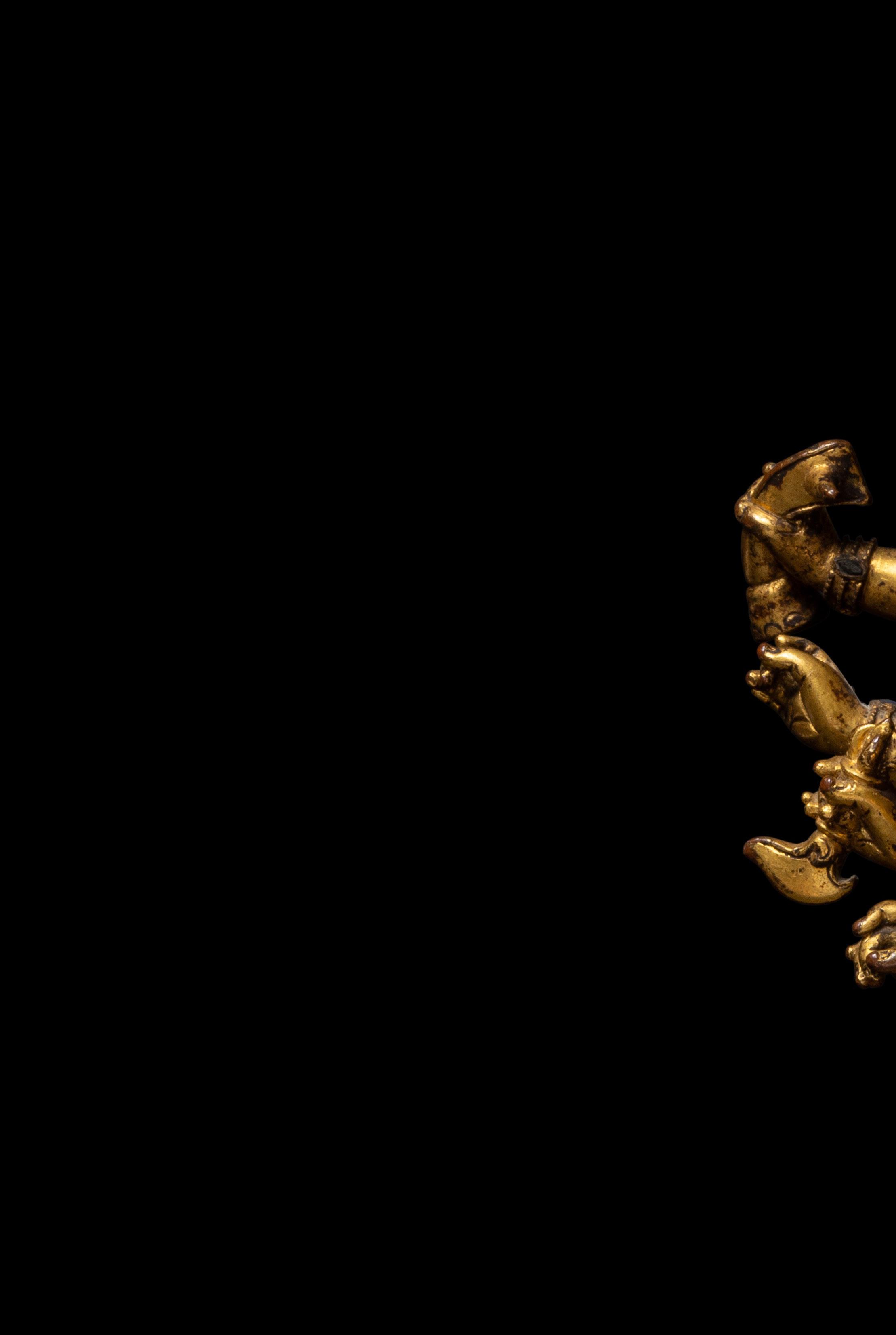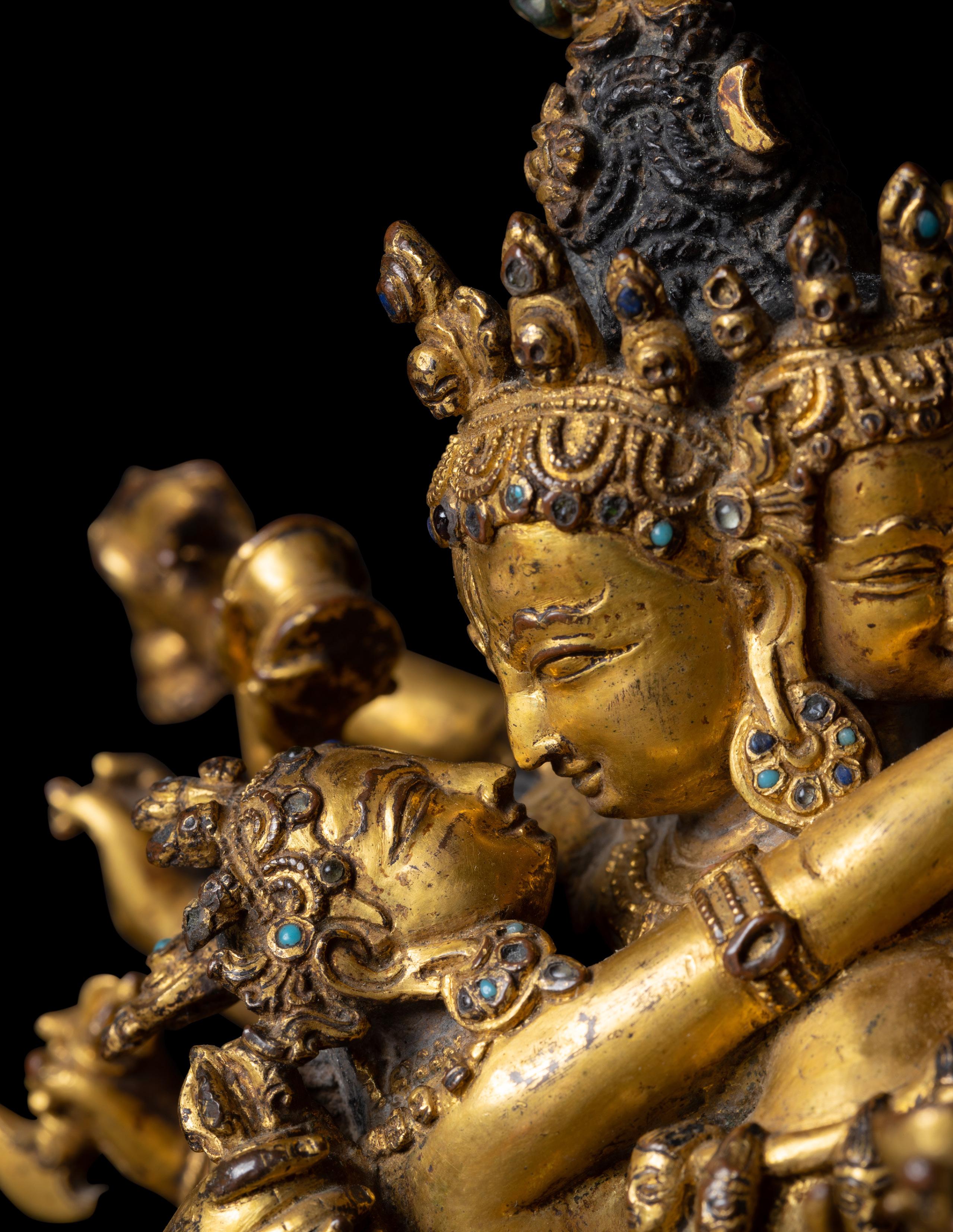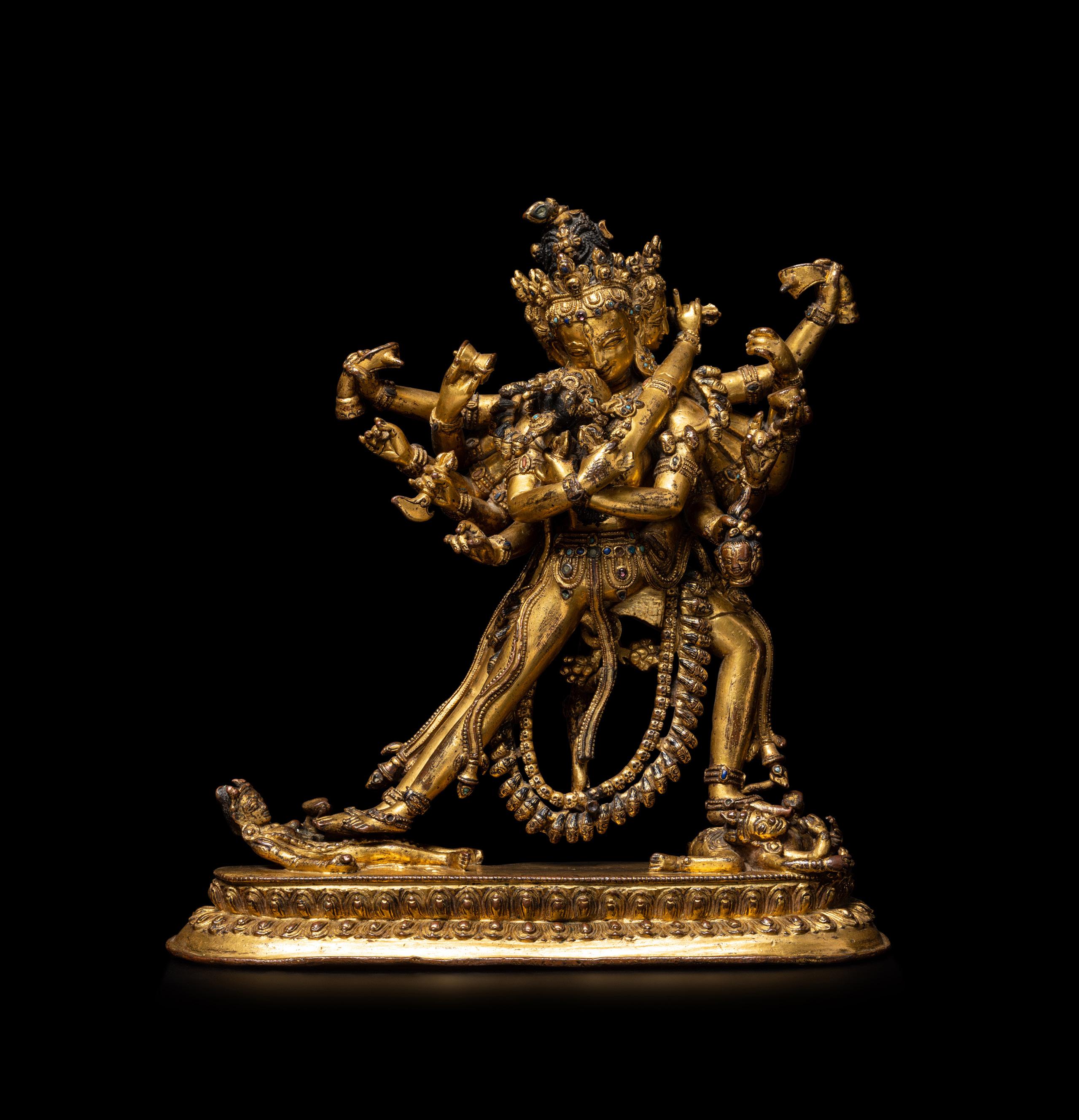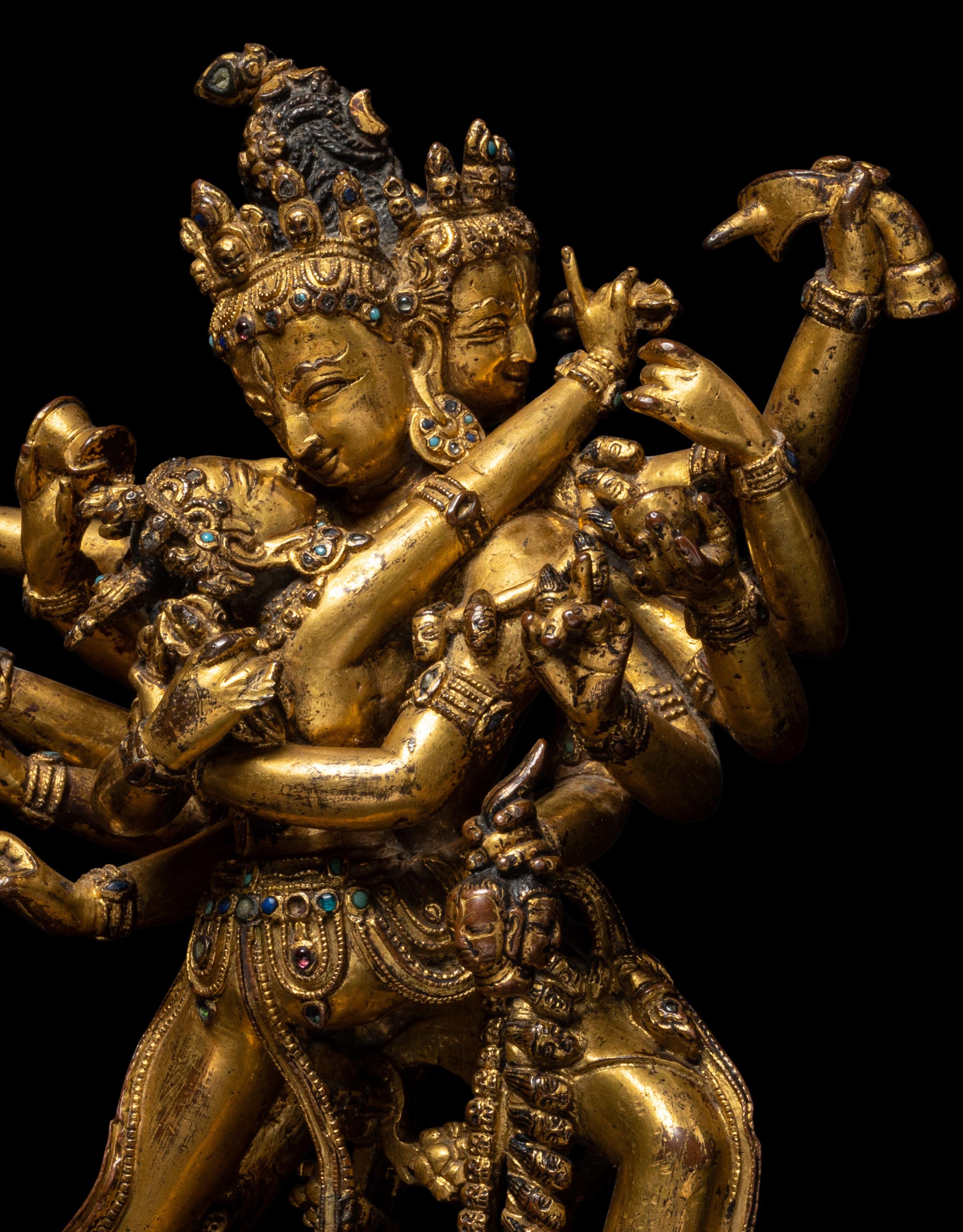 Chakrasamvara and Vajrayogini are important deities of the highest class of yogic practice in Vajrayana Buddhism. This small gilt-bronze sculpture of meditational deities in union exudes an energy that reaches far beyond the boundaries of its surface. Chakrasamvara is depicted here according to Tibetan Buddhist convention, with four faces and twelve hands, in alidhasana, embraced by his consort Vajrayogini. Together they trample the deities Bhairava (who lies prostrate) and Kalaratri (who lies supine). The multi-headed tutelary deity holds various attributes with his many arms radiating around him, the principle arms holding a vajra and bell and the uppermost holding the ends of a tiger skin which he drapes over his back.