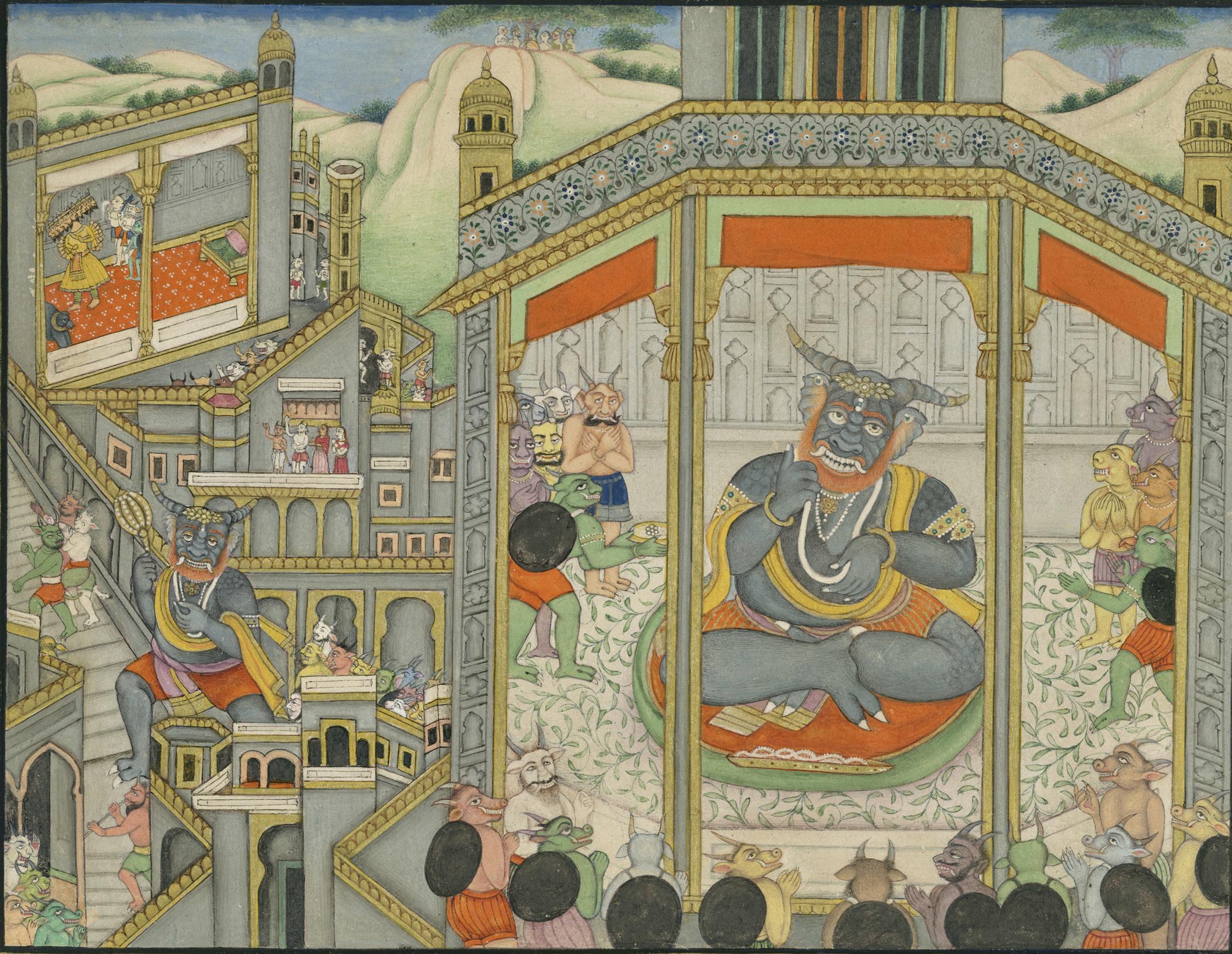 The present scene depicts the first episode of the Devi Mahatmya during the time of pralaya, the period between the cyclical destruction and creation of the universe when the primordial ocean is all that exists. Vishnu is depicted in deep sleep amongst the cosmic waters while Brahma prepares to create the next universal cycle. Brahma’s efforts, however, are interrupted by two demons who emerge to kill him. Alarmed, he attempts to awaken Vishnu to slay the demons, singing a hymn of praise. Brahma sings to the great goddess Mahamaya, the personification of Vishnu’s sleep, and asks her to release him from her spell. As Devi proceeds to retreat from Vishnu’s body she appears before Brahma. Vishnu then awakens and slays the demons, thereby acting as Devi’s instrument in restoring cosmic order.