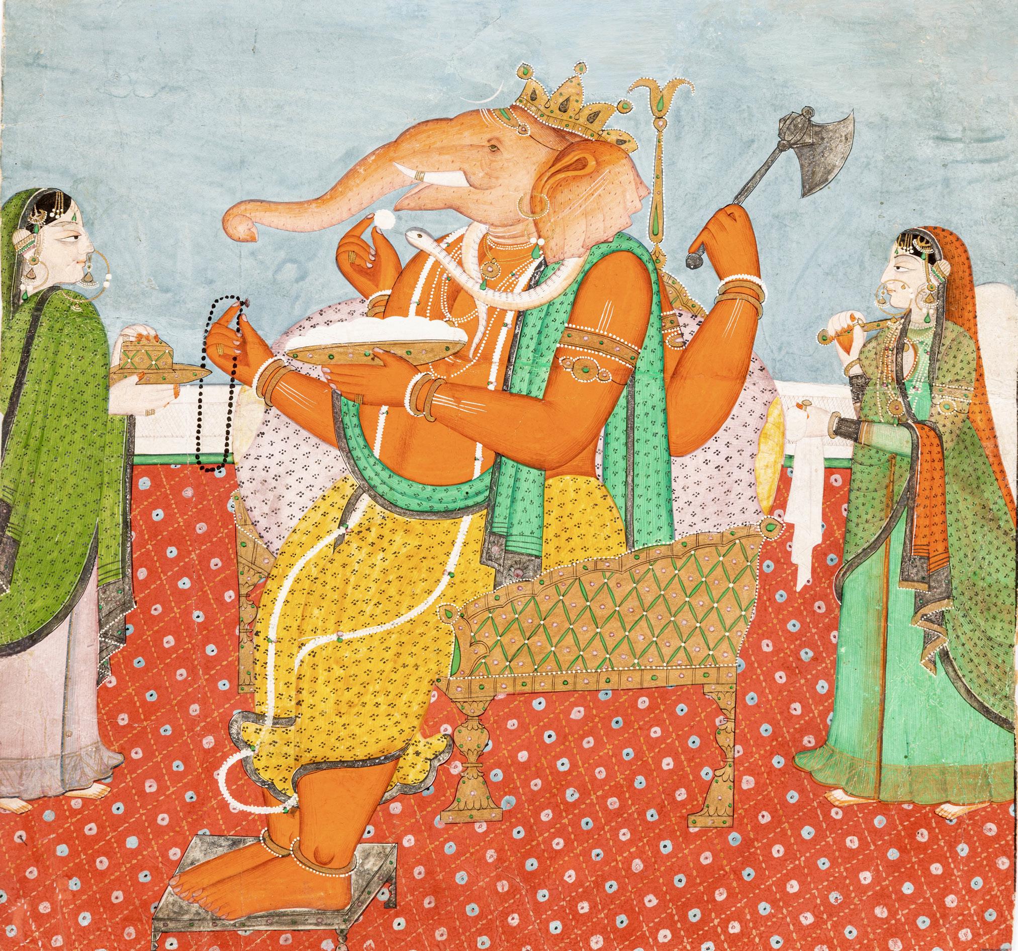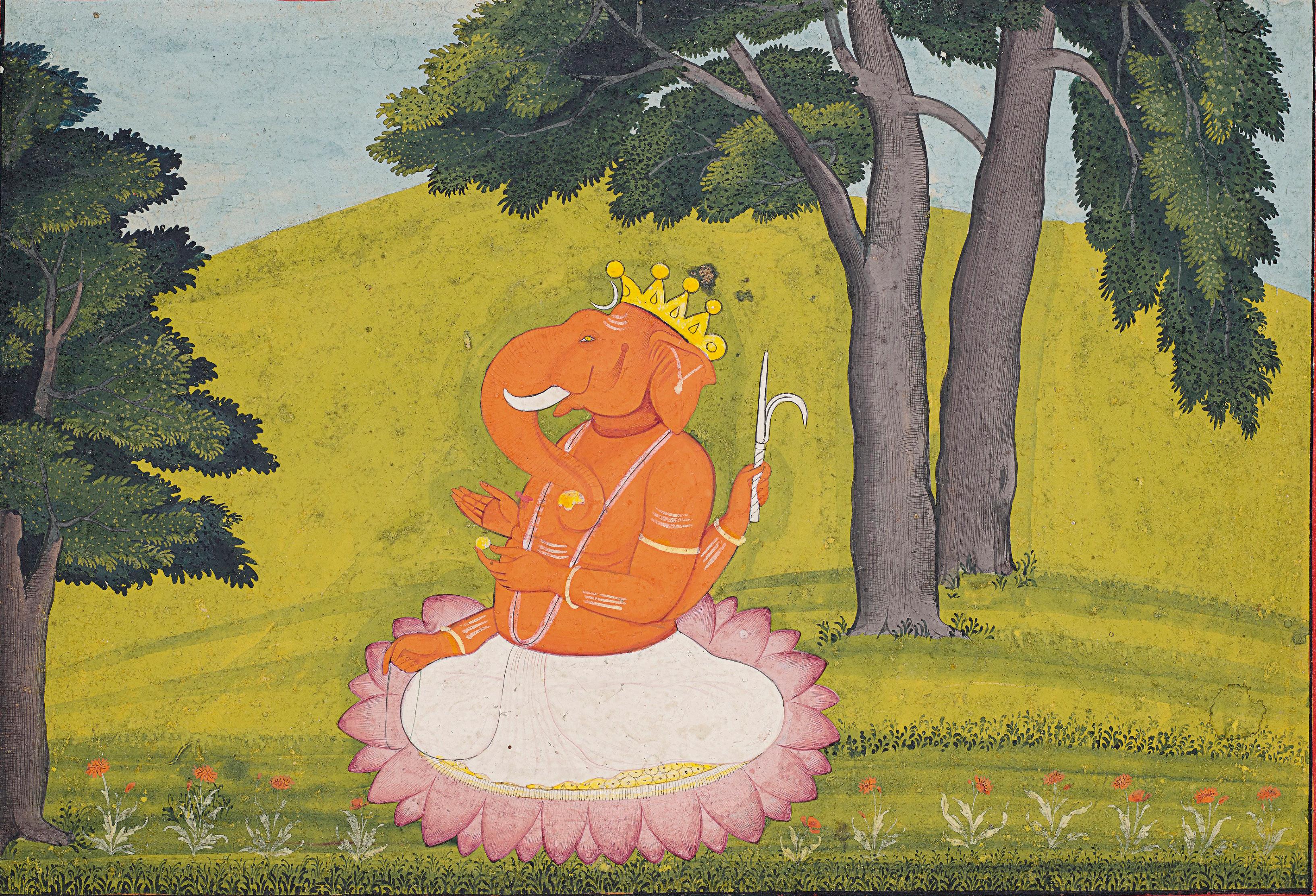 Seated on a lotus flower at three-quarters view, the Lord Ganesha is depicted here, carrying an elephant goad, a rosary, and the god’s preferred sweet, ladoo. As the remover of obstacles and god of beginnings, this image of Ganesha would have been the opening folio of the Gita Govinda series from which it was taken. The lush and detailed landscape of the present composition is representative of that which pervades and defines the entire series. Artists from Guler often utilized a technique of burnishing the backside of the painting in order to deeply embed the colors into the paper support—evidenced by the still-vibrant palette of this eighteenth-century painting.