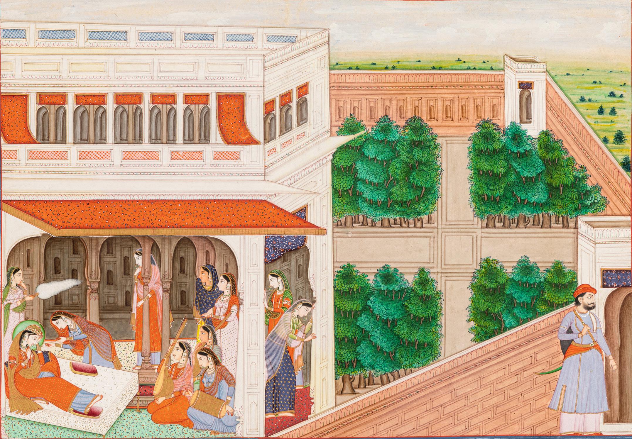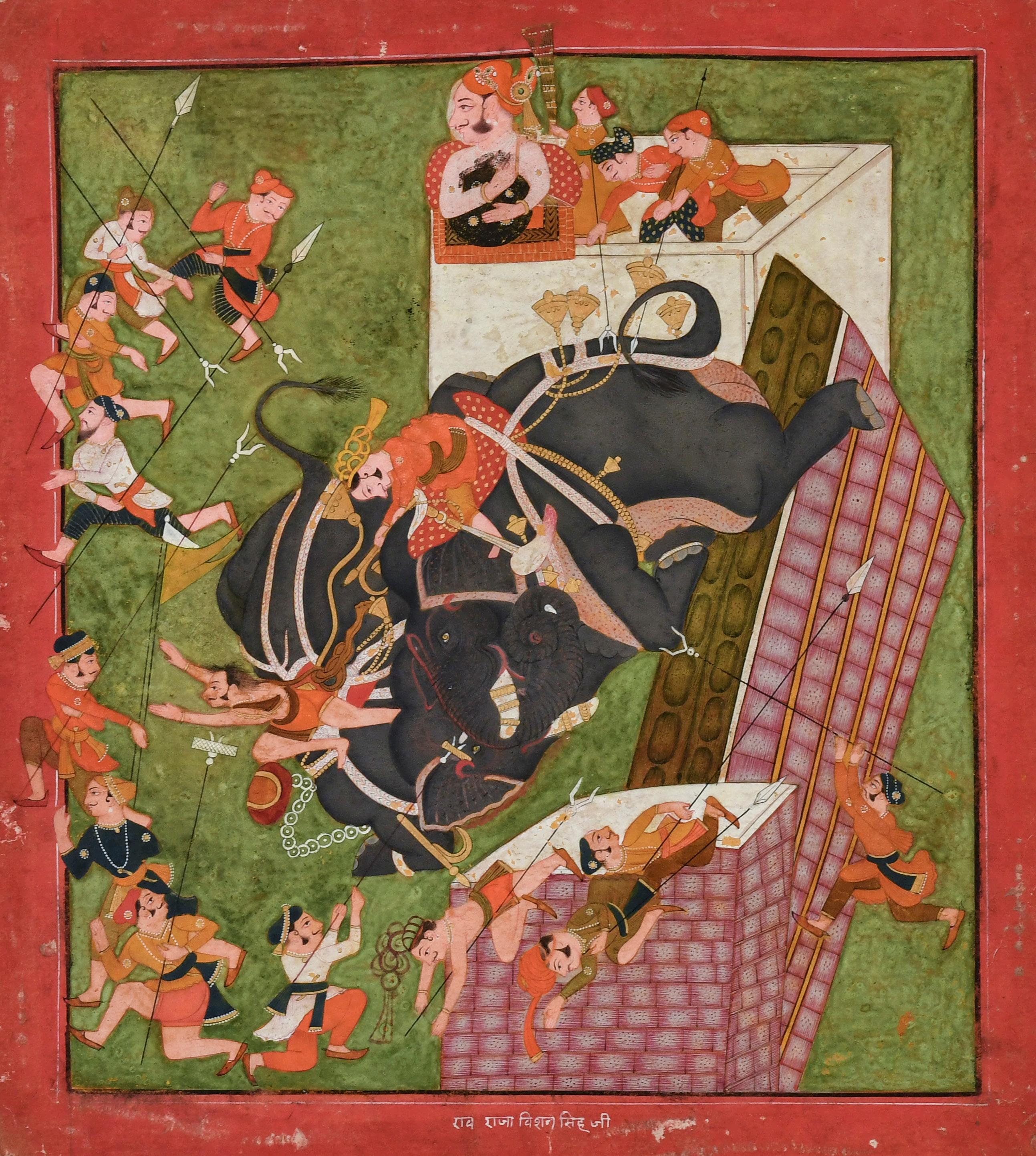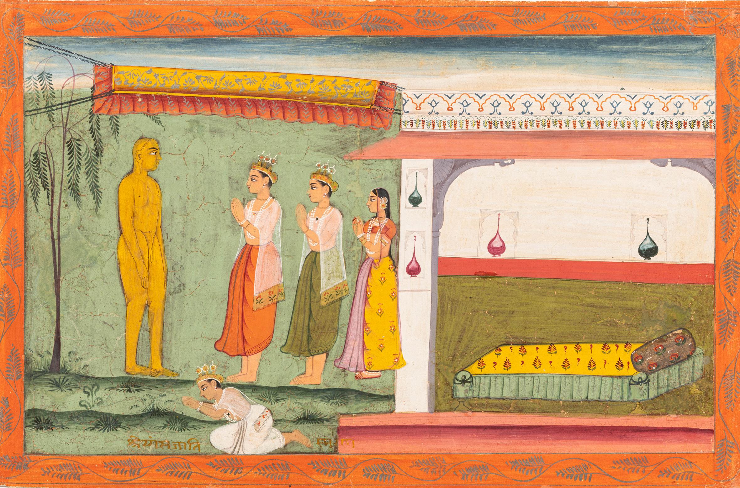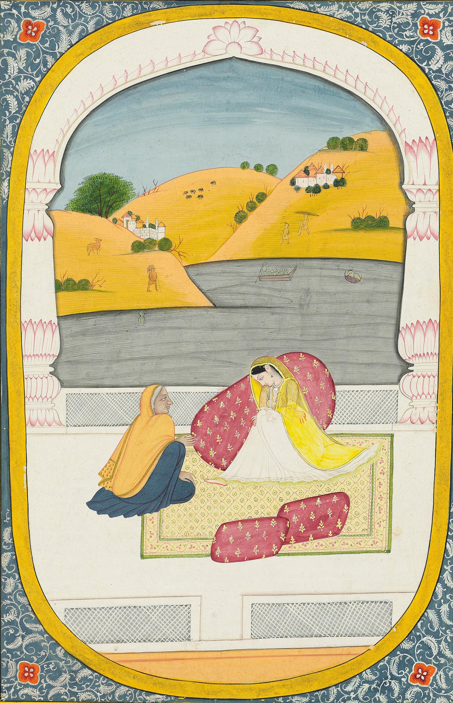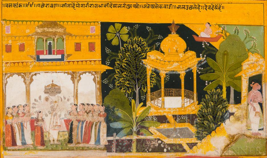 The present painting closely resembles the style of a widely dispersed manuscript completed in 1714 in honor of Maharana Sangram Singh II of Mewar (r. 1710–34) at the Royal Ontario Museum (971.281.4). The series consists of 271 folios and the present is numbered ‘137.’ Dr. Gusharan Sidhu has identified ‘144’ of this series, which he gifted to the Asian Museum of Art, San Francisco (acc. 1990.217).