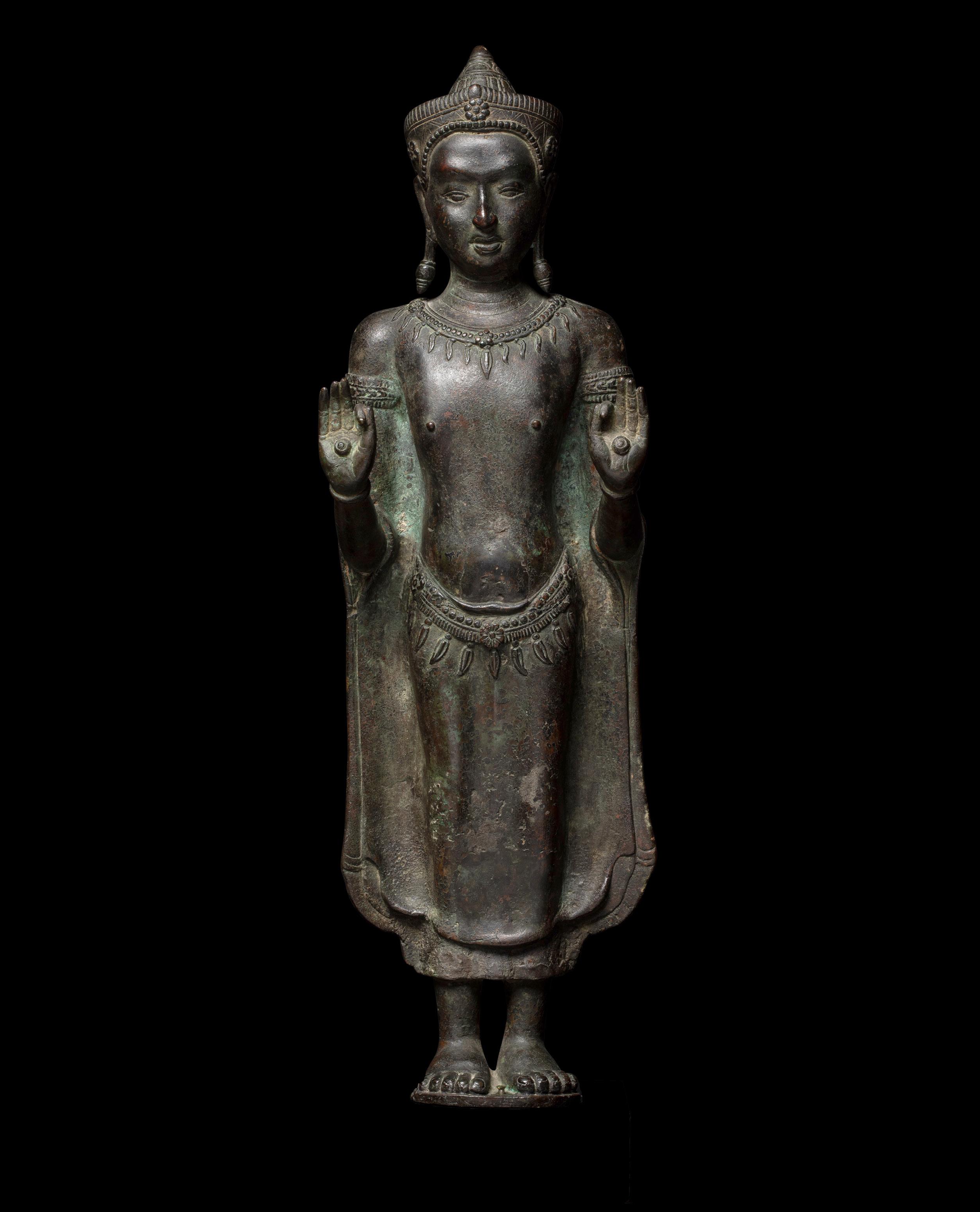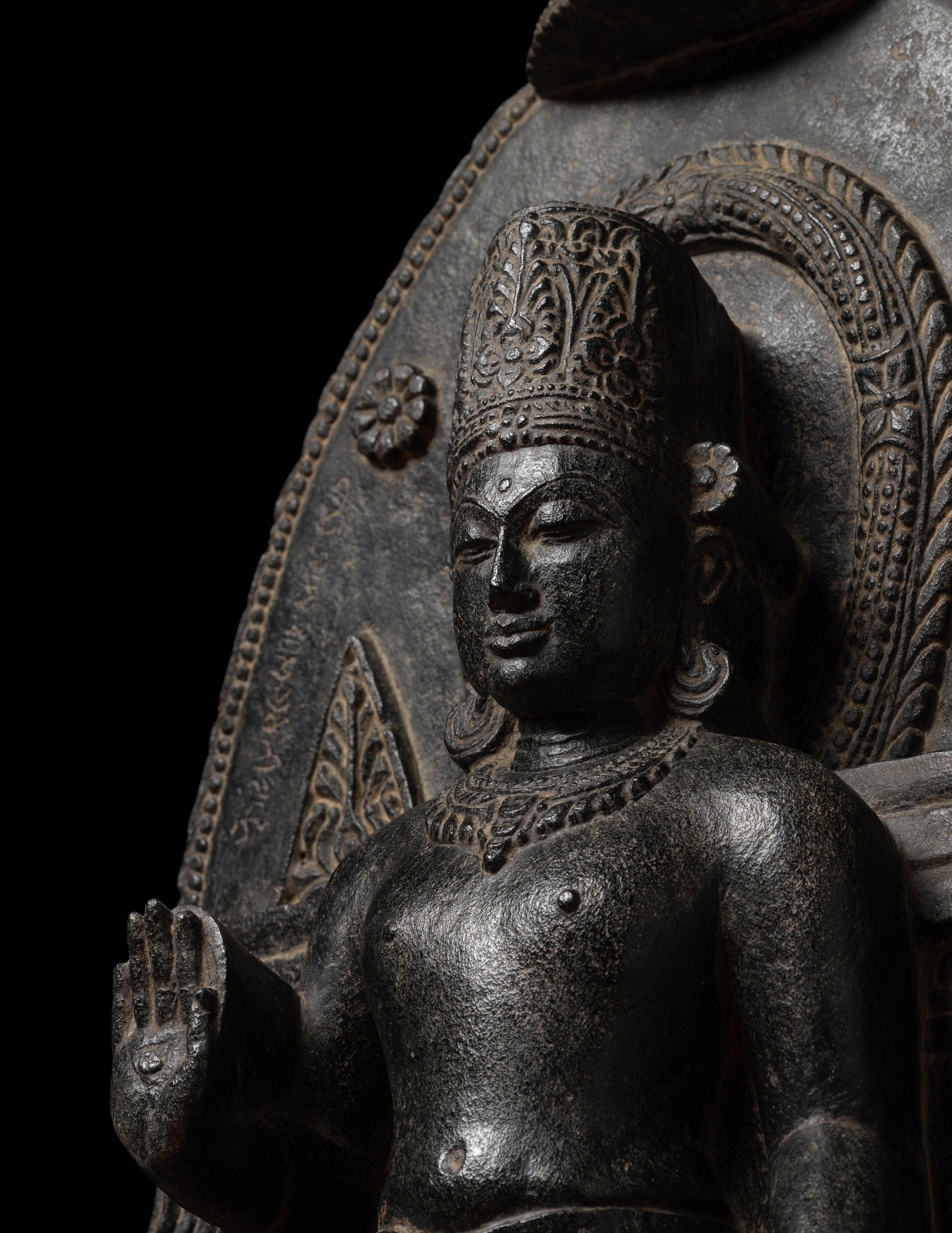Downcast eyes and slightly upturned lips convey the spiritual equipoise of this benevolent buddhist being. The figure wears all of the garments of a bodhisattva: a crown, necklaces, bracelets, a sacred cord, a festooned belt around a floral dhoti, and anklets. This heavenly manifestation is known as a sambhogakaya (Skt.) appearance. In English, this Tantric Buddhist class of beings are referred to as ‘enjoyment bodies.’ The sambhogakaya is a realm one gains access to through the highest dimensions of practice; it is where all bodhisattvas reside. Sambhogakaya manifestations are considered one of the primary means through which buddhist truths are made manifest to human beings. Buddhas often take on this appearance to teach highly realized practitioners and bodhisattvas.