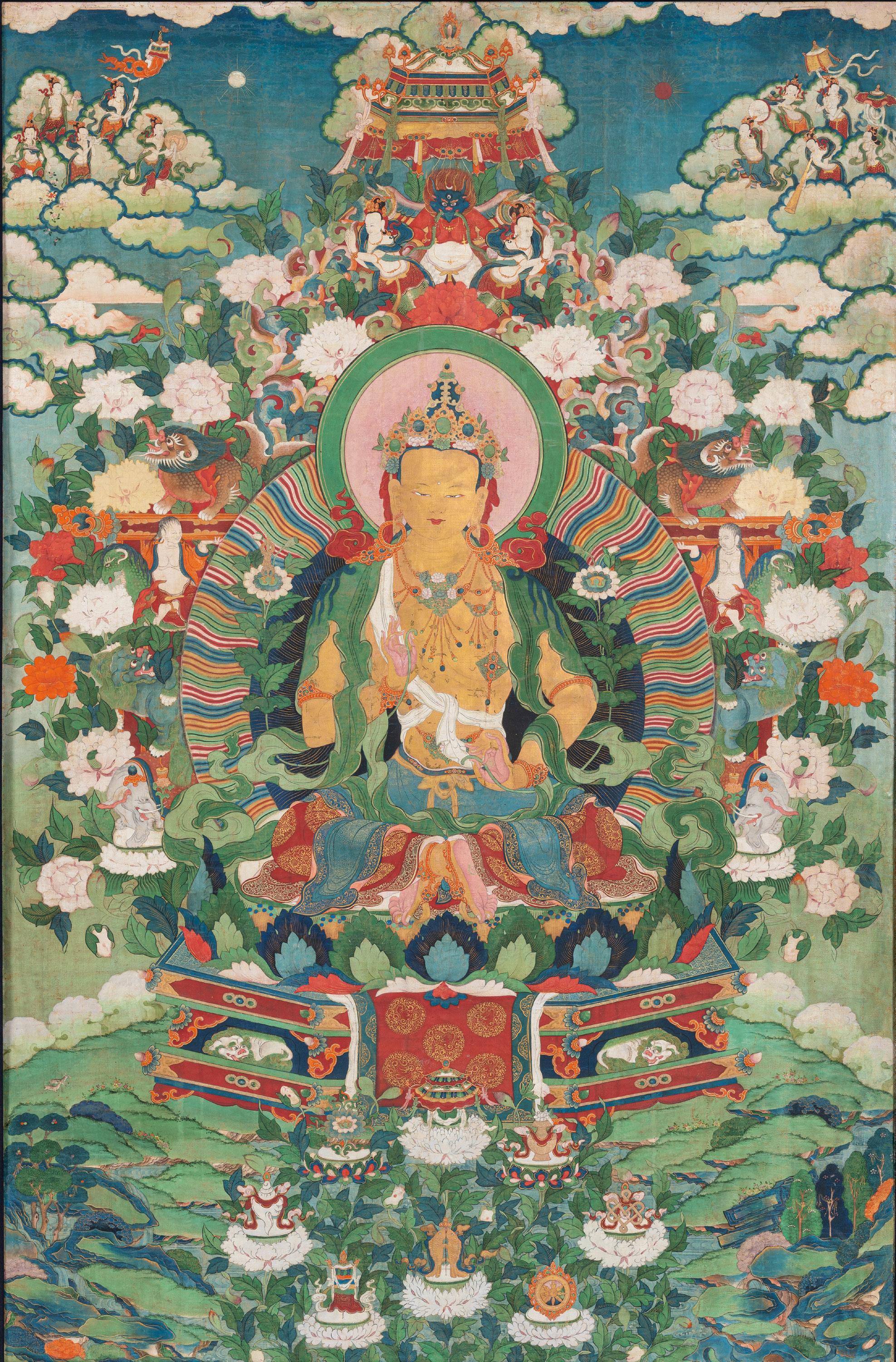 The golden tone of this majestic figure’s skin belies his identity as the bodhisattva Vajrapani, as the deity is more typically depicted in blue or green. In the Vajrayana tradition Vajrapani takes the place of a narrator, relaying Tantric Buddhist teachings. He appropriately holds a vajra and ghanta which, together, embody his perfected state. The foreground below the celestial figure is filled with large lotus flowers supporting the Eight Auspicious Symbols of Tibetan Buddhism: a parasol, a vase, an endless knot, a dharma wheel, two fish, a victory banner, a conch shell, and a lotus flower.