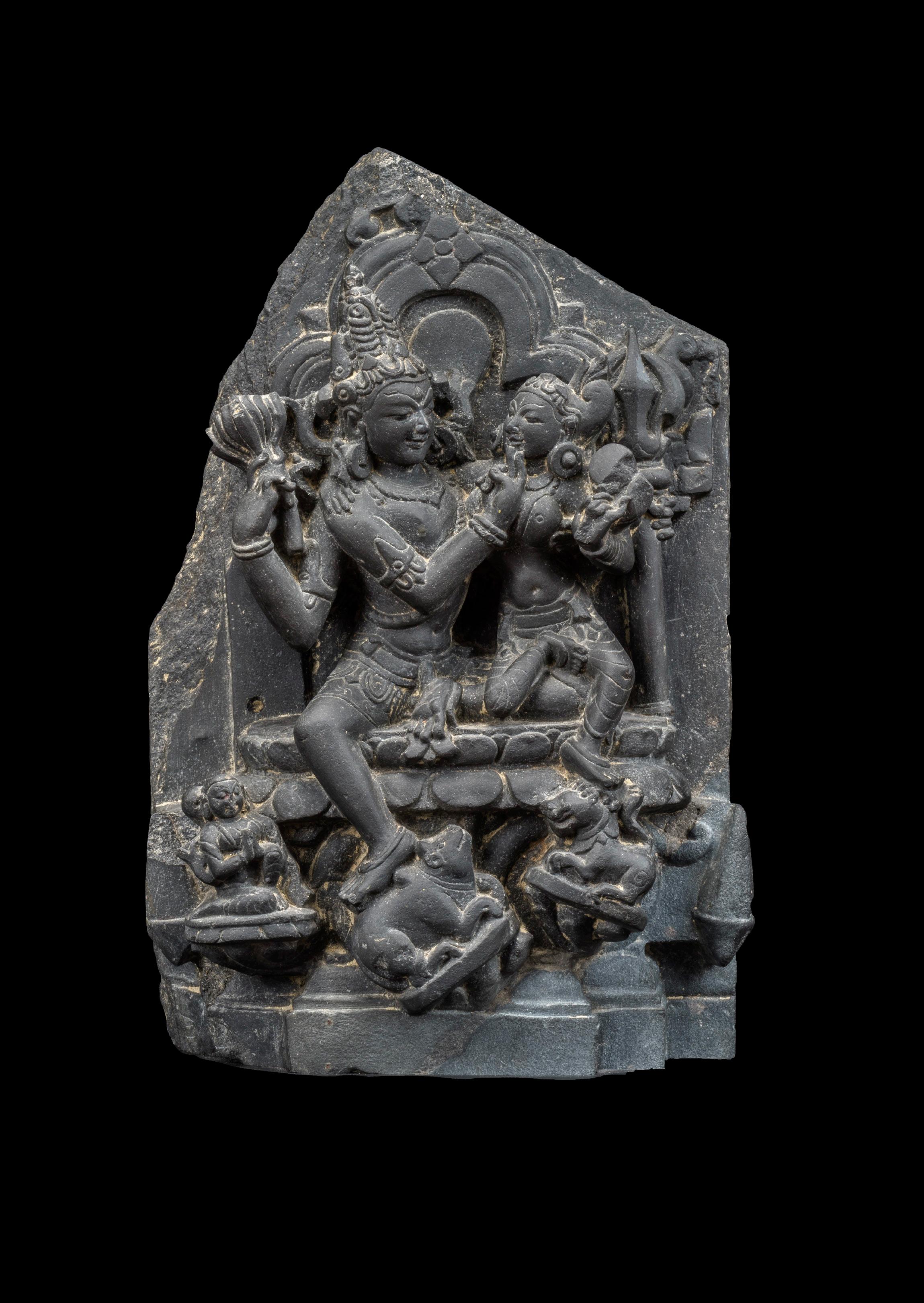The divine couple depicted here is referred to as ‘UmaMaheshvara’, as the god and goddess demonstrate their loving union in this affectionate display. The present sculpture was created according to a standardized convention: Shiva (Maheshvara) sits atop a lotus in rajalalitasana, the posture of royal ease, with Parvati (Uma) on his left thigh. Shiva holds a partially opened blue lotus in his upper right hand while his lower right lovingly raises his consort’s chin. His lower left hand wraps around Parvati’s waist, gently touching the bottom of her left breast. Parvati holds a mirror and wraps her opposite arm around Shiva’s shoulder where her delicate hand rests. Shiva’s left hand holds a large trident in a strong grip. Their pendant legs are supported by Nandi and a lion, respectively. A devotee is depicted to their lower left.