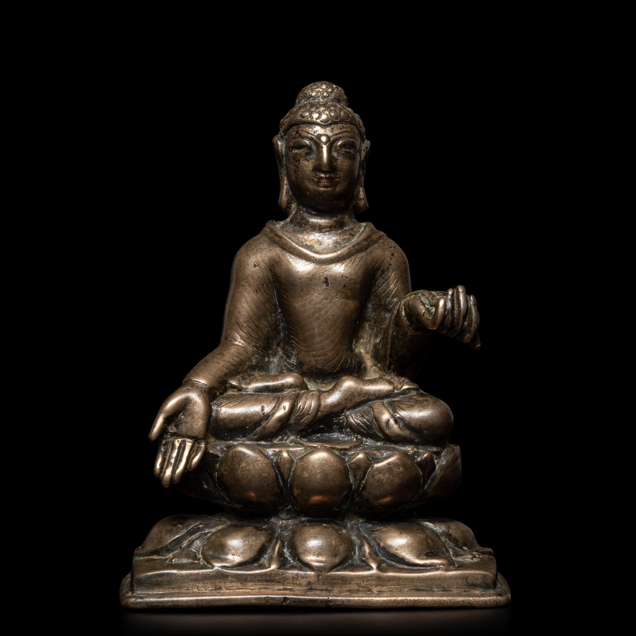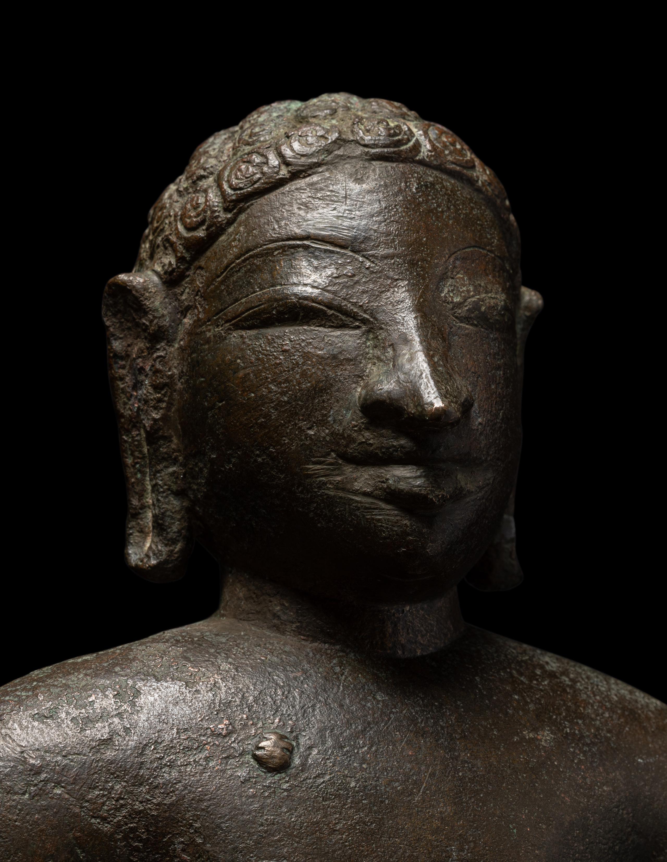 The five celestial buddhas are, therefore, depicted in sambhogakaya or “bodhisattva appearance” with great frequency. Thus, without a view of the present sculpture’s equally-detailed backside, the meditative posture and fear-dispelling gesture (or abhayamudra) might lead one to identify the peaceful deity as the buddha Amoghasiddhi of the North. However, a protruding piece of metal on the back of the figure’s proper-left arm indicates that there was once a lotus stalk here, which would have supported another iconographic element essential to identification of the figure. Without this element present, the figure must be described as an unidentifiable bodhisattva. Yet, the origin of this figure is apparent.