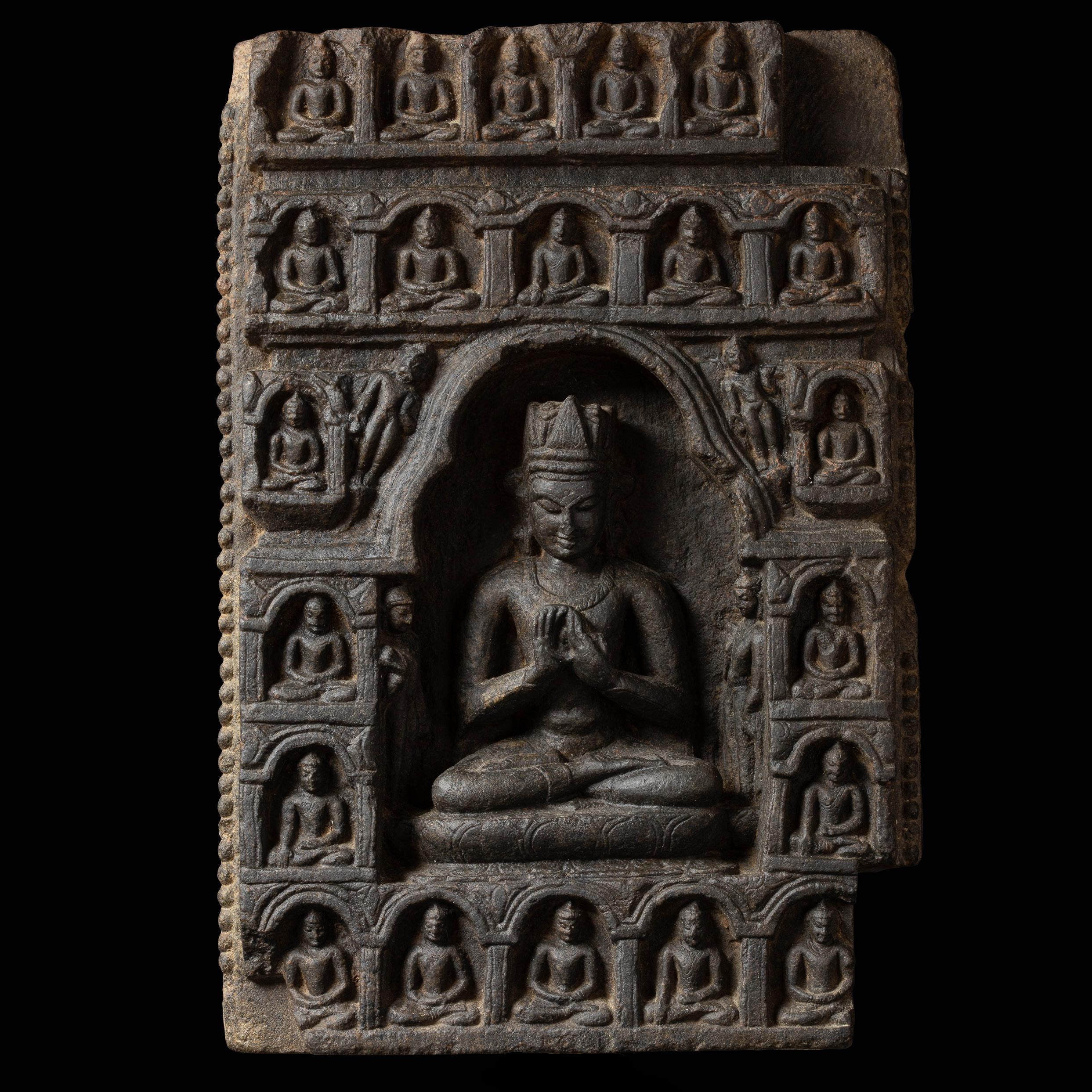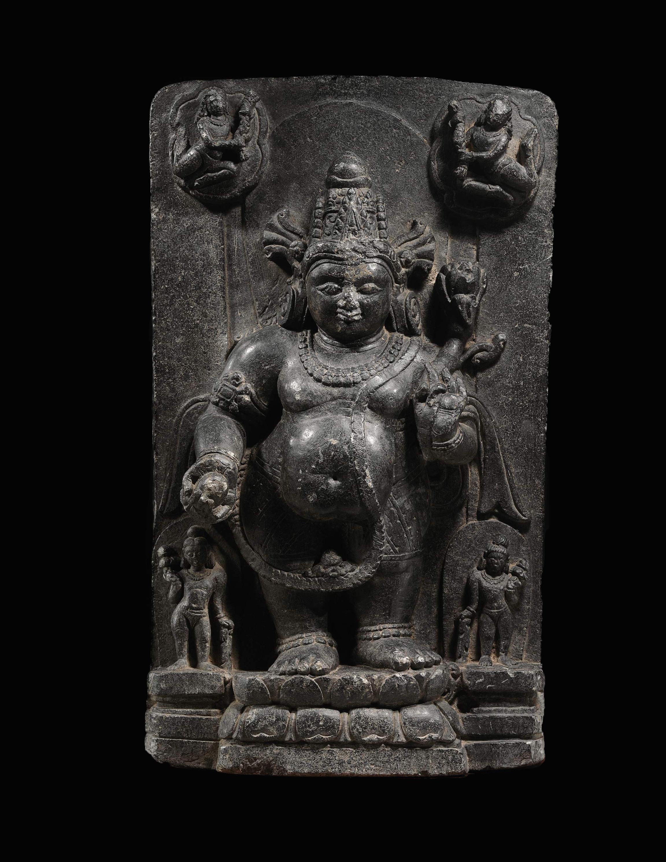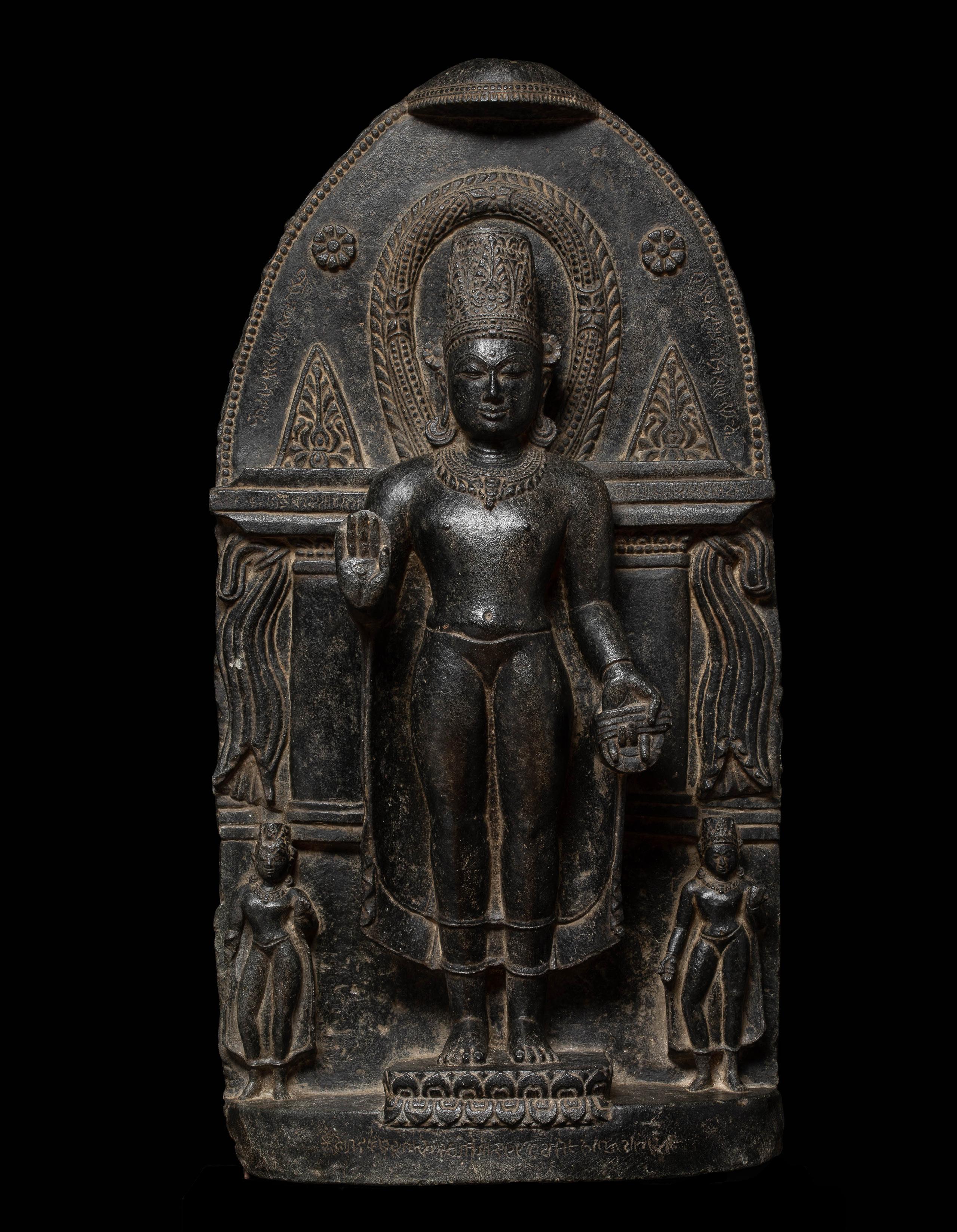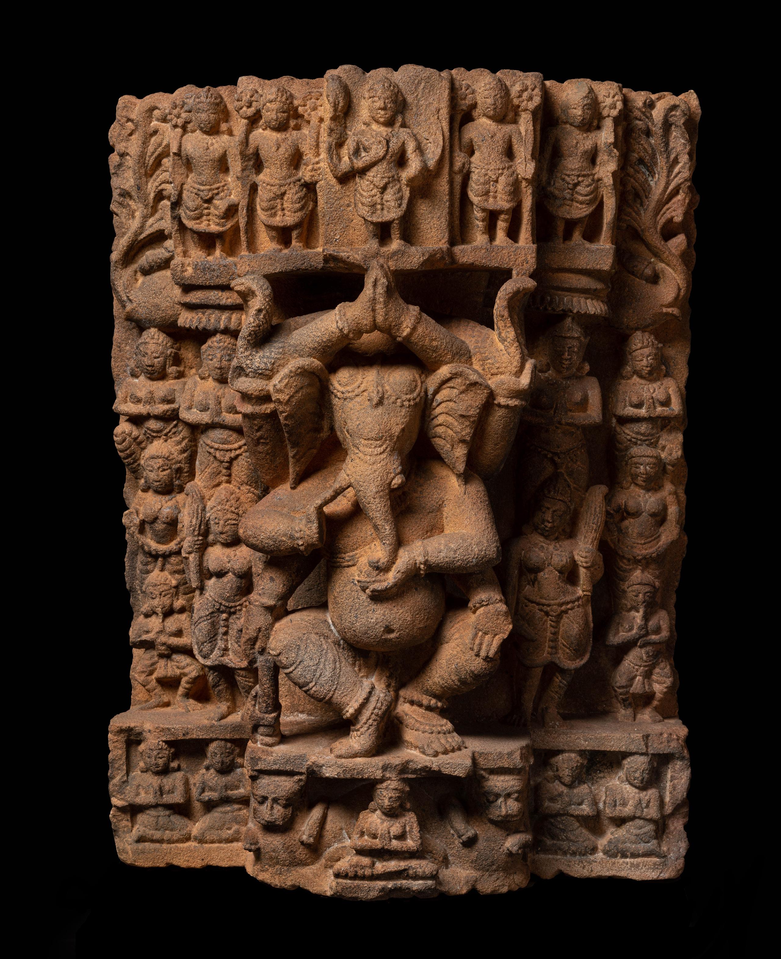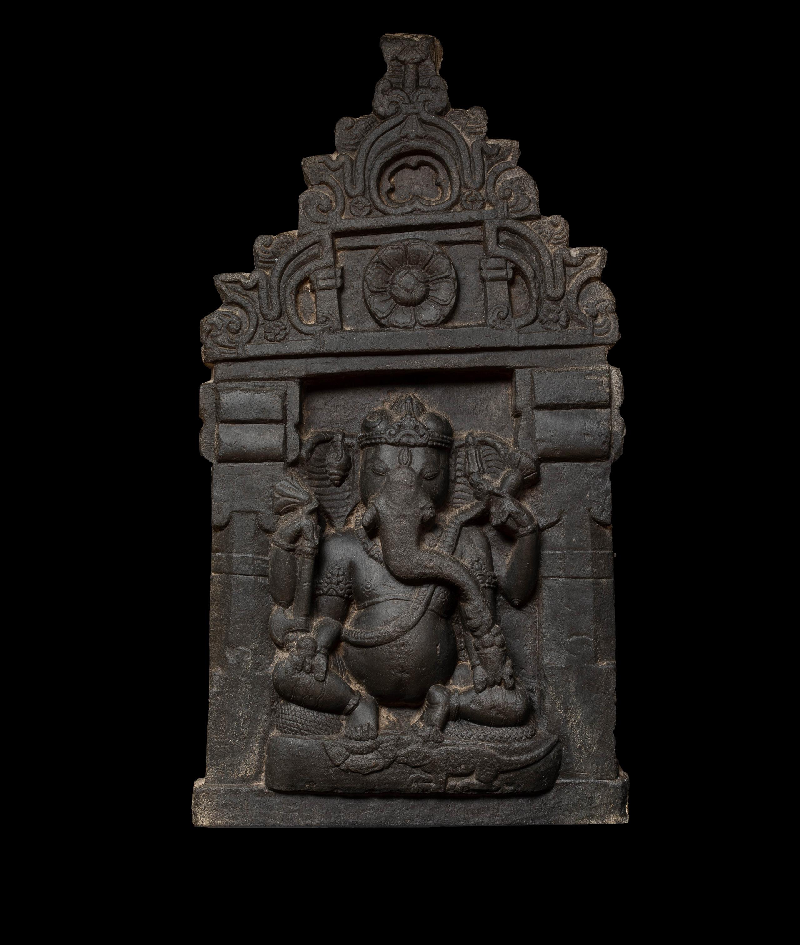 This charming image of the widely adored remover of obstacles is carved into a niche with a decorative, stepped architectural element atop resembling an elaborate temple roof. Carved into a dark igneous rock native to the northeastern Indian kingdom of the Pala dynasty, the relief resembles many of those that graced the exteriors of temples therein.