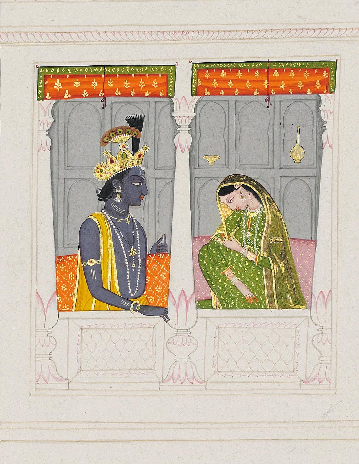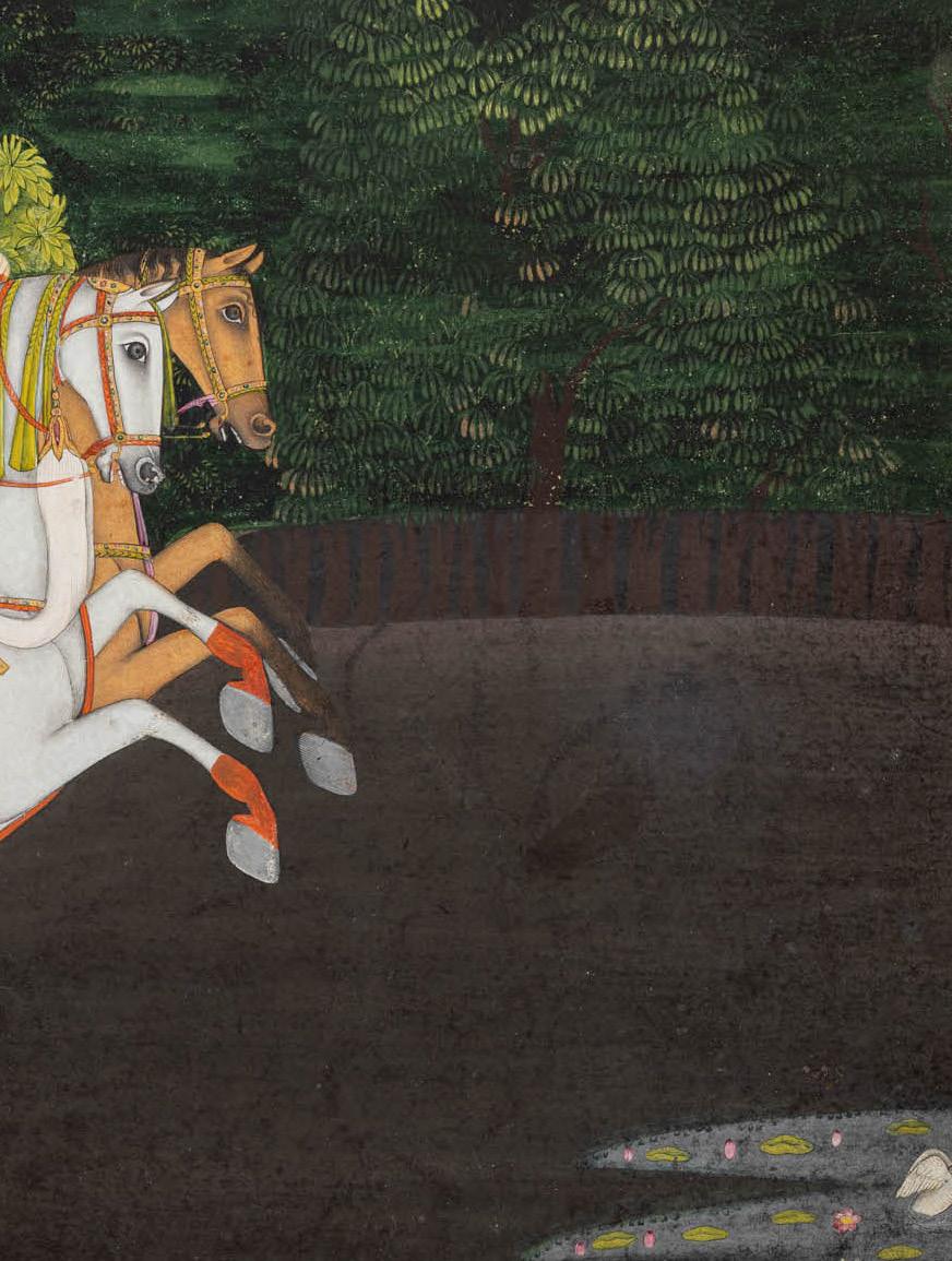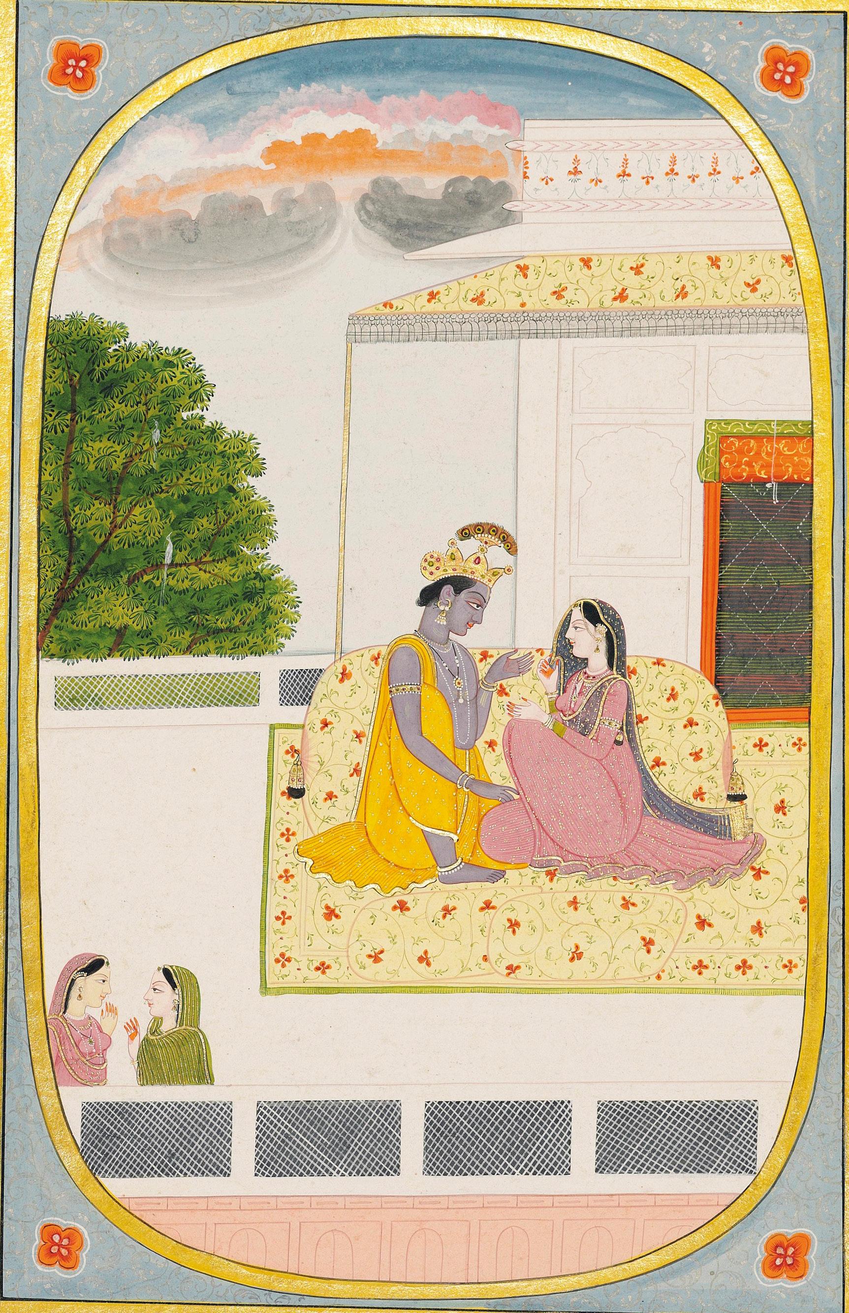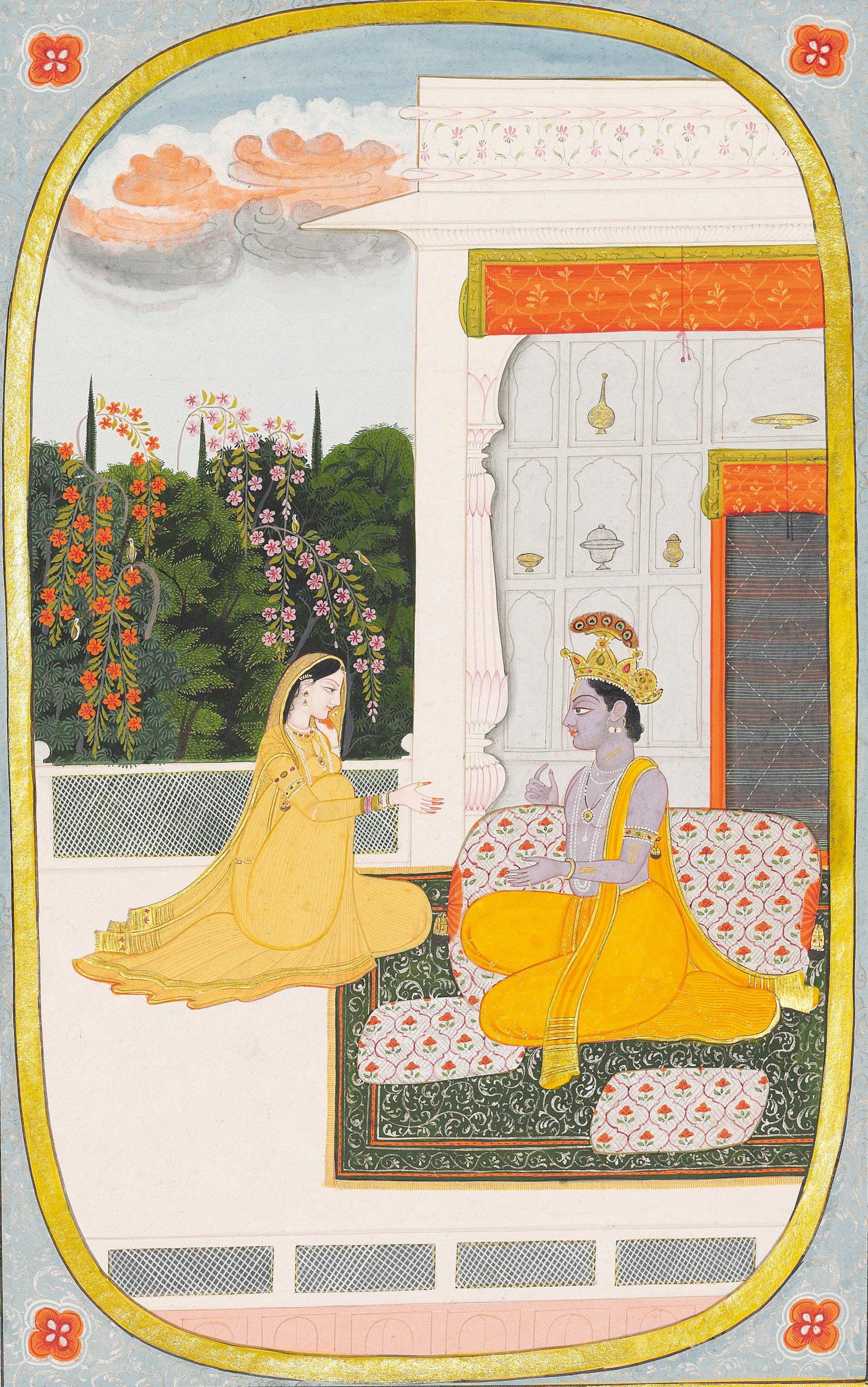 The present painting depicts a portion of the love story between Krishna and Radha. Depicted in the lower left corner along with two other figures is likely the poet Jayadeva, author of the Hindu text, sharing it with worshippers. The verdant landscape represented here is Braj—a pastoral region in north central India along the Jamuna river inhabited by Krishna. A verse at the top of the folio sheds some light on the scenes before us: