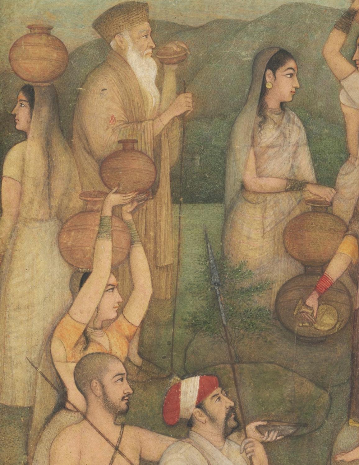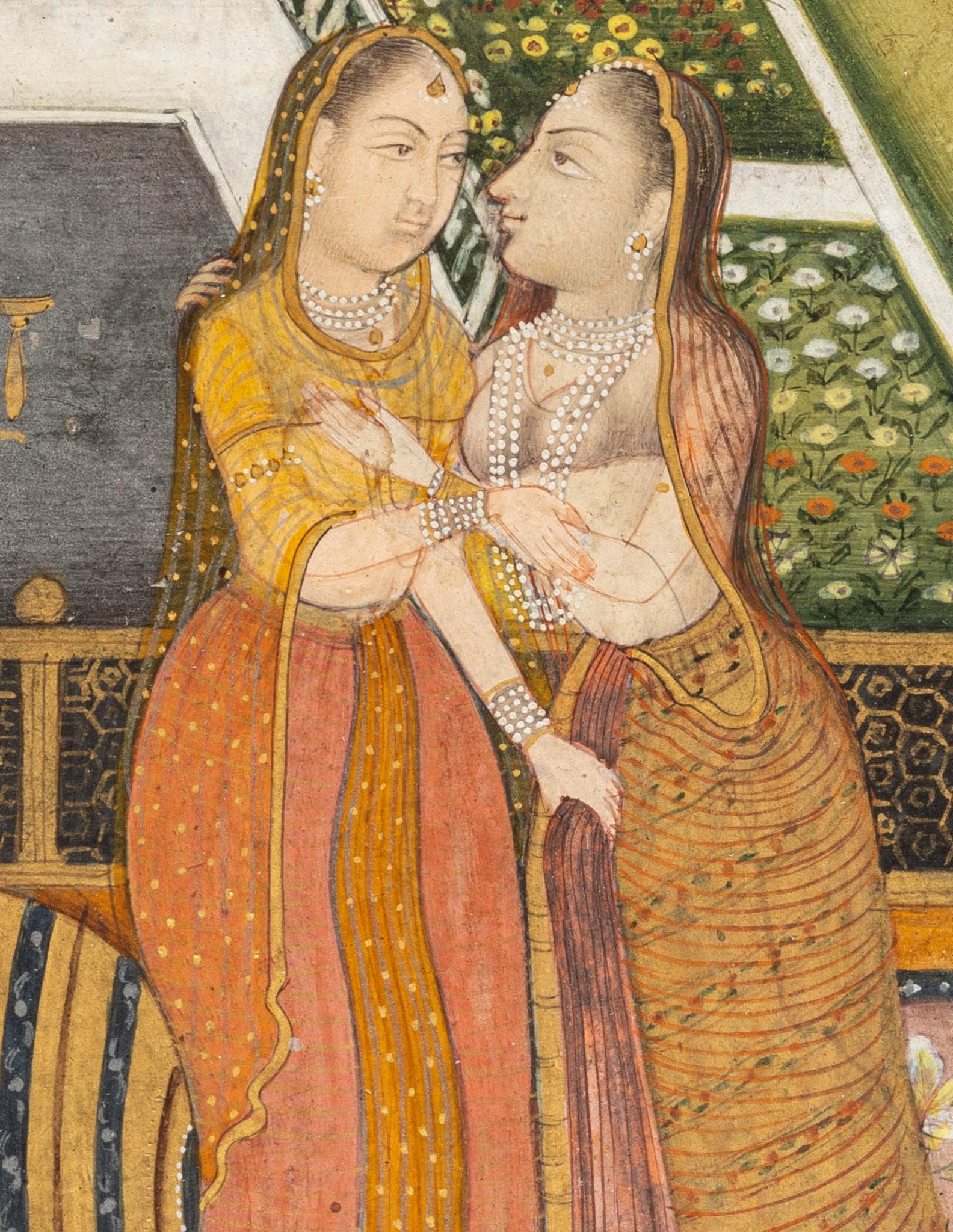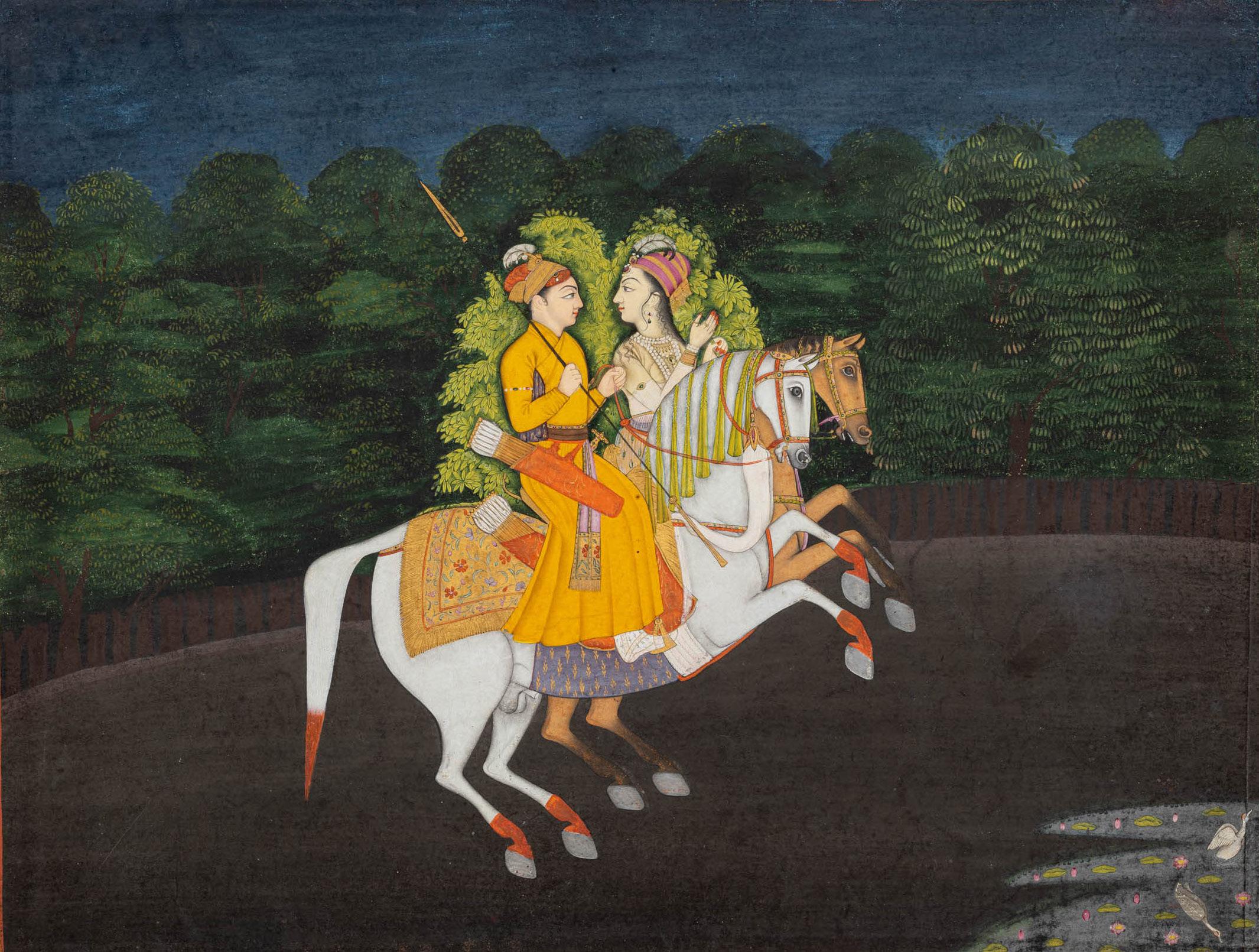 The present painting depicts a portion of the love story between Krishna and Radha. Depicted in the lower left corner along with two other figures is likely the poet Jayadeva, author of the Hindu text, sharing it with worshippers. The verdant landscape represented here is Braj—a pastoral region in north central India along the Jamuna river inhabited by Krishna. A verse at the top of the folio sheds some light on the scenes before us: