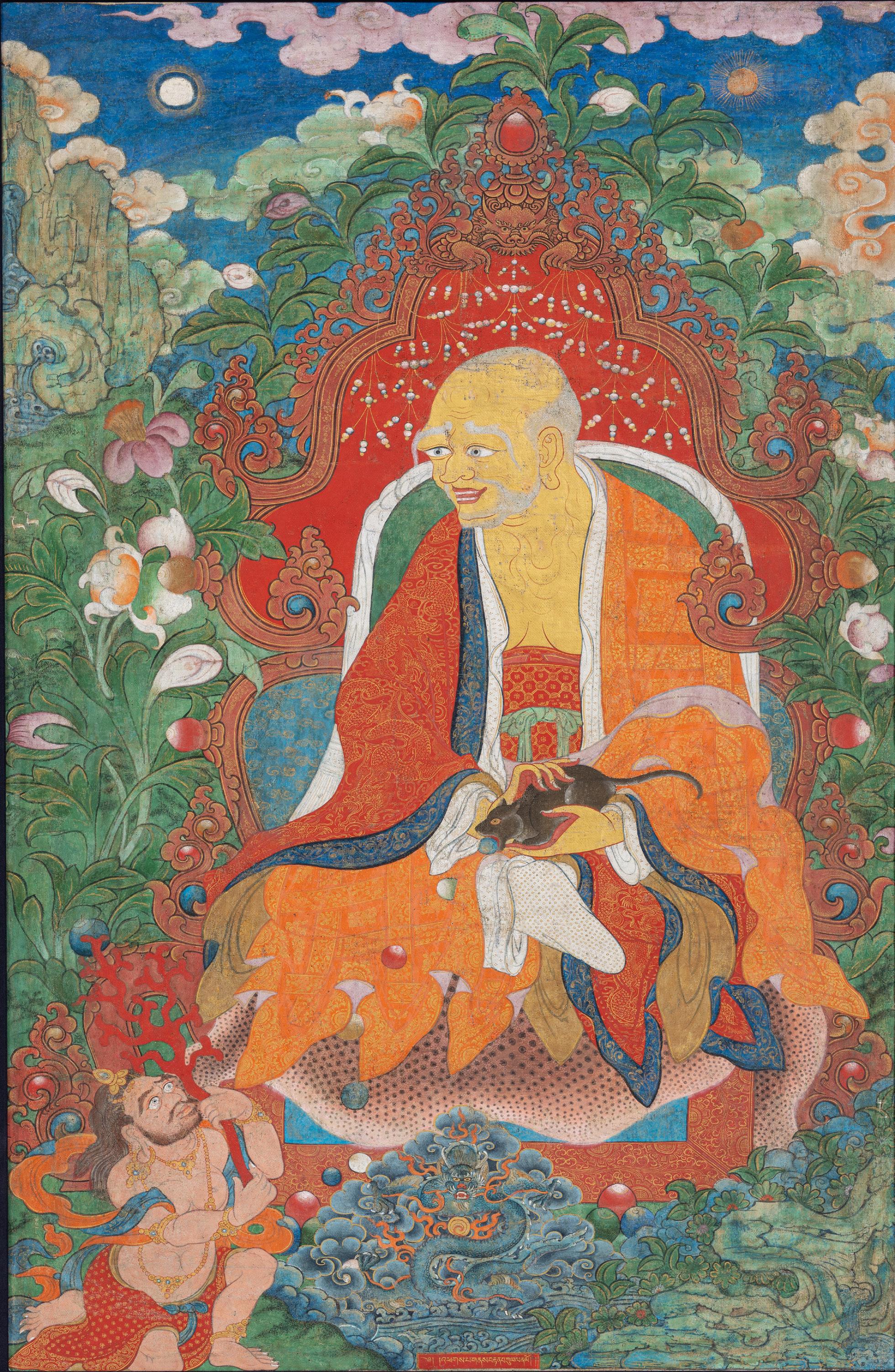 The arhat Bakula was born prior to the historical buddha and achieved enlightenment only eight days after joining the original sangha. Thus, he is praised like a bodhisattva capable of bestowing material needs on those who seek dharma. He is depicted here according to a twelfth- or thirteenth-century Tibetan set of praises written by Kashmiri teacher Shakyashri Bhadra: as an ordained monk seated on an animal skin, holding a mongoose spitting jewels. His old age is conveyed by somewhat hyperbolic wrinkles and white hair and brows, which spill off the monk’s furrowed temples. Below his grand throne topped with a flaming jewel and kirtimukha, a Buddhist mendicant offers the honorable Bakula a coral branch and an auspicious blue dragon appears among clouds and water that coalesce with his curling body.