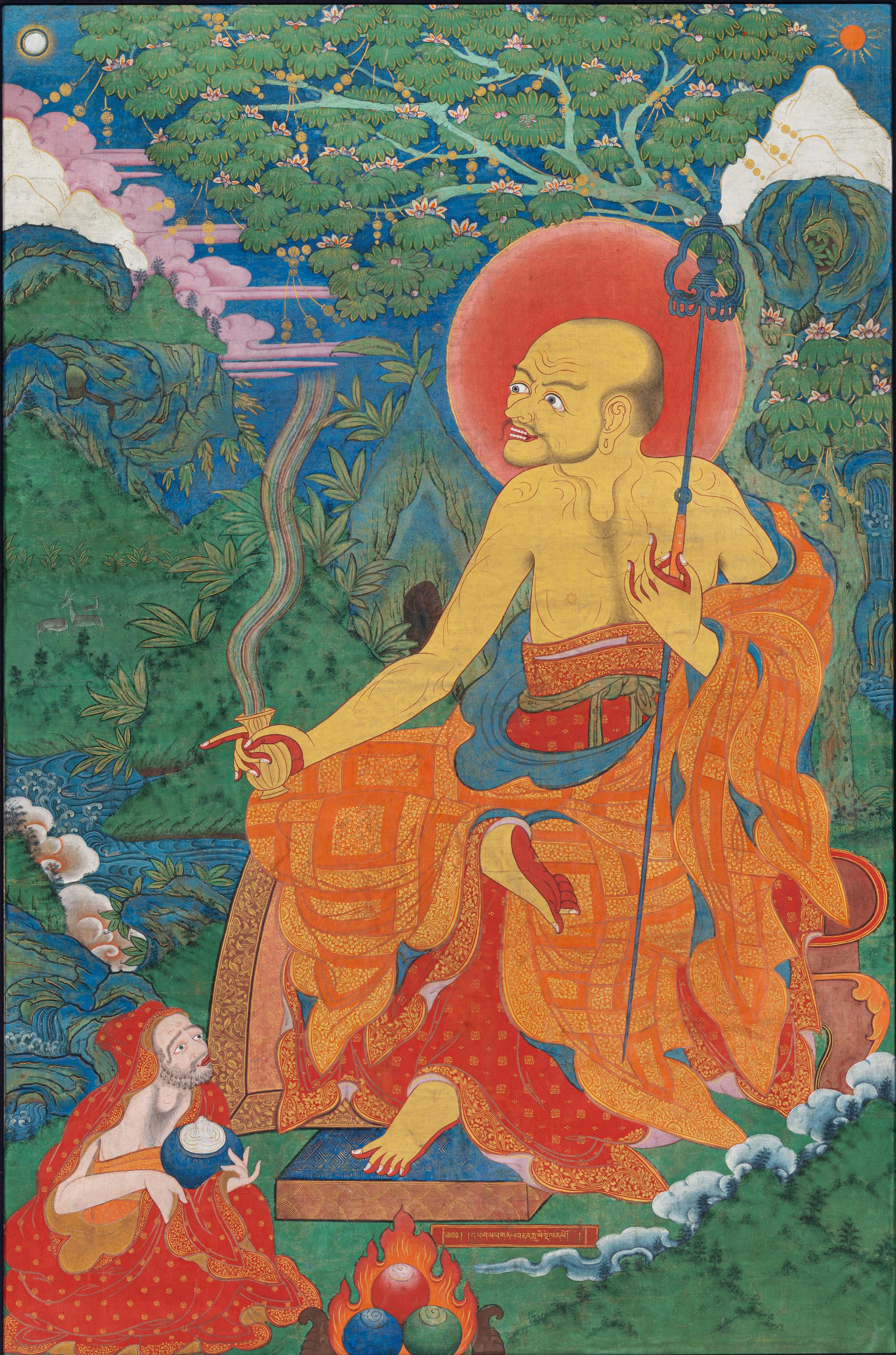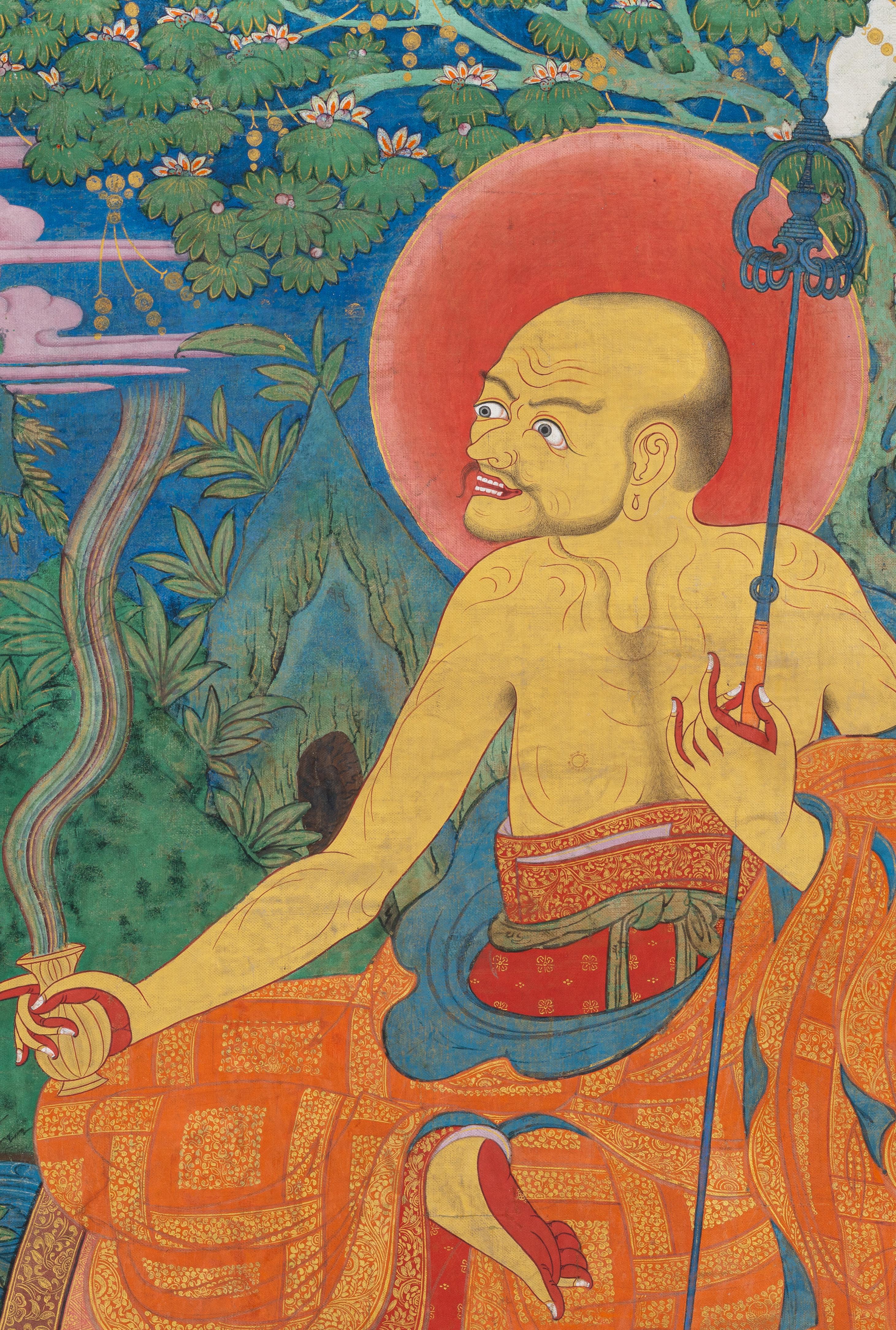 The Sixteen Arhats emerge out of an early Sanskrit Buddhist text called the Nandamitra describing enlightened human disciples of the historical Buddha Shakyamuni who vow to remain on earth until the future buddha, Maitreya, arrives. The present aesthetic form, however, is the result of earlier Chinese models of these figures referred to as ‘luohan’ (the Chinese equivalent of the Sanskrit term ‘arhat’). Tibetans, however, refer to many of these figures as neten (Tib. Wylie: gnas brten) which equates to the Sanskrit term for elder (sthavira). Arhatship is a level of buddhist attainment for which Tibetans use the word drachompa (Tib. Wylie:. dgra bcom pa). The difference in such terms, therefore, leaves in question what status Tibetan Buddhists attribute to some of these figures Western art historians describe as “arhats.” The present figure Kanakavatsa and the other fifteen arhats are, nevertheless, very significant figures in Tibetan Buddhist art.