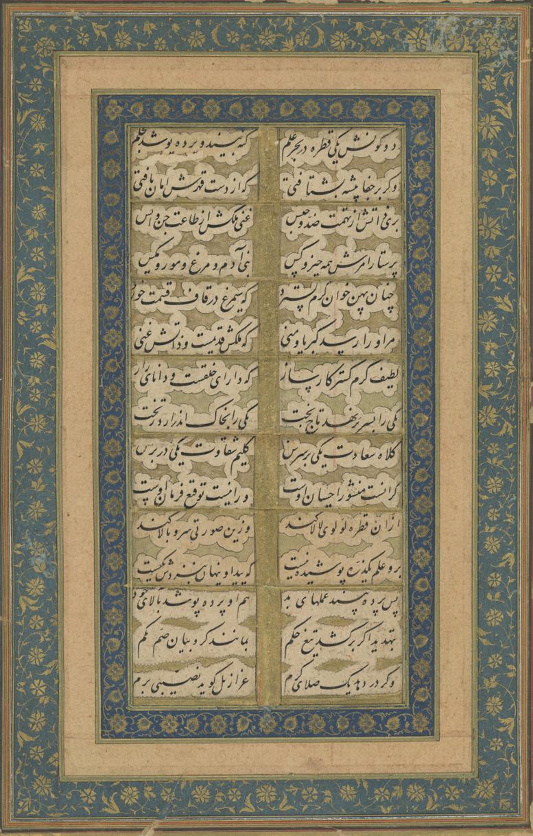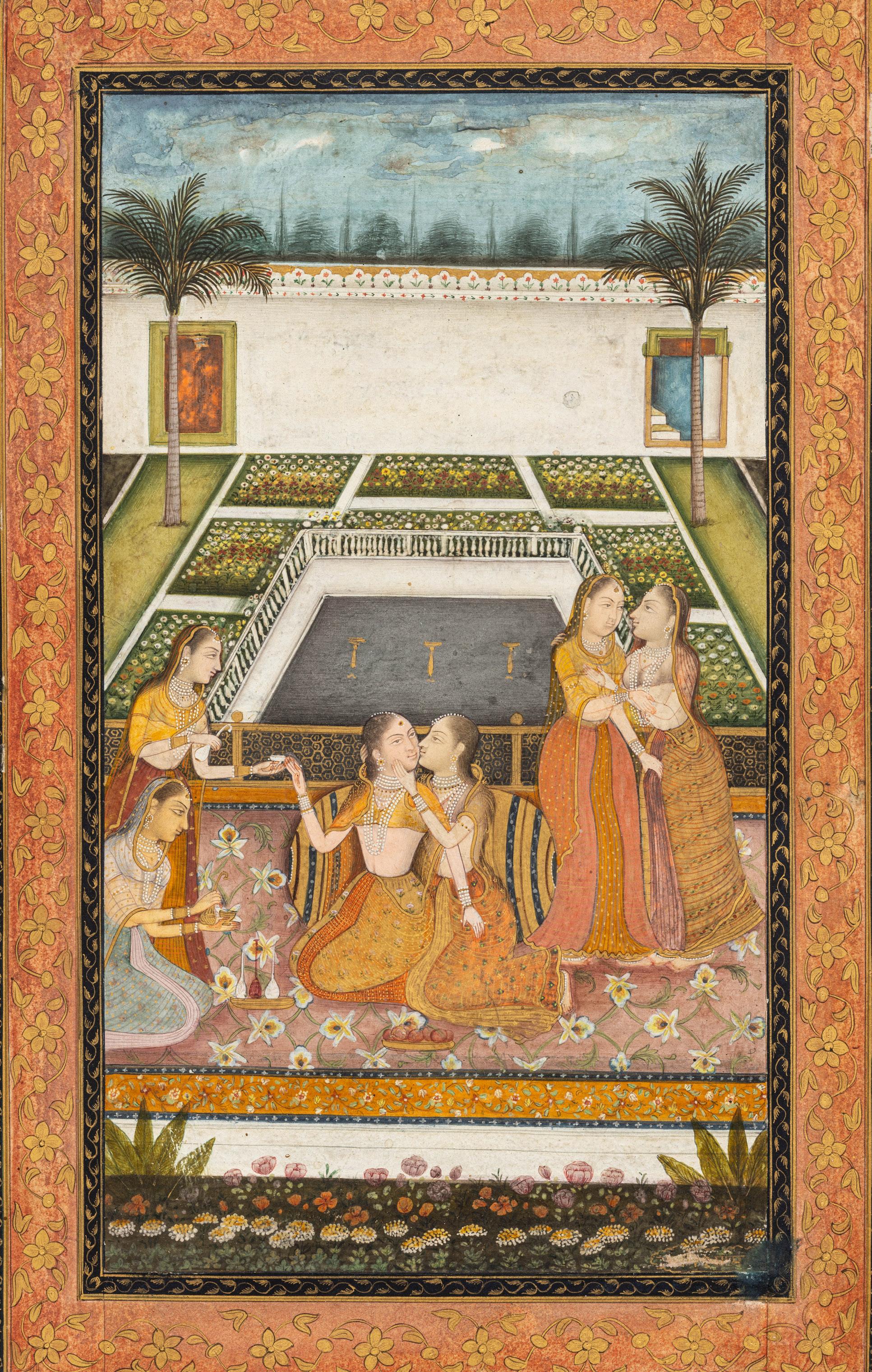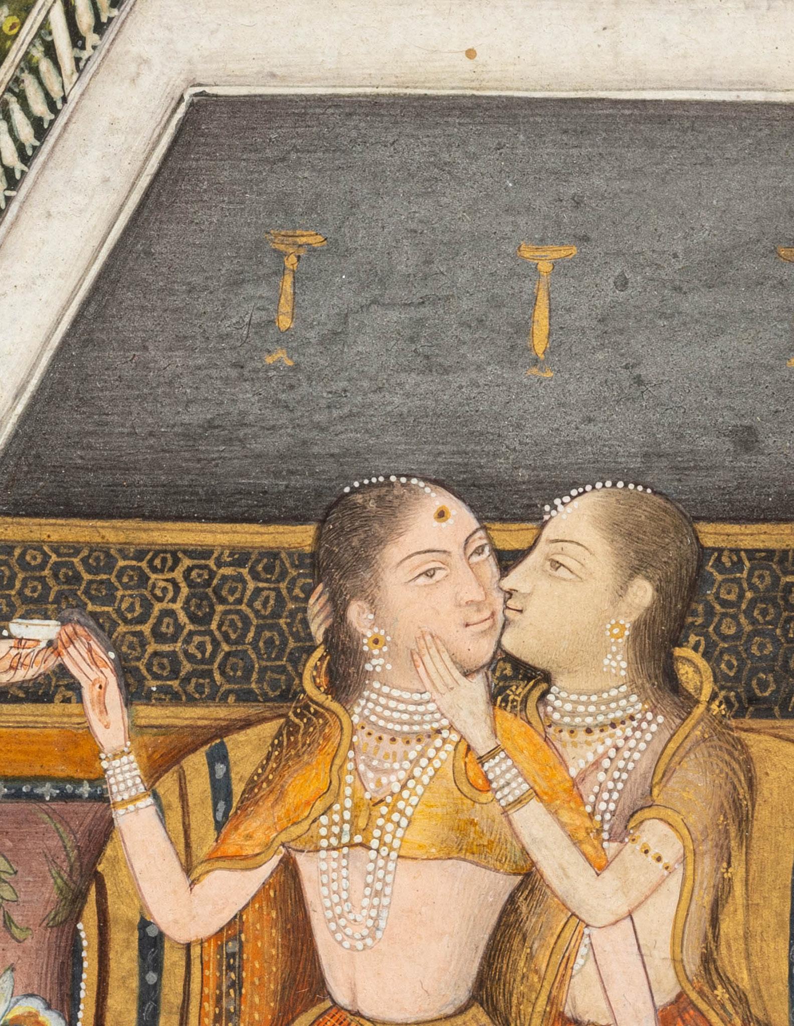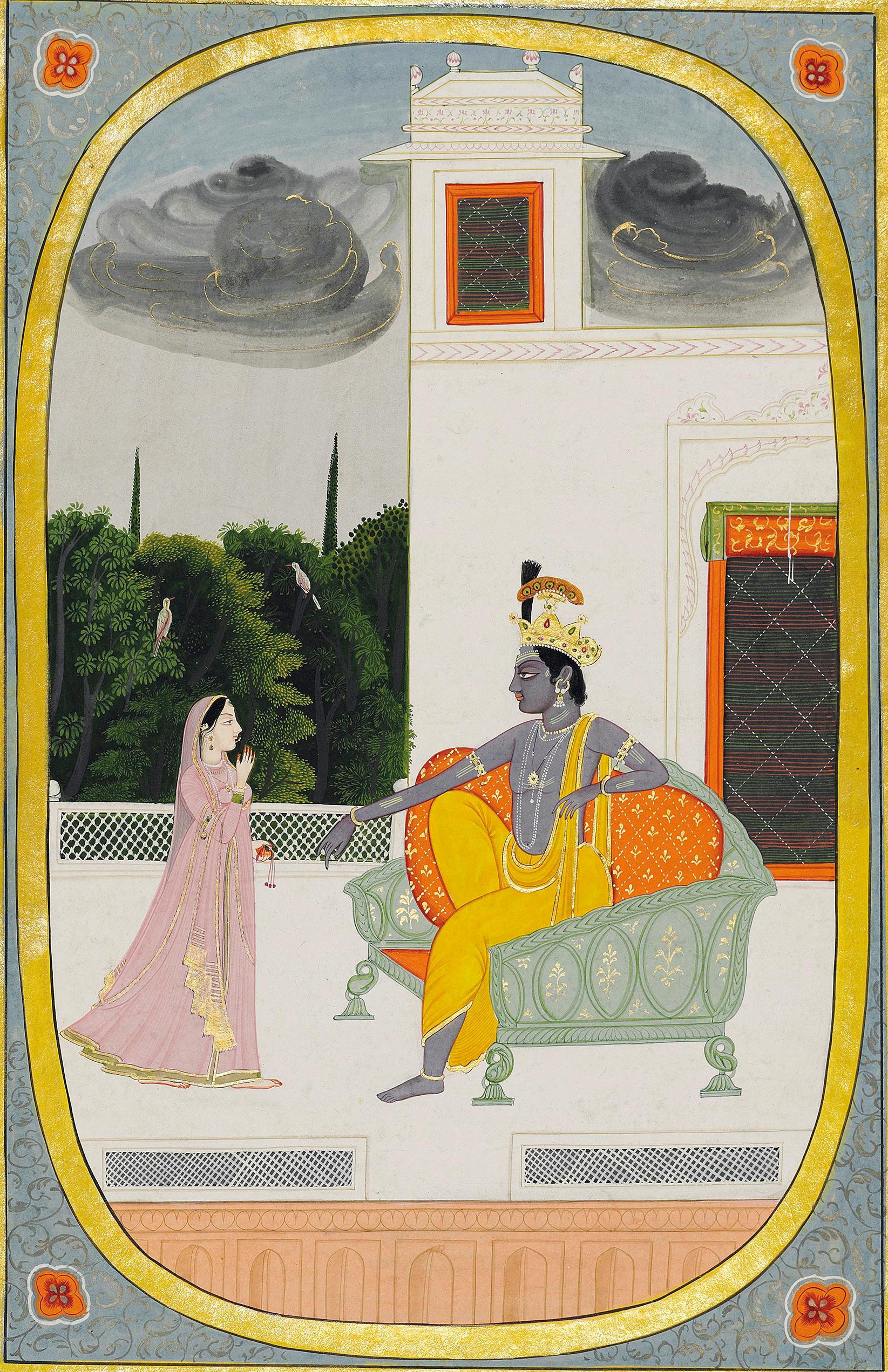 The identity of the adored male herein is revealed by his sky-blue skin and the obscured peacock feather on the proper-left side of his five-pointed diadem. Krishna’s crown style resembles that exactly of a Bikaner painter Ibrahim’s 1692 Rasikapriya illustration in the collection of the Brooklyn Museum of Art (acc. 81.192.3). The present painting exhibits figures with cinched waists, the use of linear perspective, and a gold-speckled border—all typical features of paintings from Bikaner, a major center of painting of the seventeenth and eighteenth centuries within Rajasthan. The inscription which appears under the lower right corner of the painted image refers to the divine Krishna in a loving Urdu epithet, “Mohan Lal.”