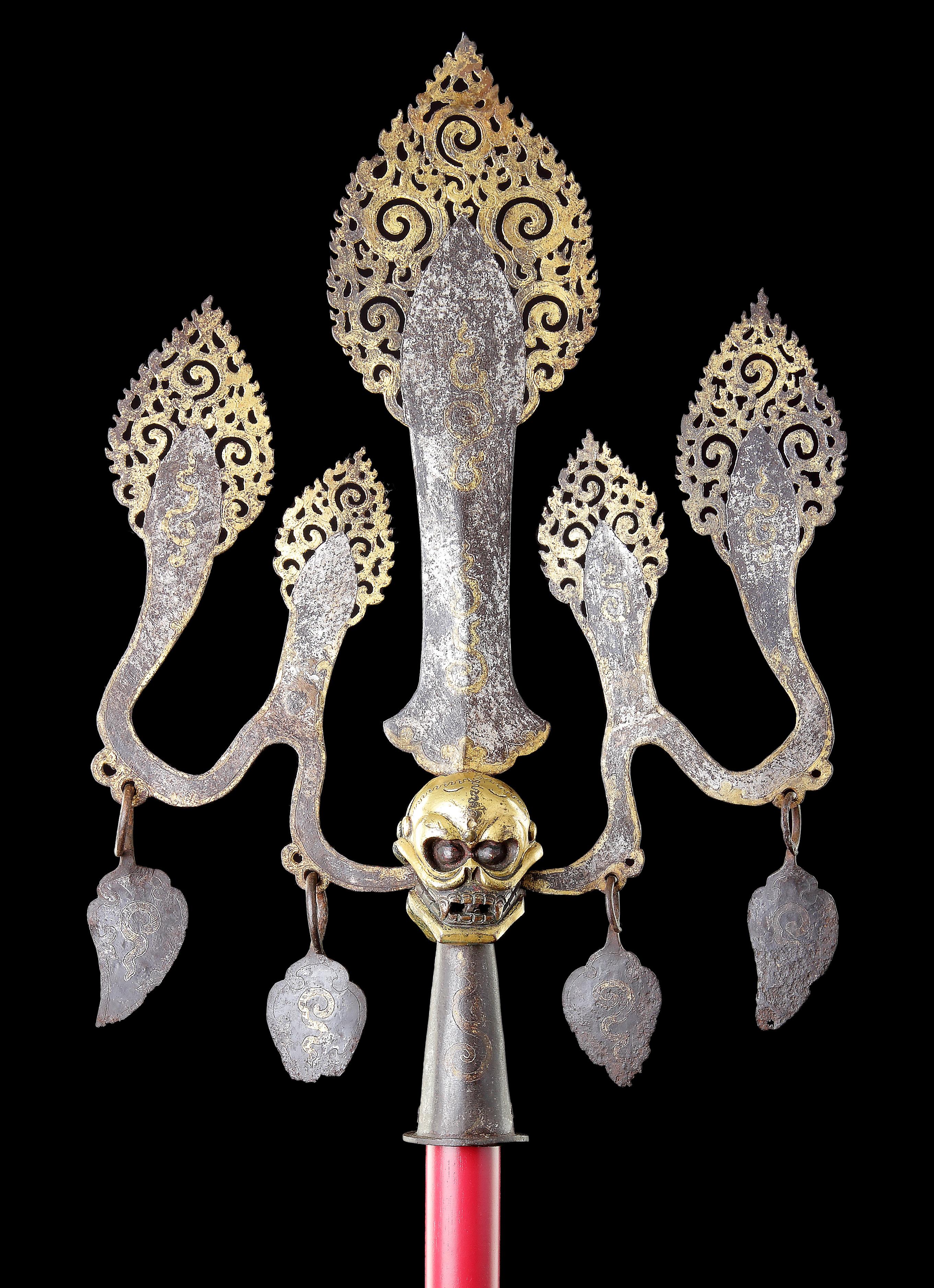 This five-pointed spear has stylized prongs that blaze with gilded scrolling flames, complementing the gilded skull set in its base. As a weapon in the hands of wrathful deities, the trident symbolizes, among other things, the destruction of the three poisons that drive suffering in samsara: ignorance, greed, and hatred. Trident banners are often used to decorate the roofs of protector chapels dedicated to such wrathful deities.