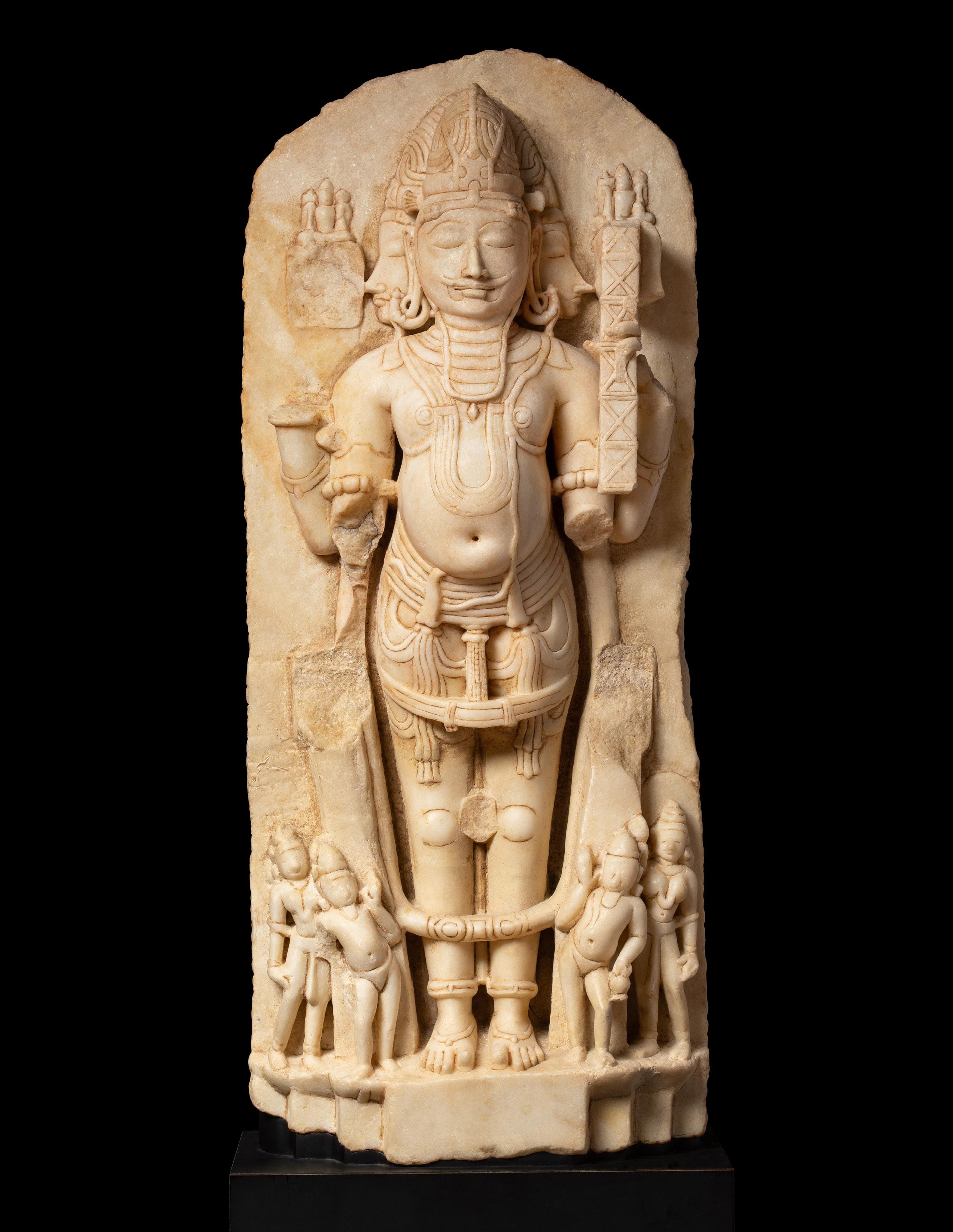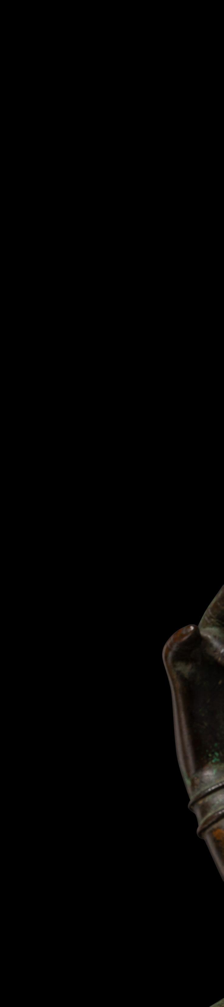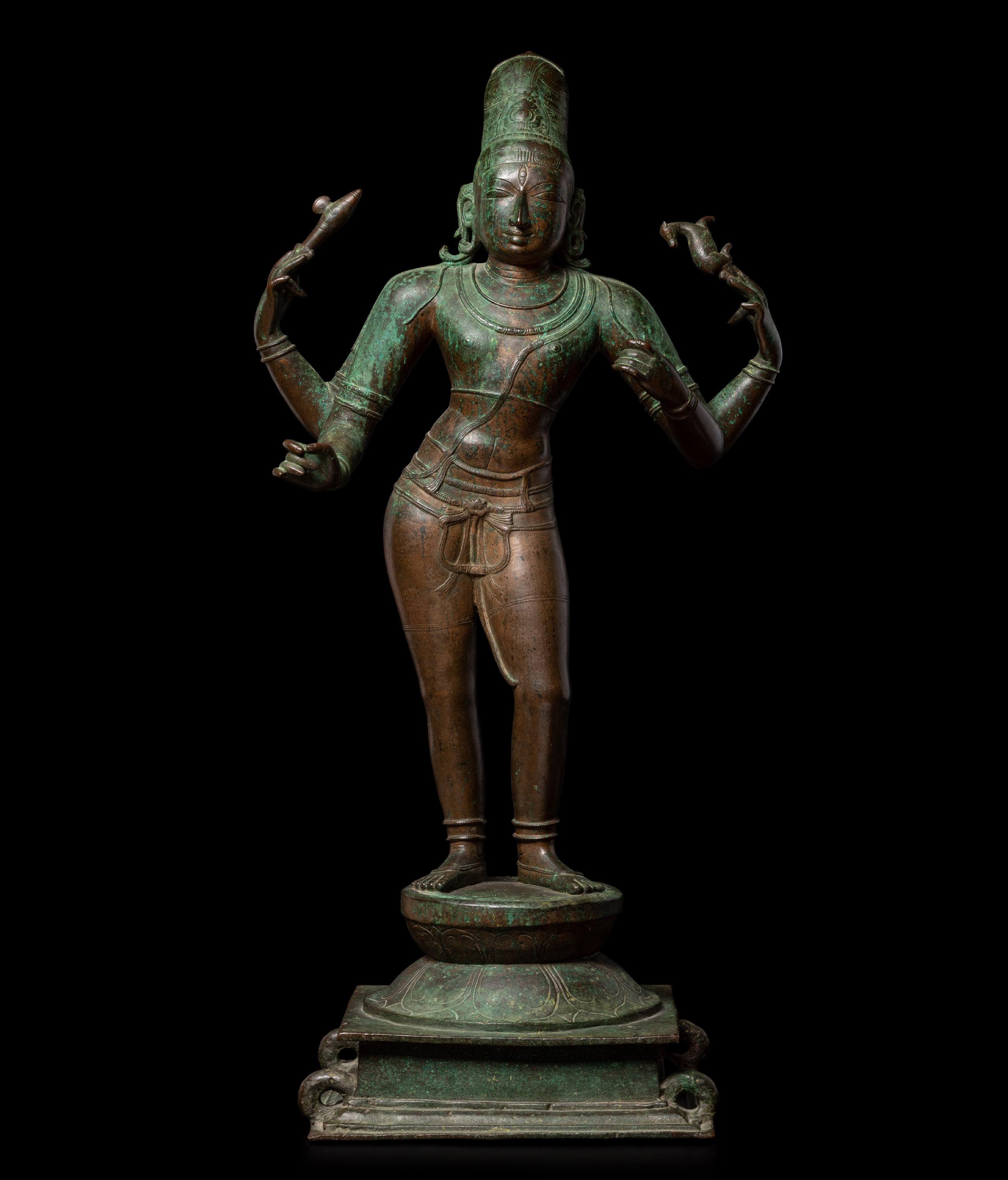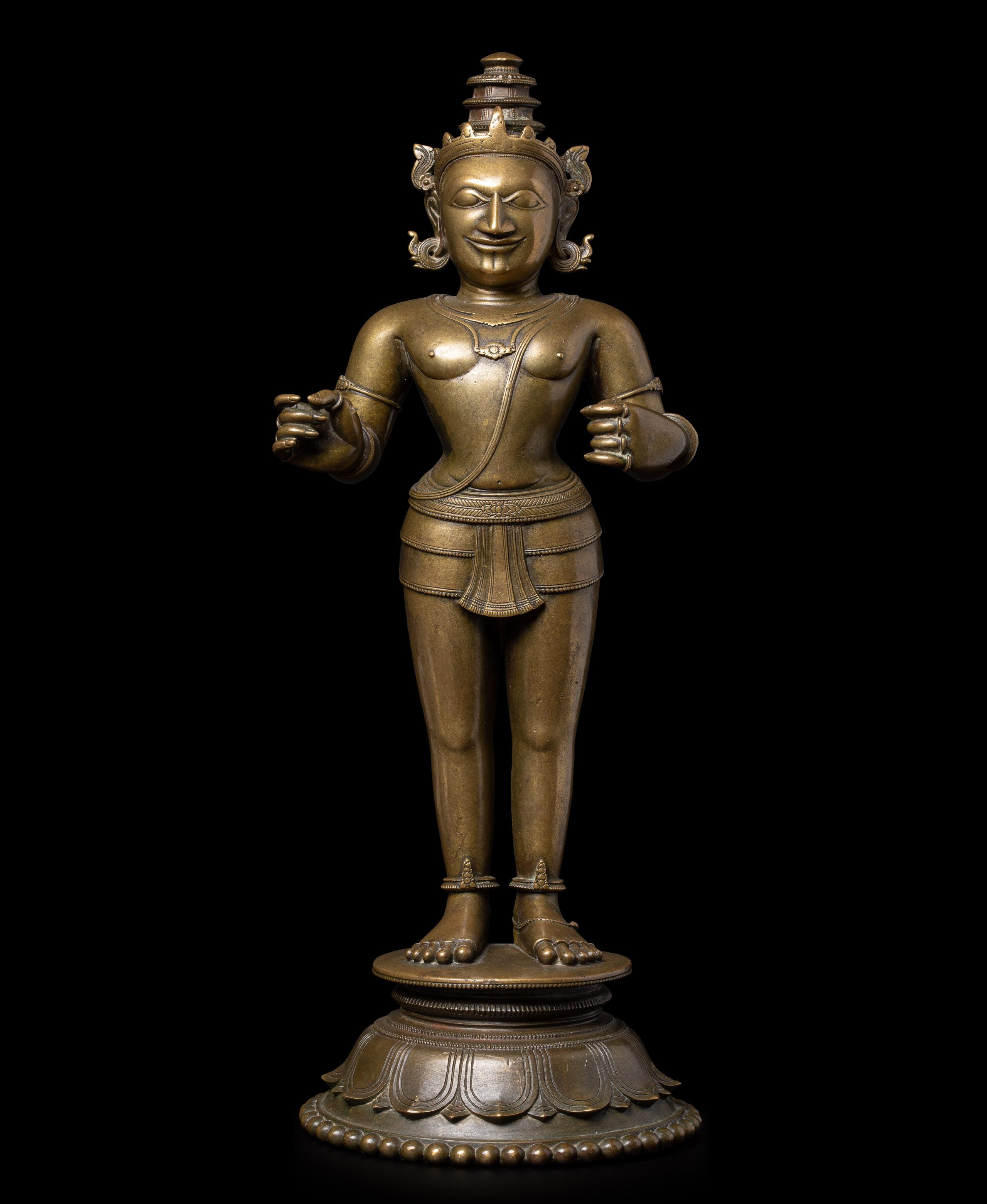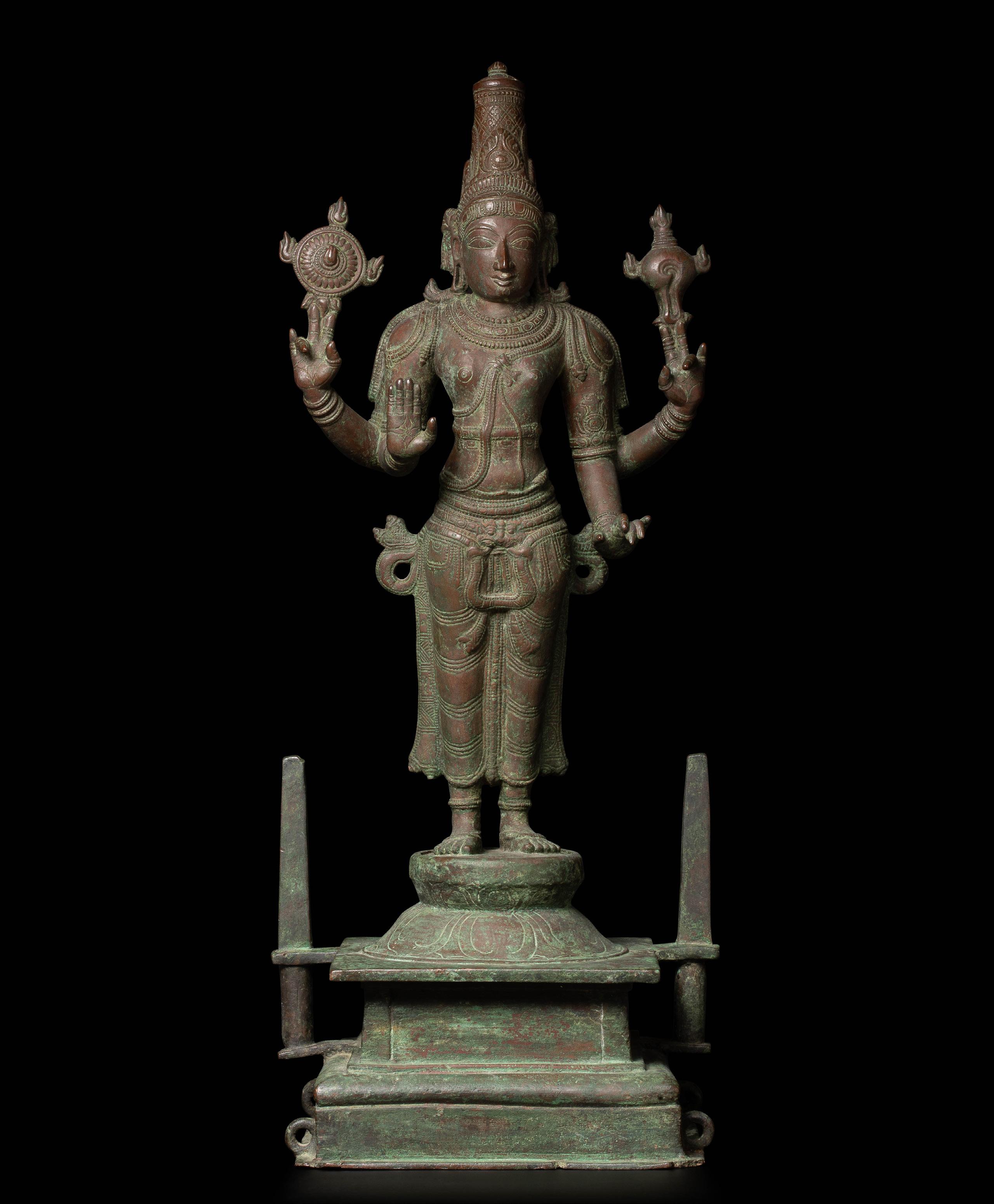 The present figure is representative of the Vijayanagara style, with rigid pleats descending down the figure’s dhoti and incised petals on the lotus base. Vishnu’s cylindrical crown is also shared by most Vijayanagaraperiod bronzes, including a fifteenth-century figure of Varaha in the Victoria & Albert Museum (IM.6-1924). This bronze Vishnu, however, has a lightness and life which comes through his carefully-modelled hands and soft belly. Such details transform his symmetrical and impassive countenance into one of divine power and perfection.