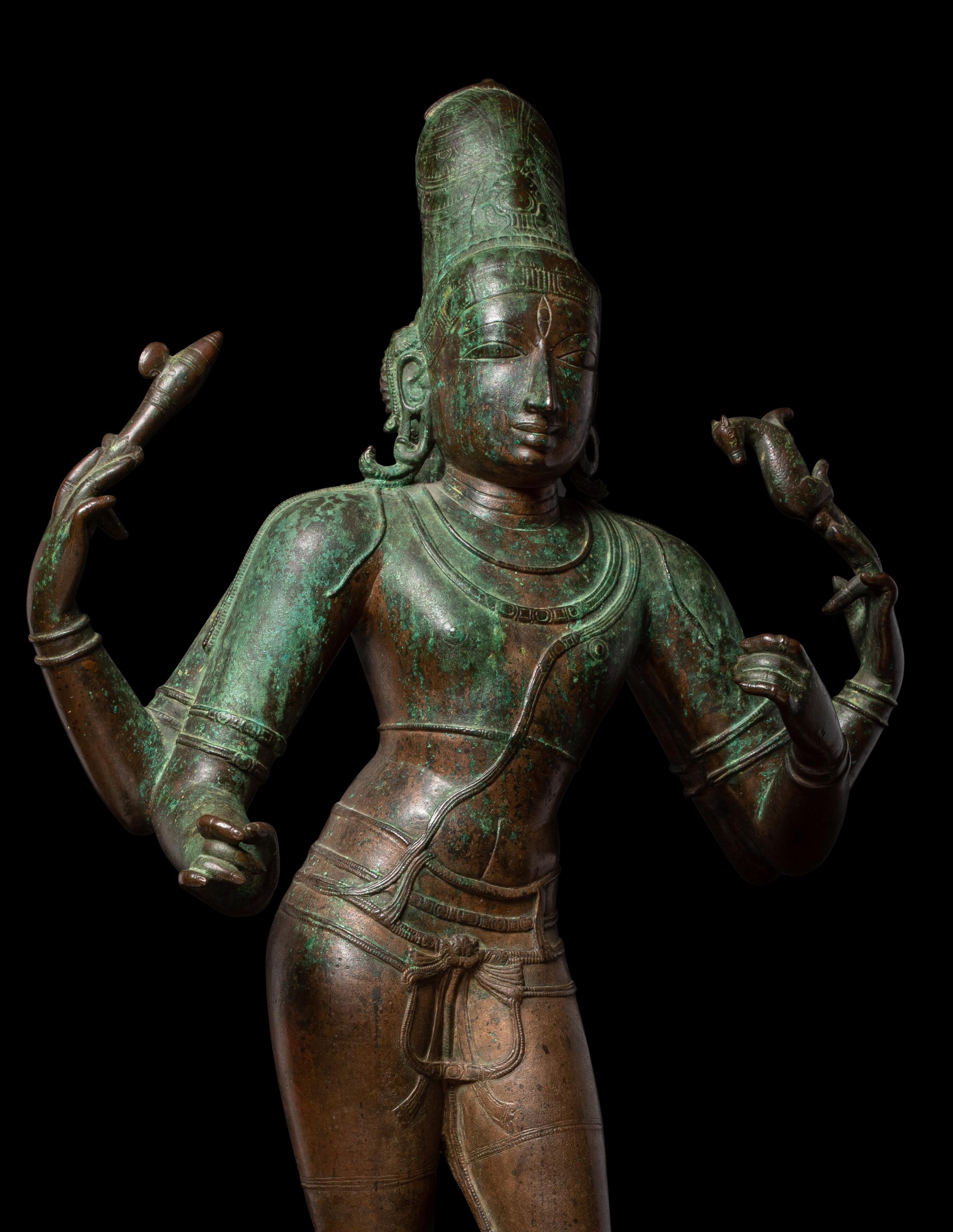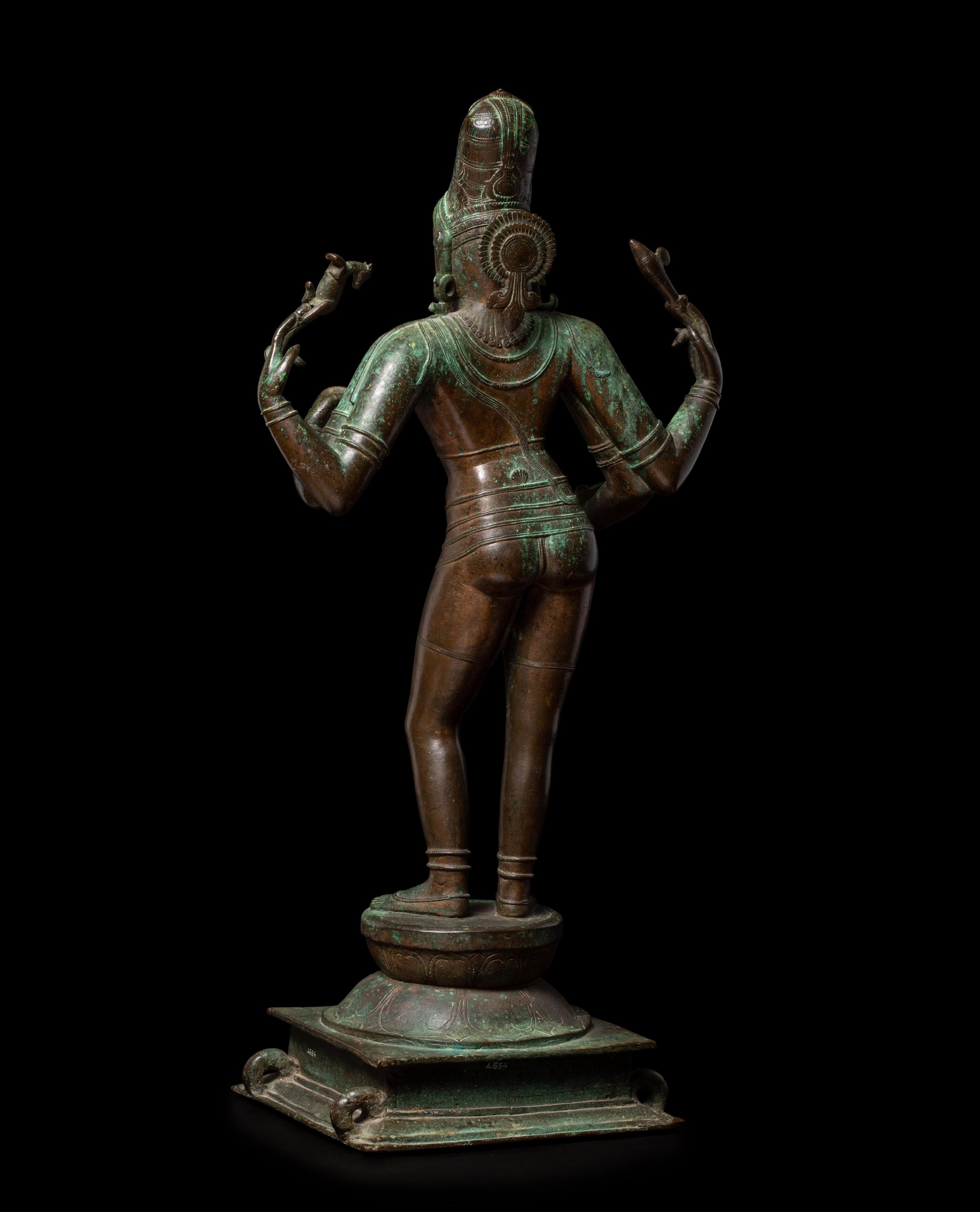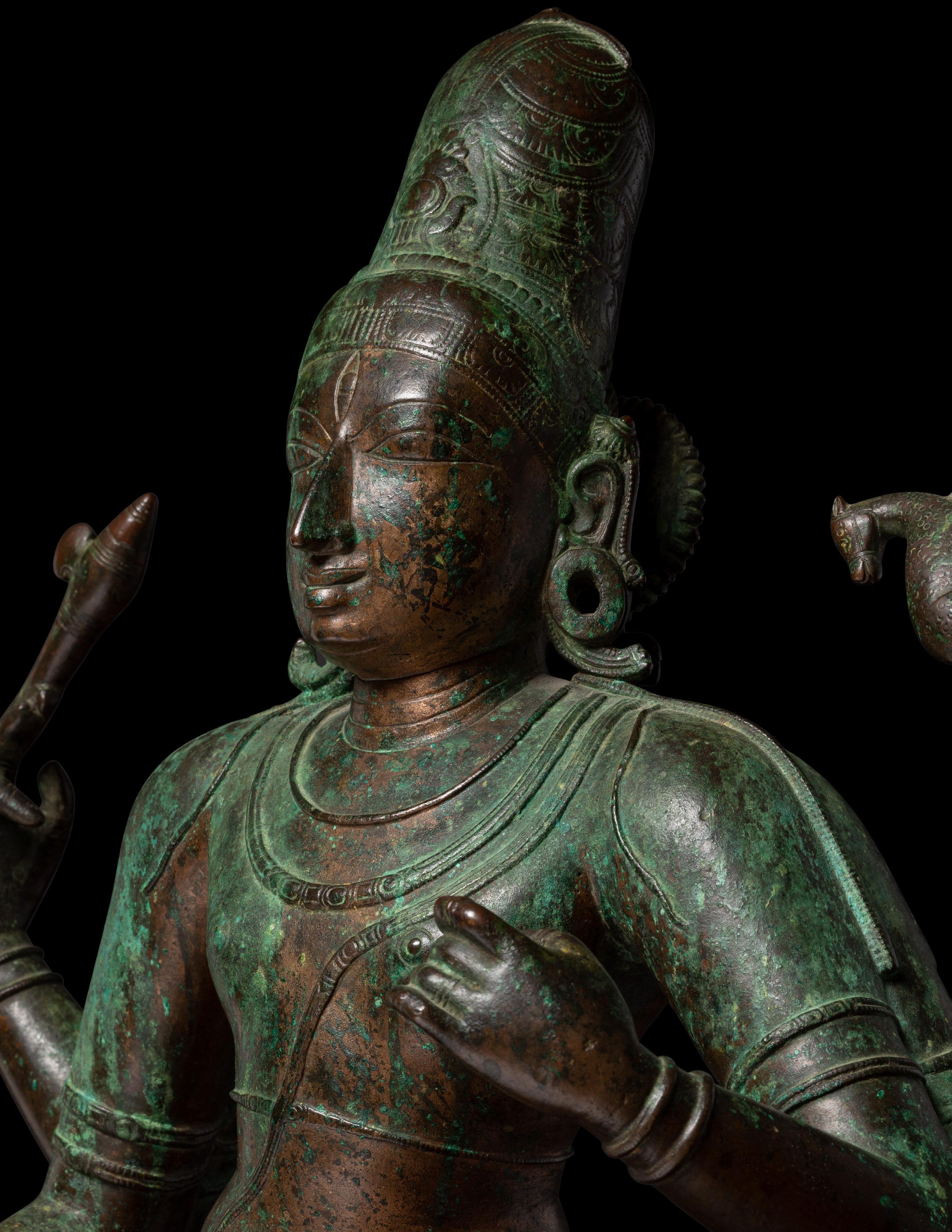 Sculptors of the Vijayanagara period inherited their techniques and style from the master casters of the Chola period. The style of sculpture is, however, distinguished from the earlier period by standardization of deities’ ornaments and a more stolid appearance, overall—perhaps because of the volume of image production during this period of great Hindu patronage. Just as those created in Tamil Nadu in prior centuries, the present sculpture was both an important temple commission as well as an object of transient worship, as it is fitted for processions with bronze loops and tangs at its base.