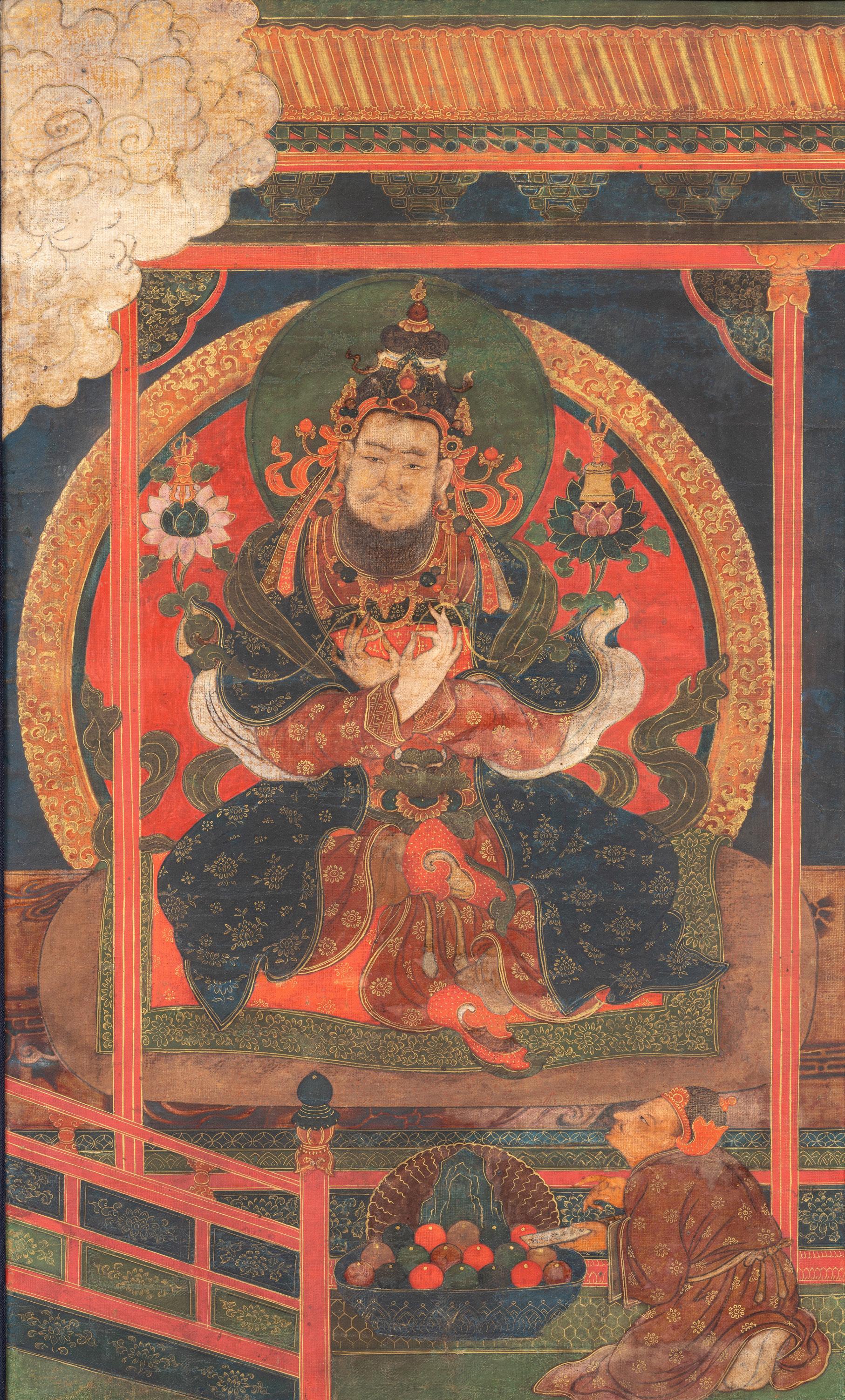 The present painting is a rare depiction of King Ralpachen, as he is typically pictured with Songtsen Gampo and Trisong Detsen, who as a triad comprise the “Three Dharma Kings.” Under King Ralpachen (r.815-839), the forty-first king of Tibet, the Tibetan Empire reached its greatest expanse. Creating artworks such as the present, honoring Tibetan royalty of the past, became a popular practice under the period of consolidation under the Ganden Phodrang in the seventeenth century.