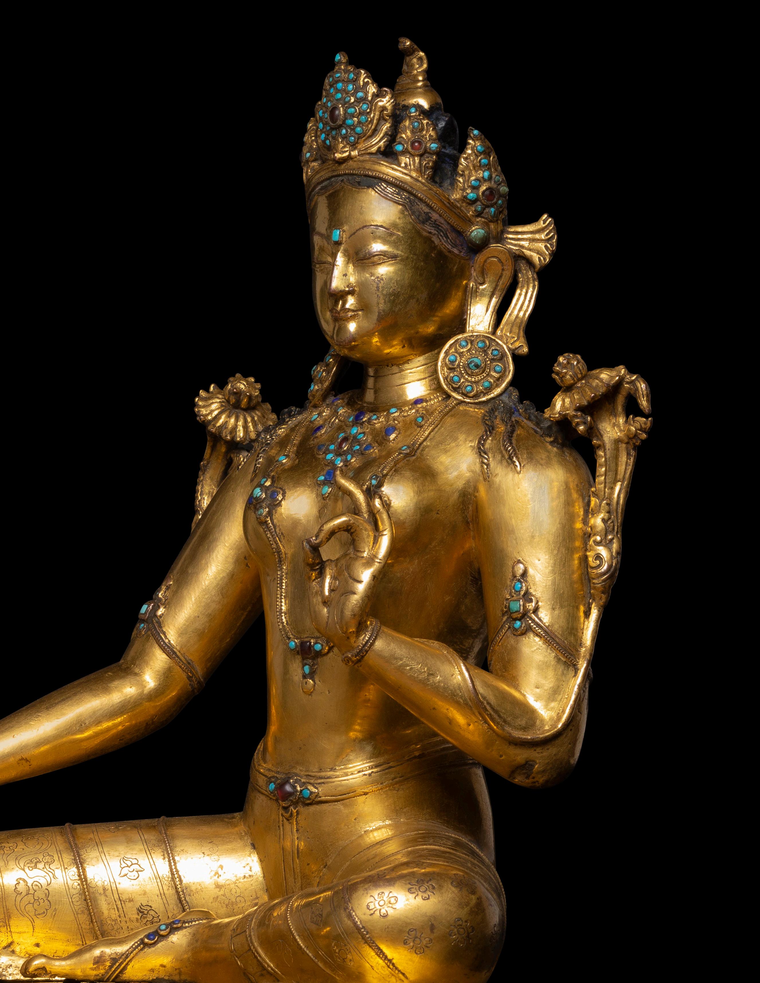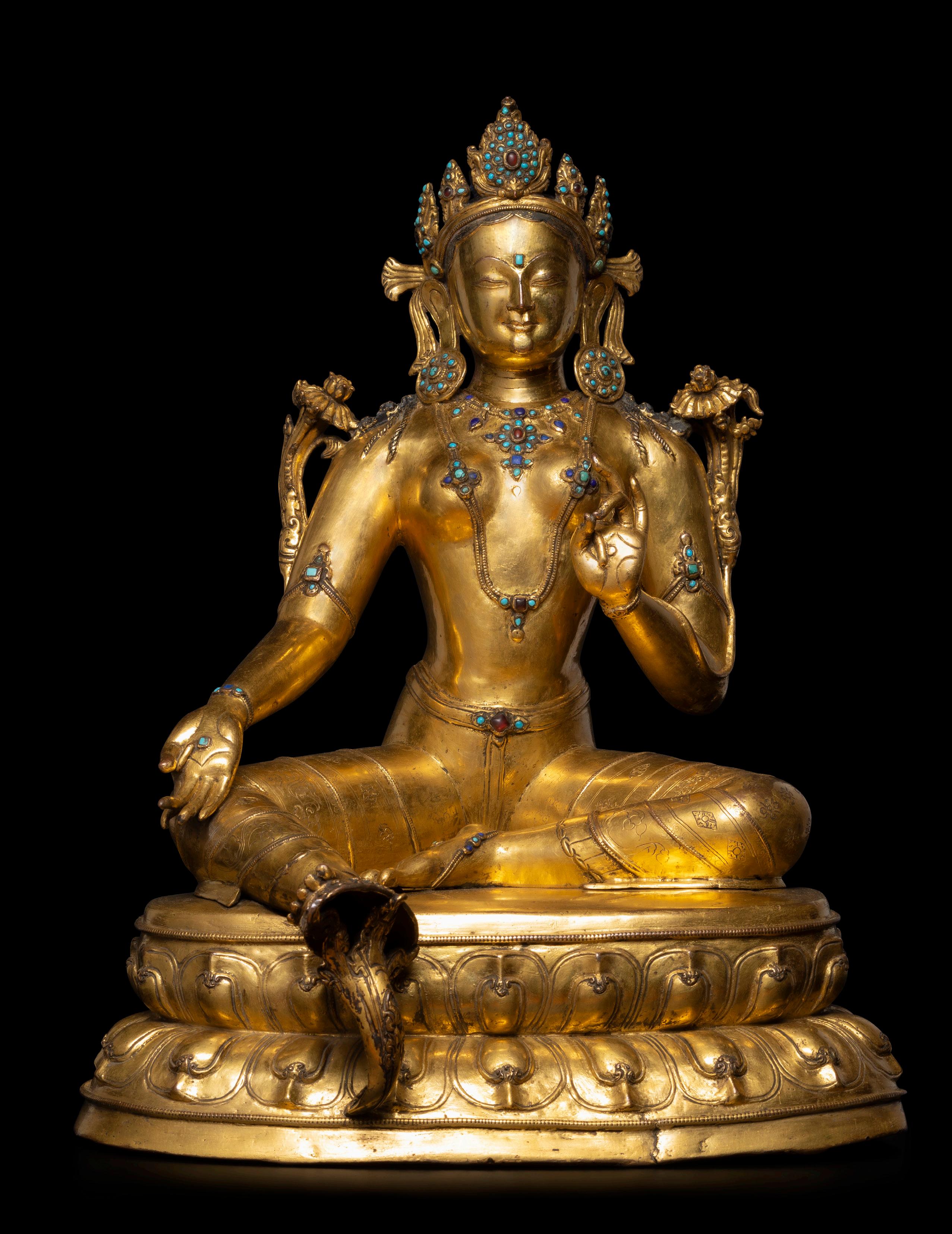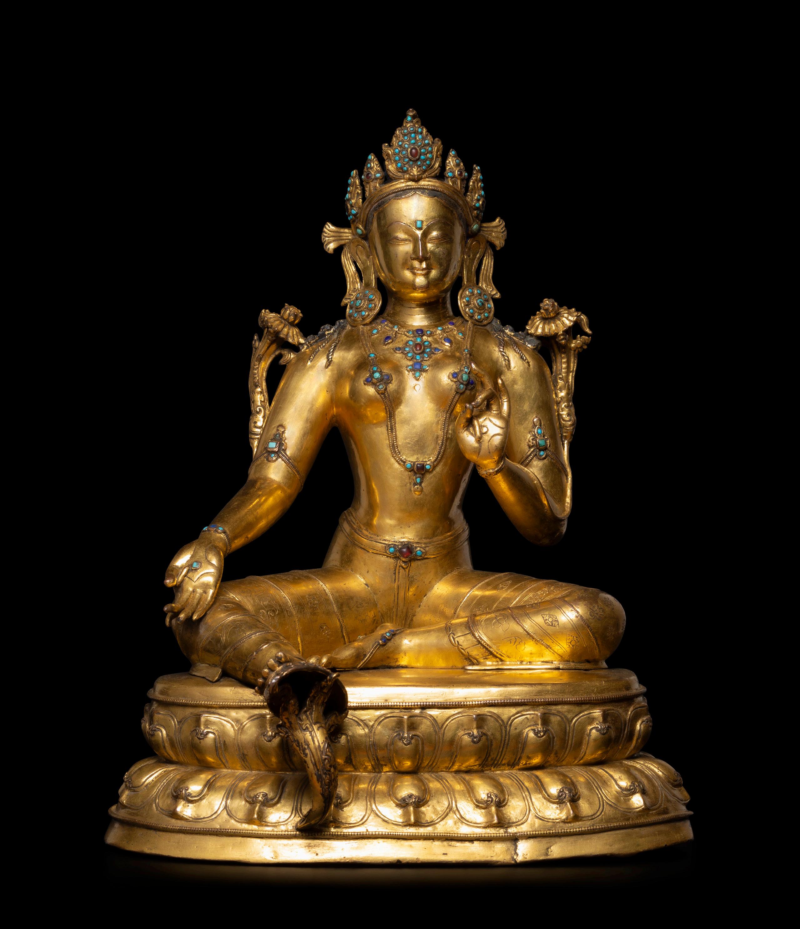 The present masterwork exhibits a Nepalese style developed for Tibetan patrons in central Tibet. Previously, the present sculpture was appropriately likened to murals of the Five Tathagatas in the South Chapel of Shalu monastery (just south of Shigatse), painted in the second quarter of the fourteenth century. The crown in particular can be found in the Belri or Nepalese style painting tradition that flourished in Tibet, epitomized by the fifteenth-century Gyantse Kumbum murals of Tsang Province (south-central Tibet). Prominent west-central Tibetan monasteries of the time, such as Shalu, Gyantse, Ngor, and Sakya, were particularly active in reinterpreting and perpetuating traditions associated with the Indo-Nepalese artistic styles imported from Nepal during the second dissemination of Buddhism. It is possible that the present sculpture, given its magnificent quality and size, was created for such a context. This large and beautiful figure of Green Tara is, admittedly, more pleasing in proportion, countenance, and ornamentation than a comparable gilt-bronze figure of Tara held in the aforementioned and important Shalu monastery (see U. von Schroeder, Buddhist Sculptures in Tibet, 2001, p. 967, no. 233B). It is an undeniable masterwork of art.