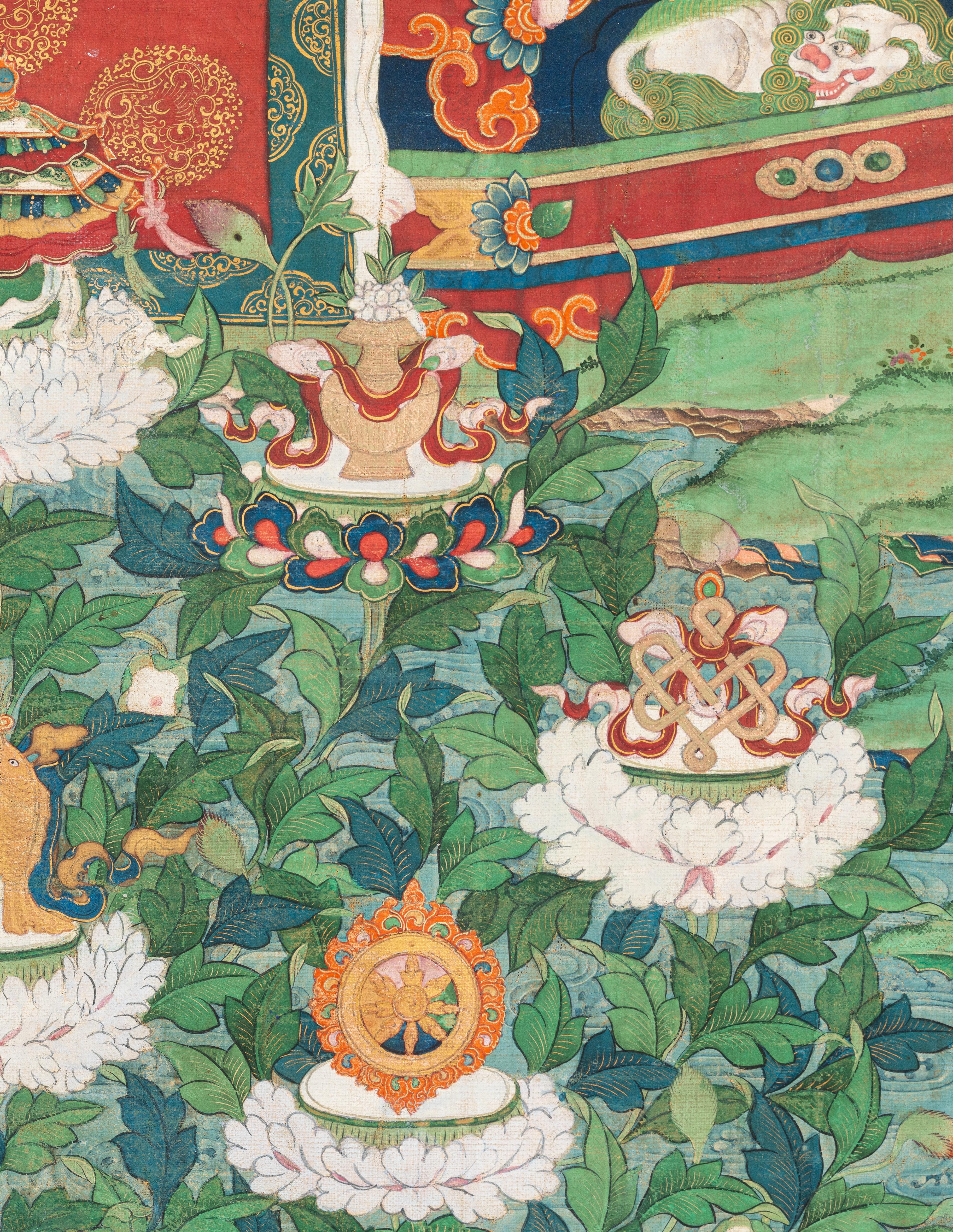 Compare the present painting to those associated with the eighteenth-century Xumi Fushou temple, erected by the Qianlong Emperor as a replica of Tashi Lhunpo monastery for the visit of the sixth Panchen Lama, such as that of Samantabhadra in the Asian Art Museum of San Francisco (acc. B72D67). While the compositional arrangement is quite similar in style, the multi-colored saw-tooth edge clouds in the present work, as well as the ornamented trees in the forefront, and the small deer hidden in the landscape to the bodhisattva’s right, point to a more explicit influence of the contemporaneous central Tibetan styles on the present work of art.