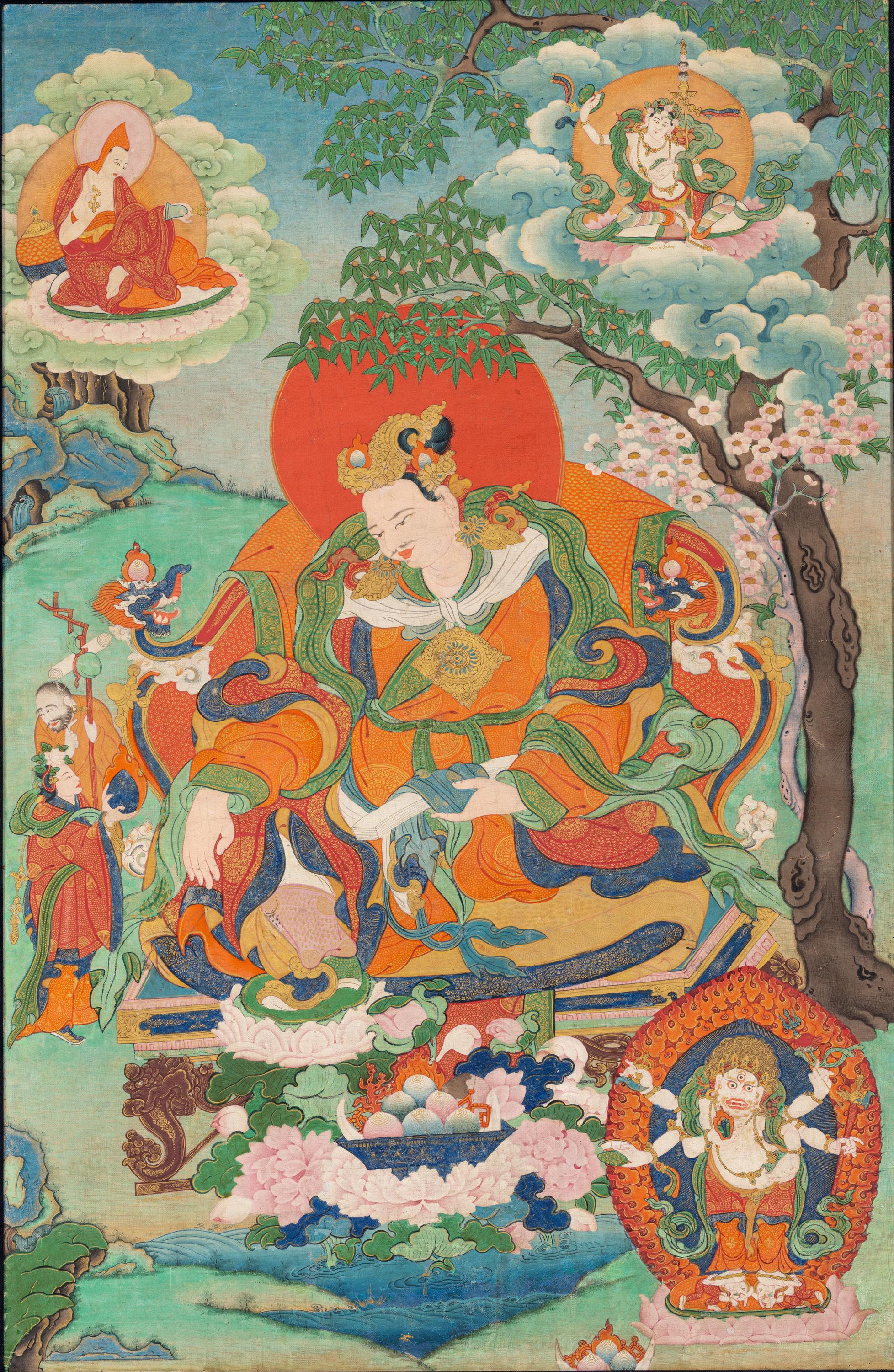 The Secret Wisdom dakini (labeled ‘Sangwa Yeshe’ in Tibetan) floats in the upper right corner of the composition and Guru Vimala (labeled ‘Lama Dri-mamed’) floats in the upper left holding a vajra and a bell.