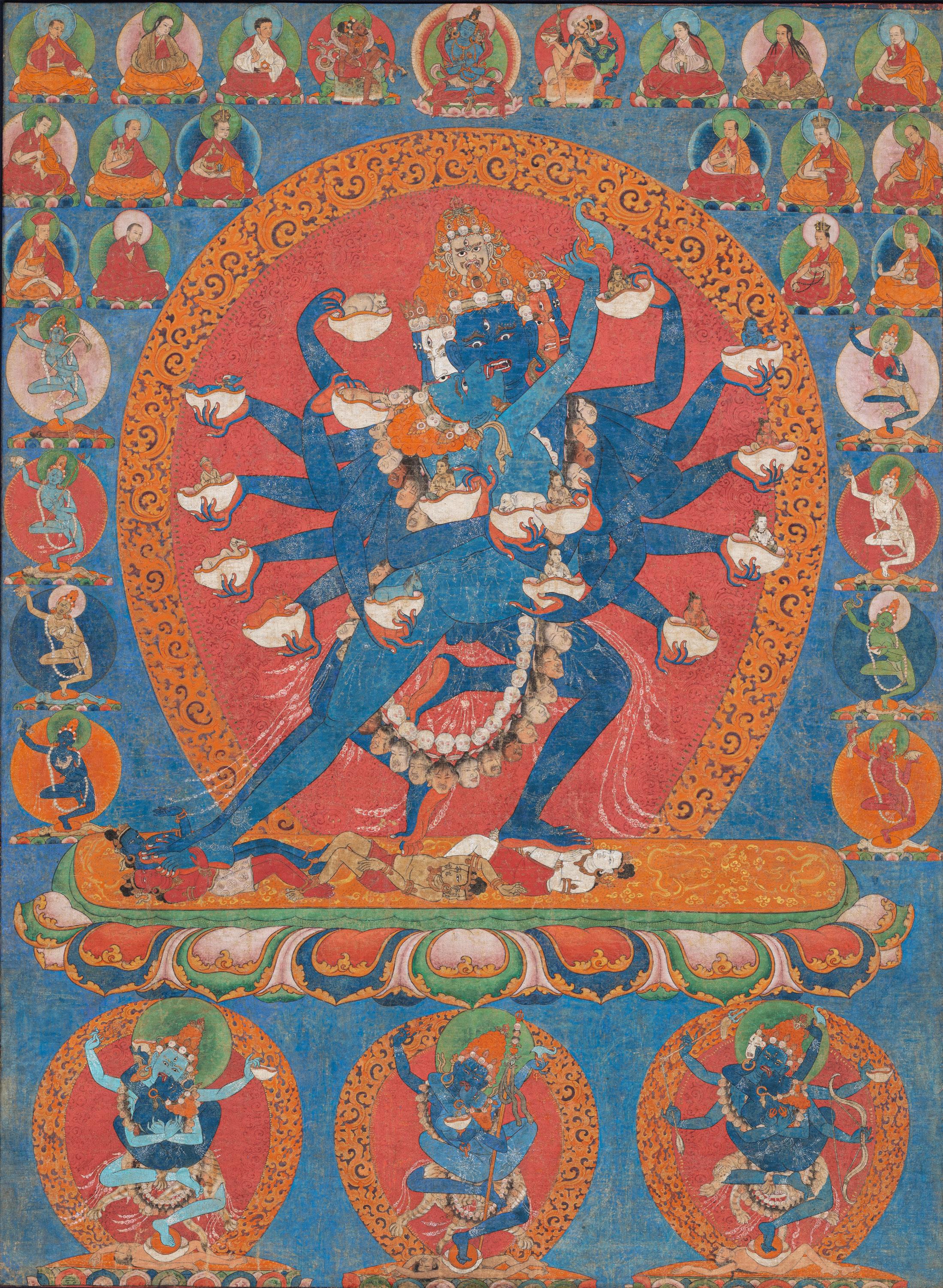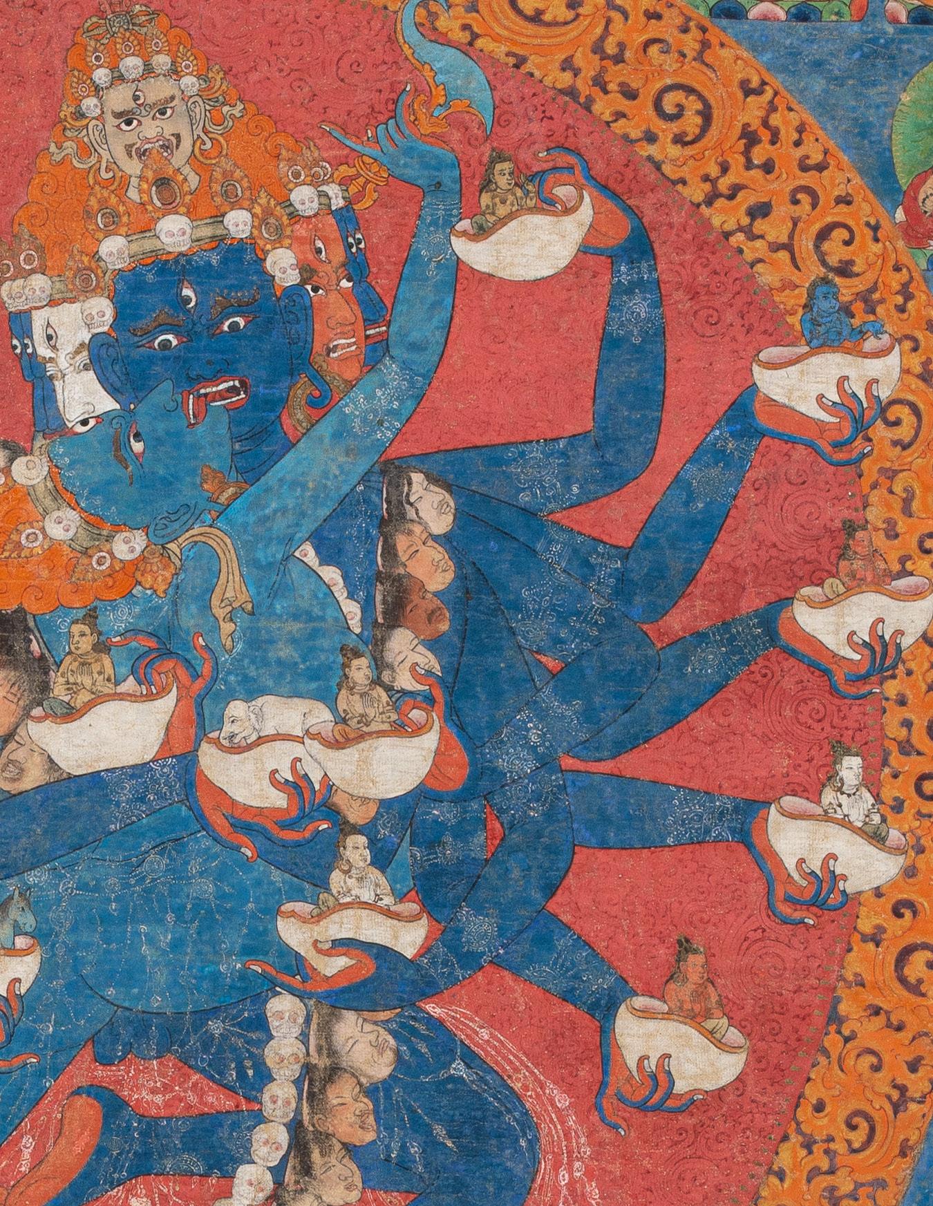 Hevajra, whose name is perhaps best understood in English as “Oh, Vajra!” is the tantric manifestation of the Buddha Akshobhya (the ‘Immovable One’). His name epitomizes the adamantine nature of Vajrayana teachings. Here, the skull-cup-bearing form of tutelary deity Hevajra stands in pratyalidhasana with his consort Nairatmya. The deities of the highest yoga tantra dance atop a double-lotus trampling Vishnu, Indra, Shiva, and Brahma in their stride. The eight-headed, sixteen-armed Hevajra clasps skull cups holding a variety of beings in each hand; an elephant and the earth-goddess Prithvi in his primary hands. His proper-right hands hold a variety of animals while his proper-left hold a retinue of other Hindu deities. While it is often difficult to differentiate the animals when this tantric deity is represented in sculptural form, this painted image depicts each animal distinctly and charmingly.