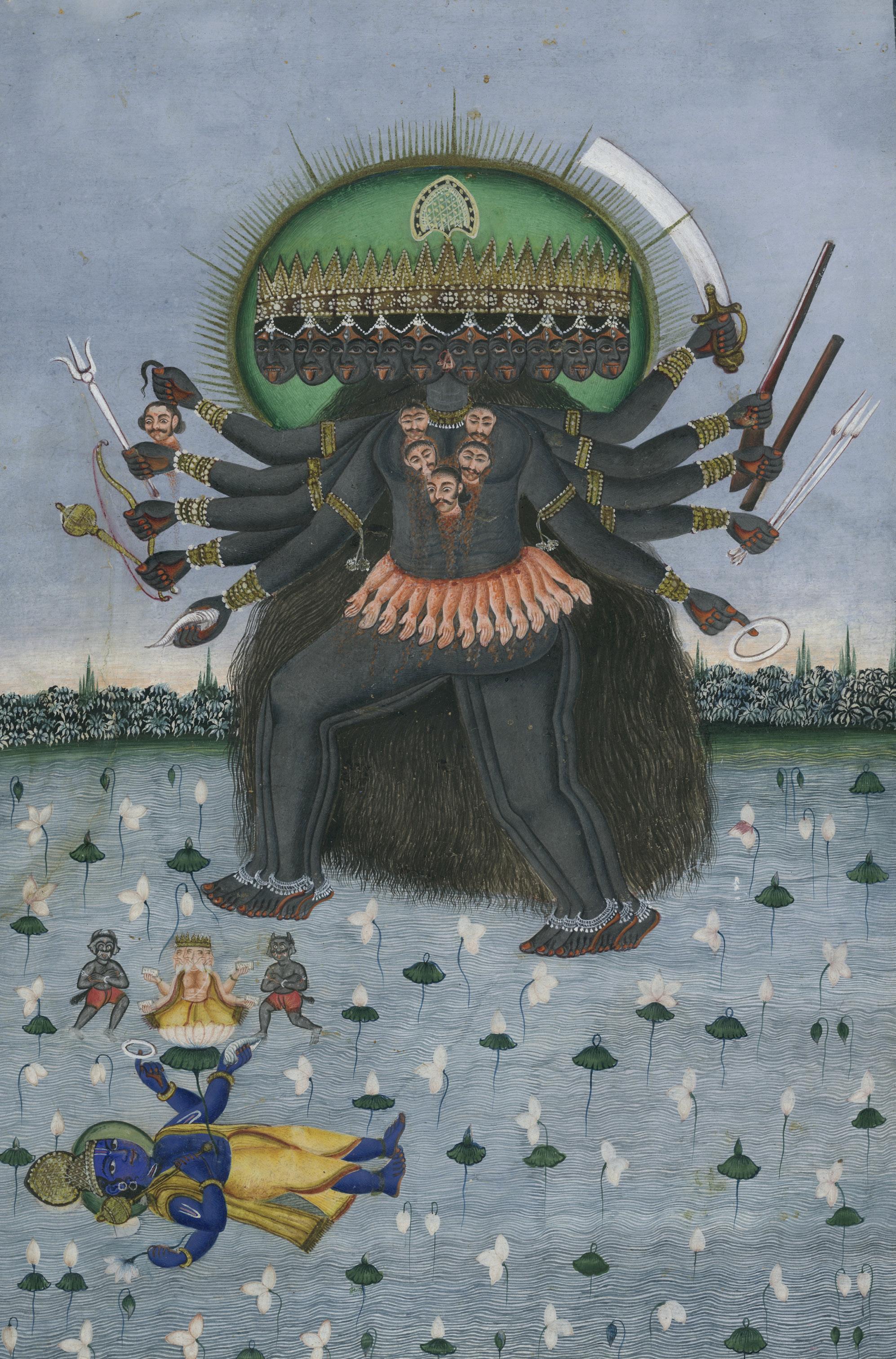 Here, Devi appears in her form as the ten-headed Dasa Mahavidya Mahakali. This form of the goddess is relatively rare in the Indian painting tradition, as she is more commonly portrayed in her one-headed, four-armed image, trampling Shiva. However, the present form shares many iconographic attributes with the more common form. Clad in a garland of severed heads and skirt of dismembered arms, Kali holds items representing the powers of each of the gods in her ten hands: a severed head, trident, bow, mace, conch, sword, and chakra. Her outstretched tongues, bared teeth, long unruly hair, large nimbus and strong stance convey her fierceness. Below, Vishnu reclines, and Brahma emerges from Vishnu’s navel on a lotus, flanked by the demons Madhu and Kaitabha. Fine lines of water and lotuses comprise the cosmic ocean, while a horizon of foliage bisects the background with a pale blue-grey sky above. This partitioning of the background reinforces the hierarchical scale of the painting and thus emphasizes Kali’s great power.