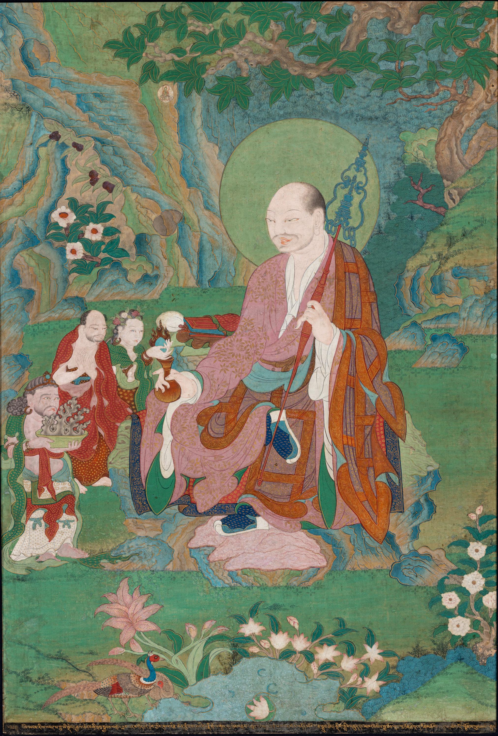 Aged and dignified, the disproportionately large figure at the center of this composition depicts an Indian Buddhist master called Nagasena. He is one of sixteen arhats who have pledged to remain on earth until the future buddha, Maitreya, appears. His life story is similar to that of Siddhartha’s in that he was born into a royal family and gave up his kingdom to become a Buddhist monk. Thereafter he gained esteem through sage advice he offered to King Milinda of secondcentury northwestern India. The vase and mendicant staff Nagasena holds distinguish his character from the other arhats that would accompany him in the larger set to which this painting belongs. He appears in a shirt, multi-colored robes, and boots, as prescribed by artists of the Chinese Tang dynasty who created the first models for such figures.