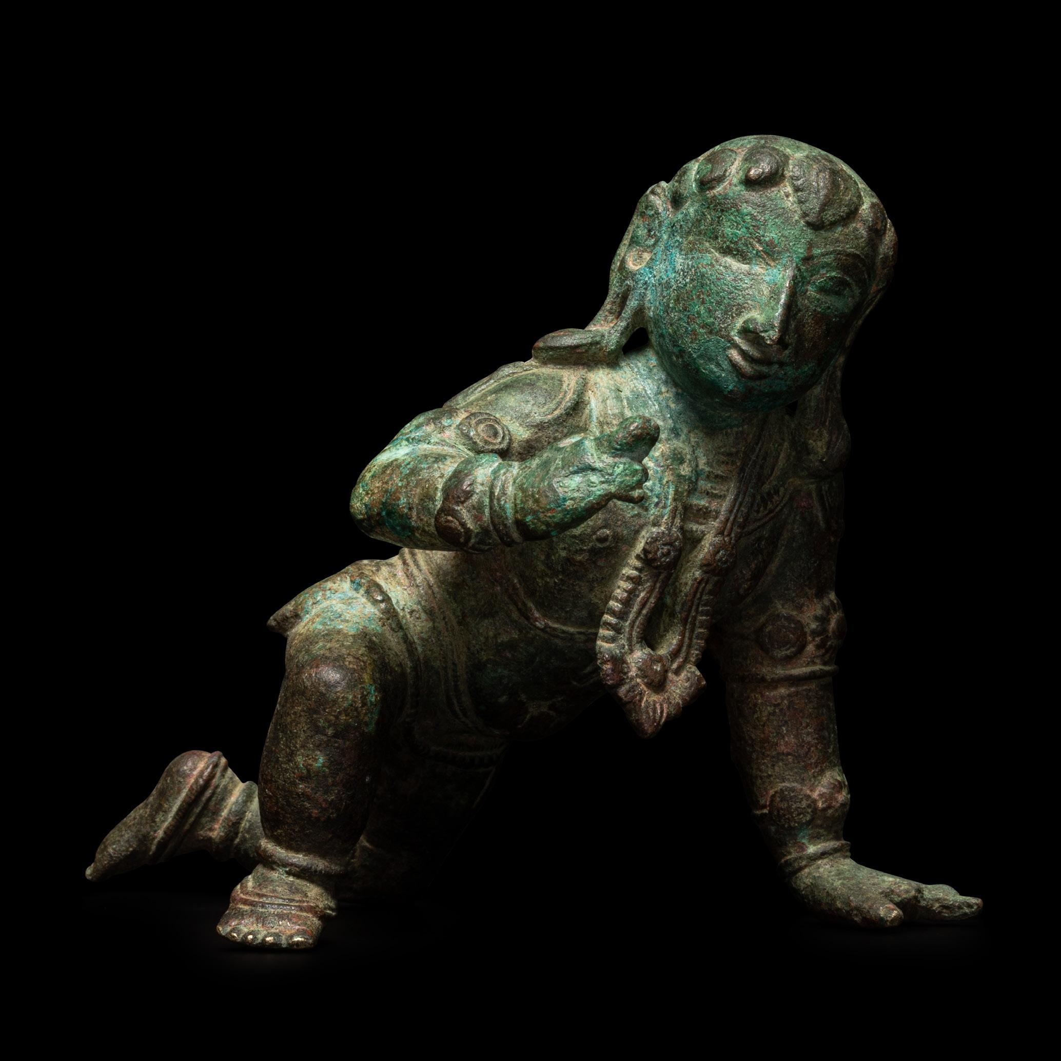 This bronze figure of the charming child Krishna conjures the god’s habit for mischief. In the tenth book of the Bhagavata Purana, Krishna’s foster mother Yasodha ties him to a wooden mortar to keep him from repeatedly trying to steal butter balls, like the one he holds in his hand here. This bronze image captures the endearing butter thief crawling nude (although beneath elaborate jewelry), revealing his well-nourished and youthful body. The present figure wears multilayered necklaces that fit close to the chest, surmounted by a longer necklace with jewels at its center and floral elements at each side, mirroring the central ornaments of his upper arm bands and bracelets. He also wears a harness with a kirtimukha fastening and a charm box. His backside is given equal attention as his front.