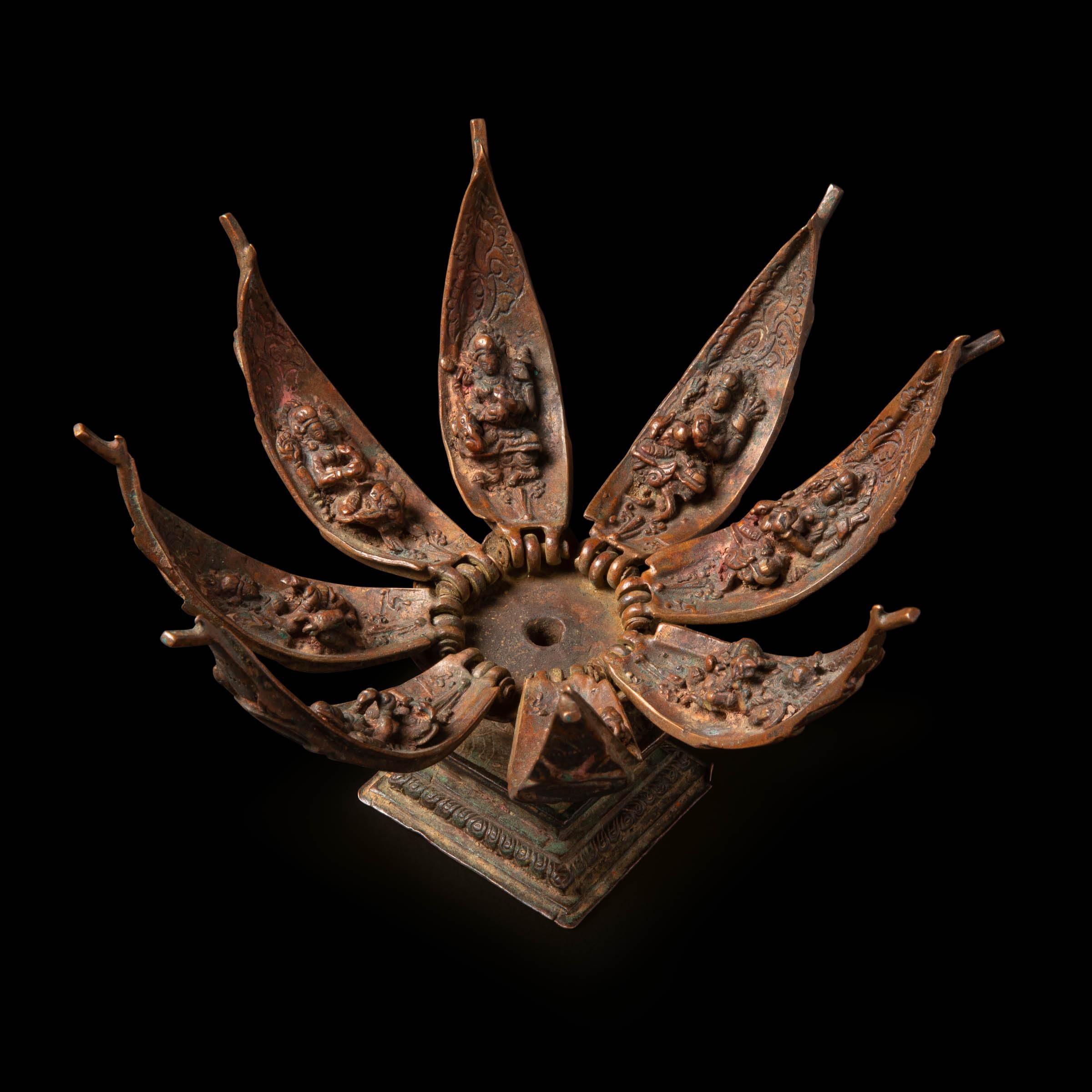 A bronze lotus springs from a stem decorated with foliate sprays at each of the stepped base’s four corners. Each of the eight movable petals is cast to convey several layers of the closed lotus bud. The goddesses within are identified by the implements they carry and their vahanas (mounts), corresponding to those of their male counterparts: Varahi atop a buffalo, Mahalakshmi atop a lion, Maheshvari atop Nandi, Vaishnavi atop Garuda, Indrani atop an elephant, Kumari atop a peacock, Brahmani atop a goose, and Chamunda atop a corpse. The present example bears a striking resemblance to the sixteenth-century Navadurga lotus mandala at the Newark Museum of Art (acc. 90.400).