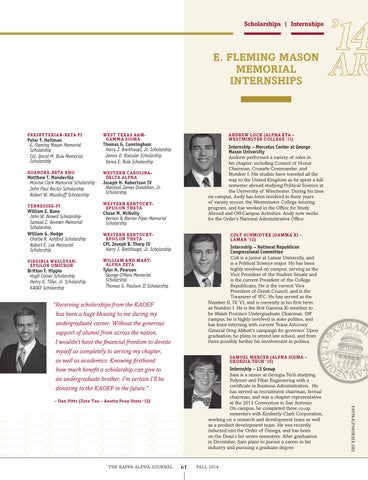 “Receiving scholarships from the KAOEF has been a huge blessing to me during my undergraduate career. Without the generous support of alumni from across the nation, I wouldn't have the financial freedom to devote myself so completely to serving my chapter, as well as academics. Knowing firsthand how much benefit a scholarship can give to an undergraduate brother, I’m certain I’ll be donating to the KAOEF in the future.”
