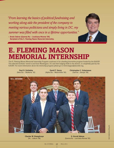 The E. Fleming Mason Memorial Internship Program continues to be a leading innovative program funded by the KAOEF. The selected brothers’ travel to and from Washington, DC and their lodging while in the district, is completely paid by the KAOEF. For more information about the internship program please go to www.kappaalphaorder.org. Paul D. Dollahite (Beta Eta – Oklahoma ’10)