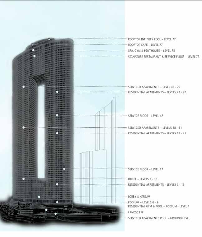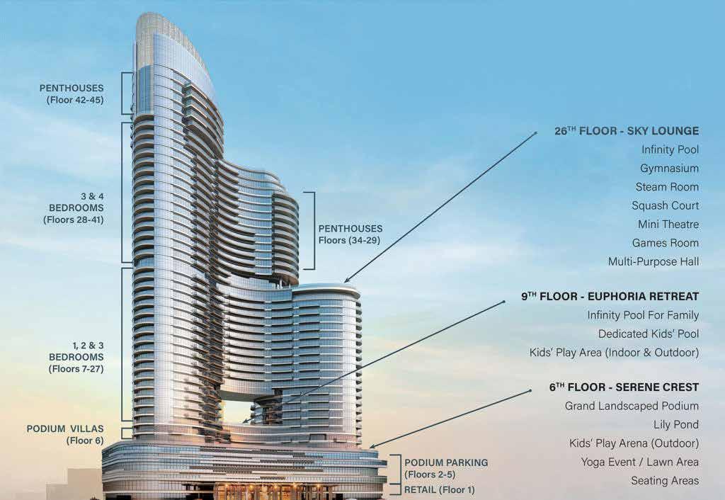 Located on the iconic downtown Dubai, 45 Floors of Luxurious Apartments which consists of 424 apartments like 1-5 bedroom units, exquisite 3-5 bedroom villas with private pools, 4-5 extravagant Penthouses and designed with the landscape charmed podium.