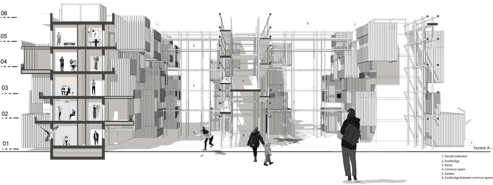 The site is devoid of common space and the configuration of the apartments does not offer several possible uses to the inhabitants. The main idea behind this project is to provide sufficient spaces , while avoiding situations that lead to endless circling . to promote flexibility , multi-functionality and modularity .