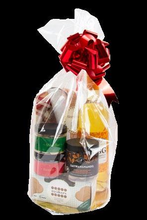 Julkit ihopsatta av noggrannt utvalda produkter av bästa slag. Inslagna i cellofan och med rosett blir det en vacker och välsmakande julklapp!