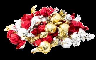 Pralinkulor i olika smaker inslaget i fin folie i olika färger. Röd foliekakao, guld folie - hasselnöt, silver - karamell.