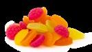 Frukttugg (Gelégodisar med krispit skal i smakerna: jordgubb, apelsin och citron)