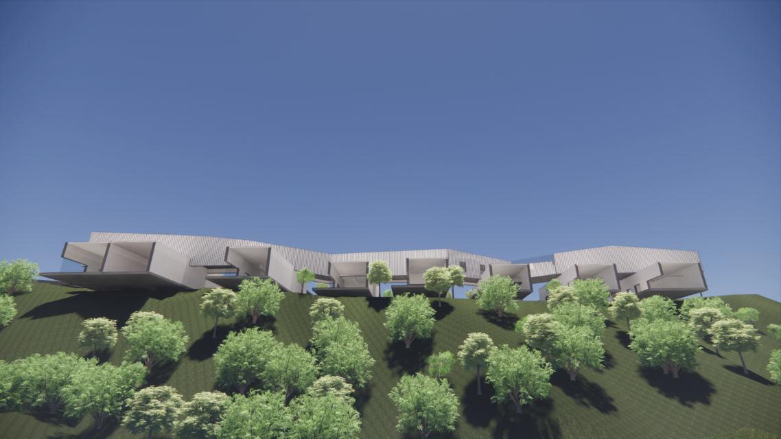 Project took place on a hill in Belgdare with a view to the Aavla mountain. It is a modern design of a white architecture, and a concept of making family housing. The form was maked with two block being places one a top of another, and rotaiting the top one for a specific degry. After repiting the proces along the location the tom parts were merged, forming the line.