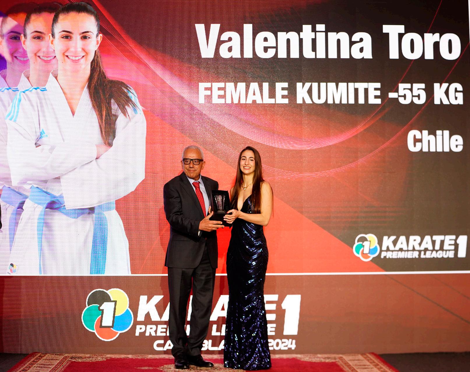 GRAND WINNER FEMALE KUMITE -55 KG: VALENTINA TORO (CHI) KARATE 1 - PREMIER LEAGUE 2024 RESULTS • PARIS (FRANCE): No participation • ANTALYA (TURKIYE): 3rd Position • CAIRO (EGYPT): 1st Position • CASABLANCA (MOROCCO): 1st Position