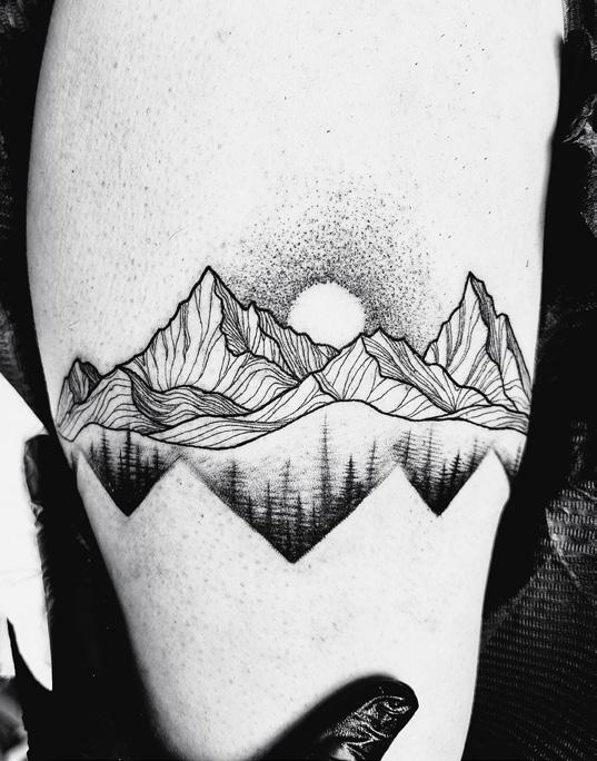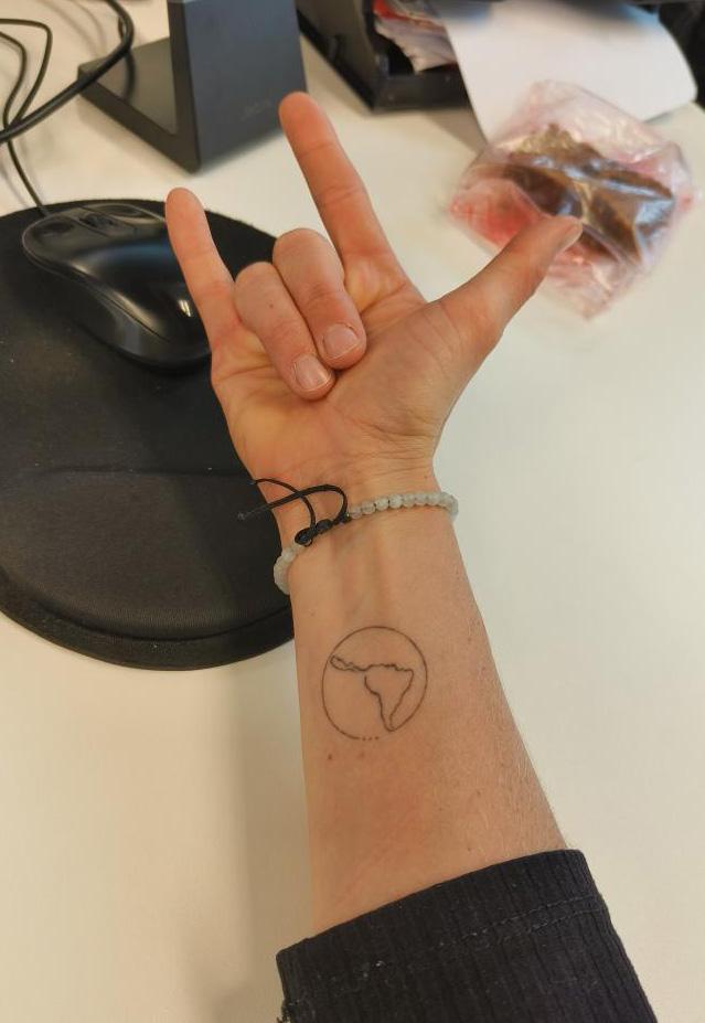 "Mijn allereerste tattoo is Mount Fitz Roy, een majestueuze berg in Patagonië. En waar liet ik die zetten? In Ushuaia, het meest zuidelijke dorp ter wereld, bekend als El fin del mundo. Het perfecte einde van een groepsreis door Patagonië. Daiana, de liefste tattoo-artiest ooit, vereeuwigde dit prachtige ontwerp voor me. Mijn tattoo symboliseert veel. Als reisbegeleider is mijn passie voor reizen en onderweg zijn onmiskenbaar. 't Is een ode aan mijmeren over het leven en terugkeren naar de natuur. Deze tattoo herinnert me eraan dat de beste weg altijd onderweg is, vooral als je bergen beklimt. Soms is het pad lang en moeilijk, maar stapje voor stapje bereik je de top. Het leven heeft zijn pieken en dalen, net zoals een bergkam. En als fervent klimmer bewonder ik deze berg die al zoveel klimgeschiedenis heeft geschreven."