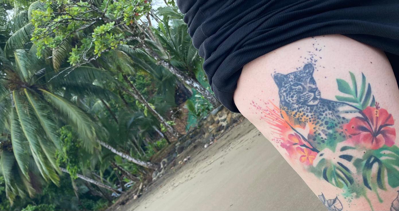 "Deze tattoo heb ik laten zetten bij een Oostenrijkse artieste, die mijn liefde voor de jungle perfect heeft kunnen weergeven! Kamperen in het hoge noorden is niets voor mij, maar op avontuur door de jungle om onder andere poema’s te spotten? Sí, claro! Costa Rica en Guadaloupe zijn alvast twee aanraders voor jungle-avonturen!"